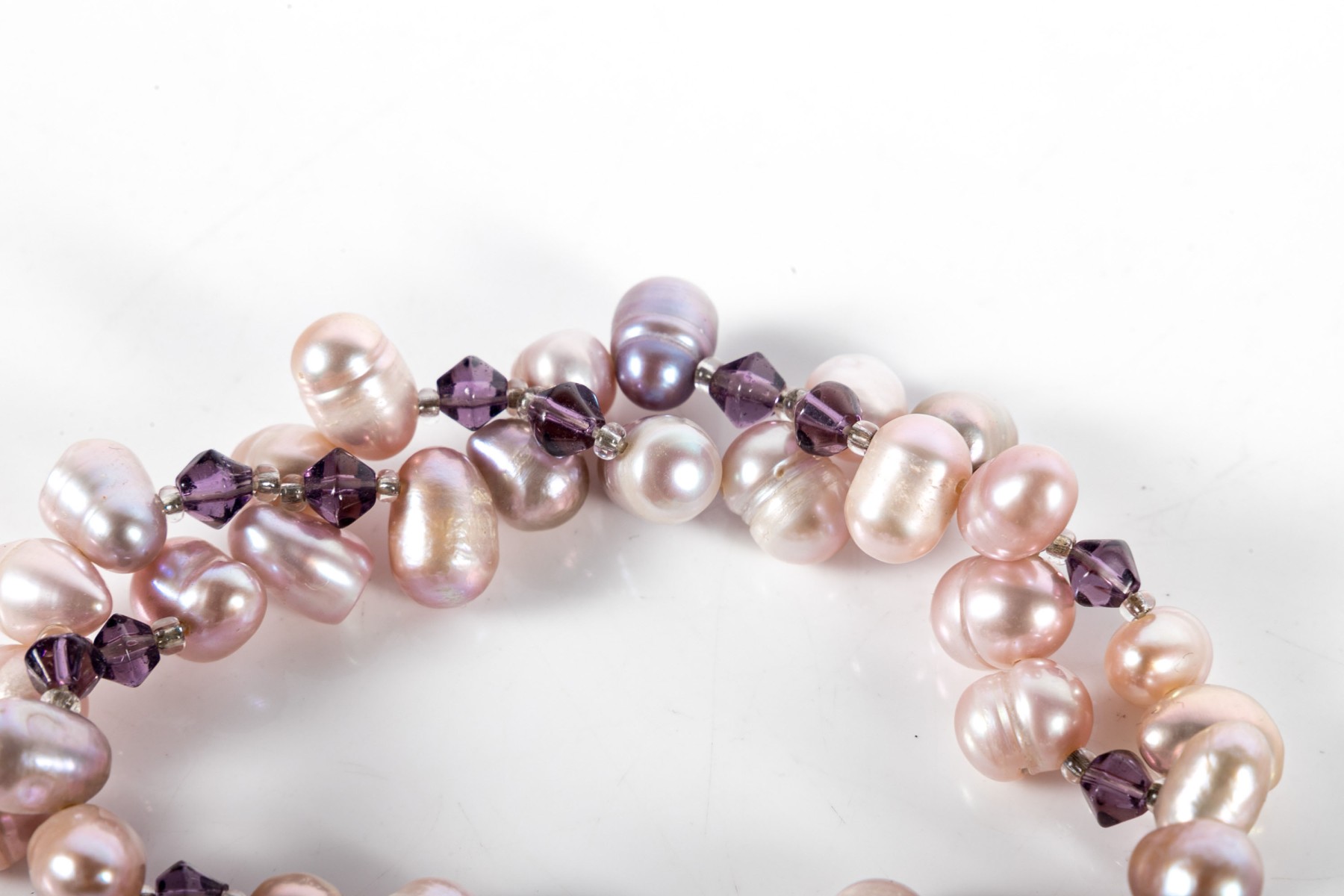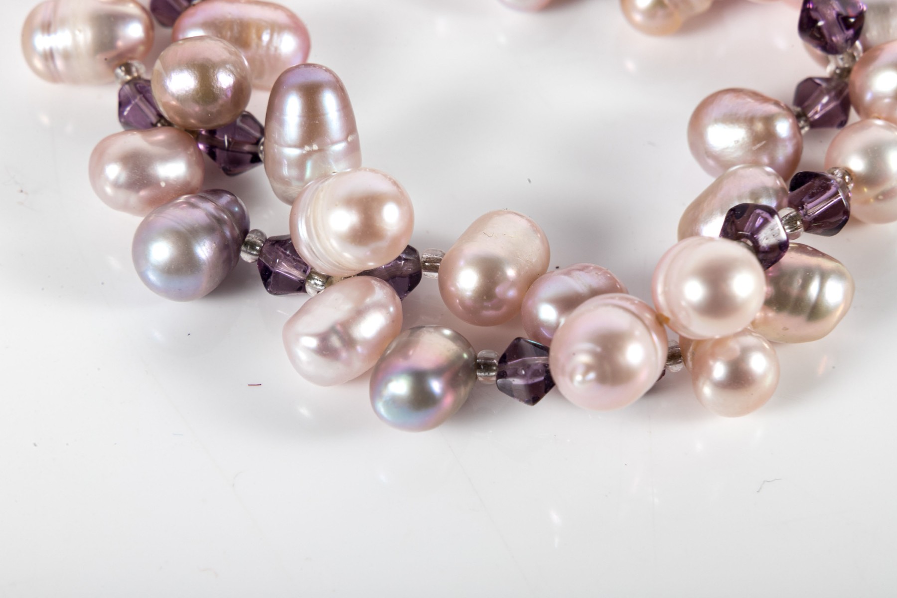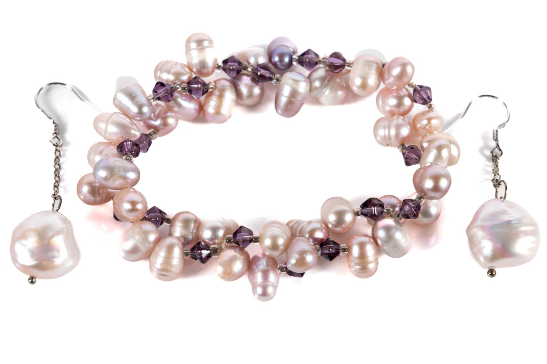 A lovely stretchy cord bracelet of cultured ringed oval pearls in pale pink, mauve, and steely gray, alternating between purple beads. Accompanied by a pair of dangle earrings with large, organically shaped pink pearls.