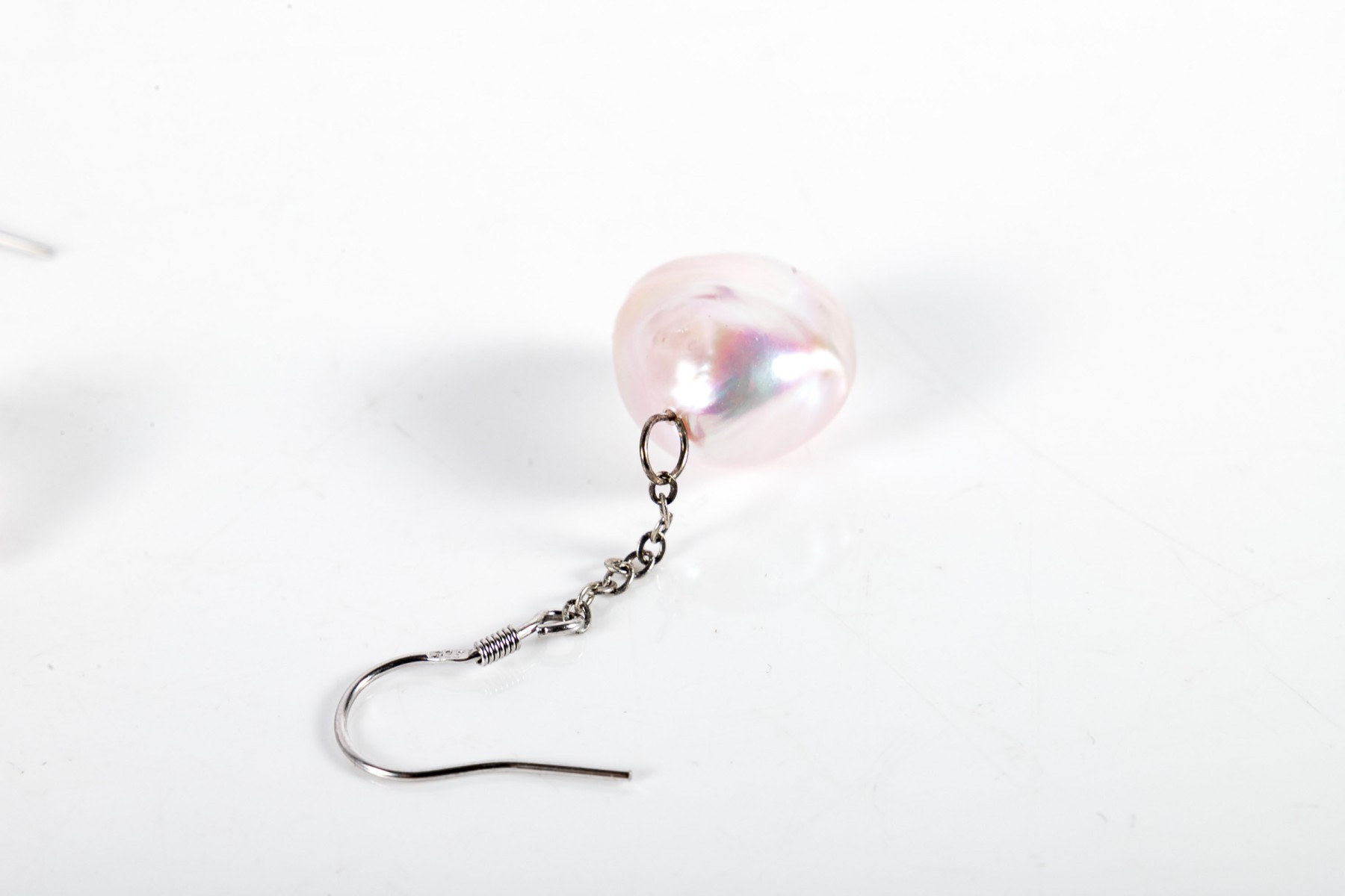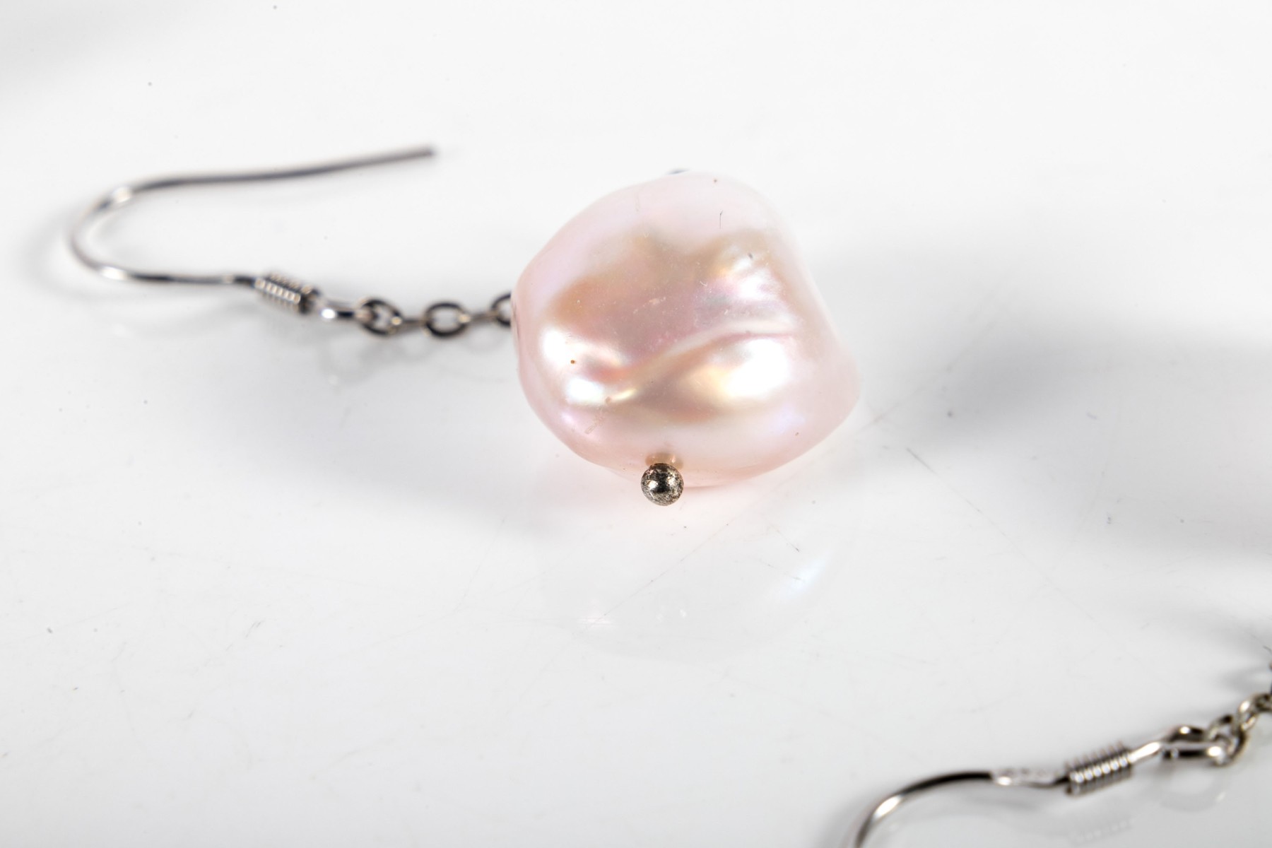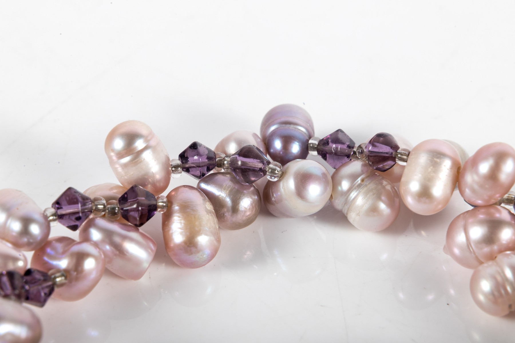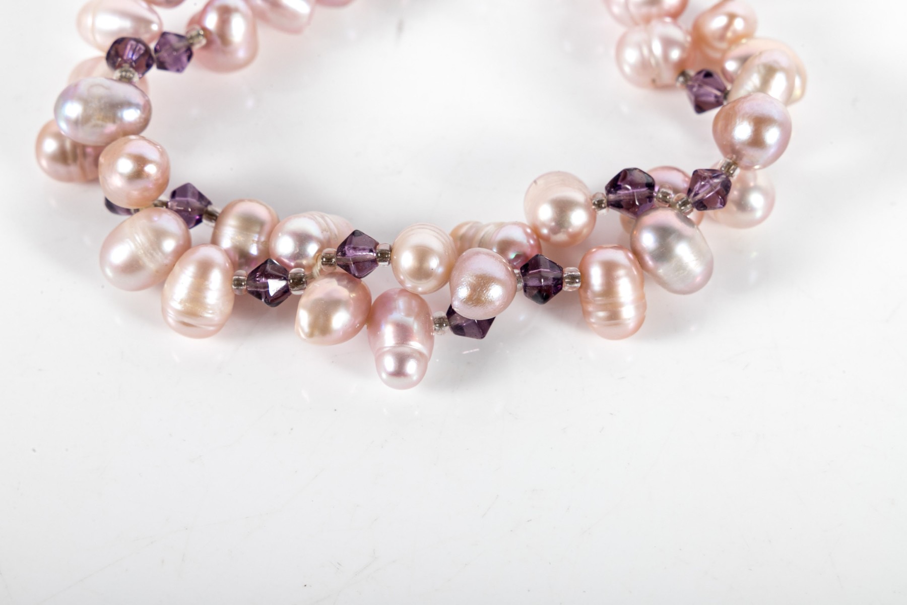 A lovely stretchy cord bracelet of cultured ringed oval pearls in pale pink, mauve, and steely gray, alternating between purple beads. Accompanied by a pair of dangle earrings with large, organically shaped pink pearls.