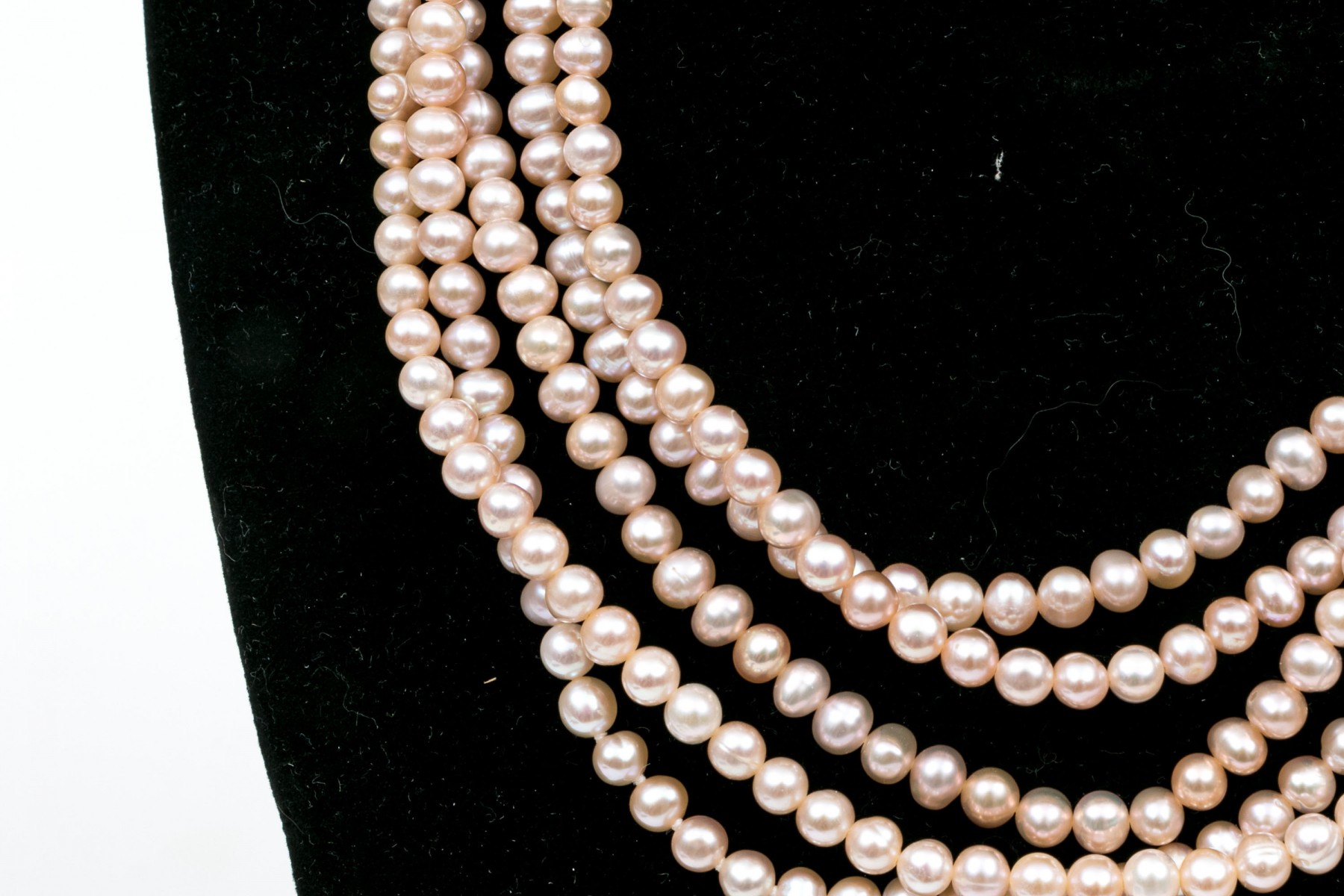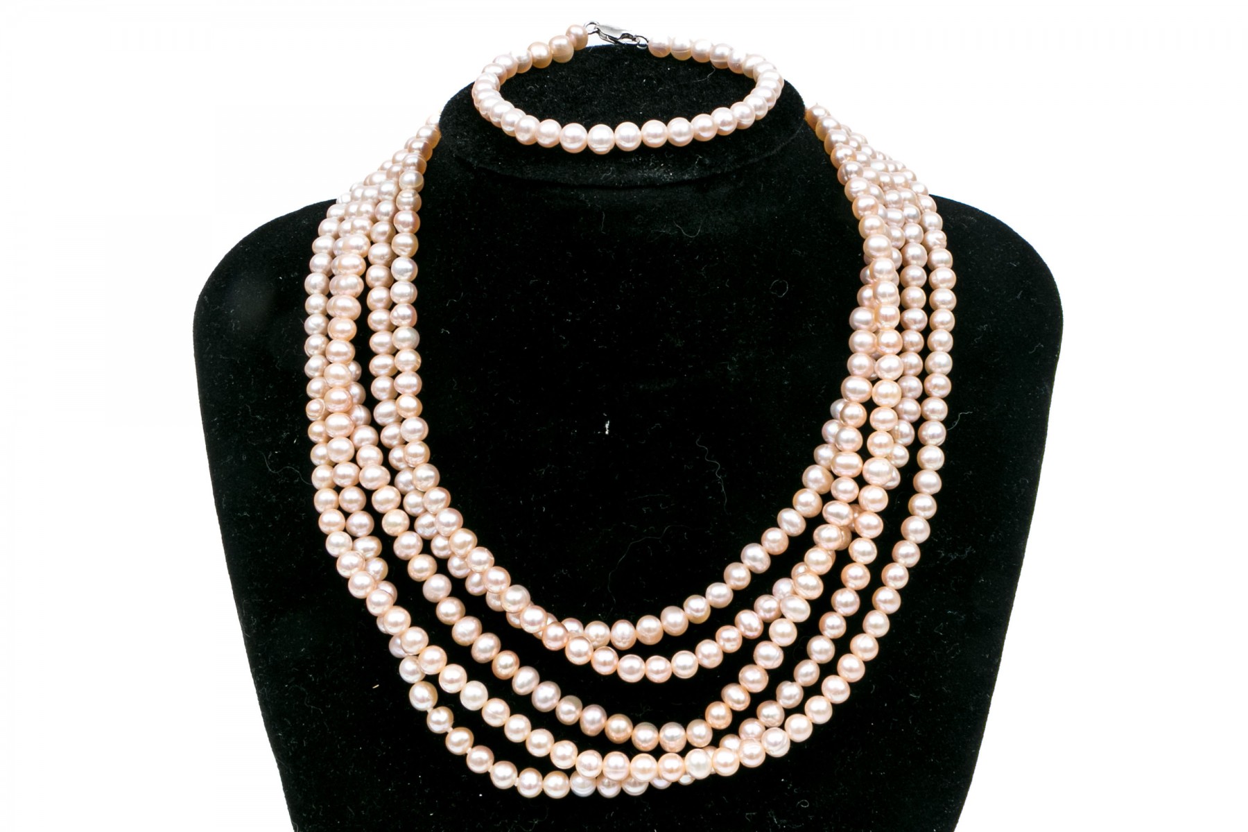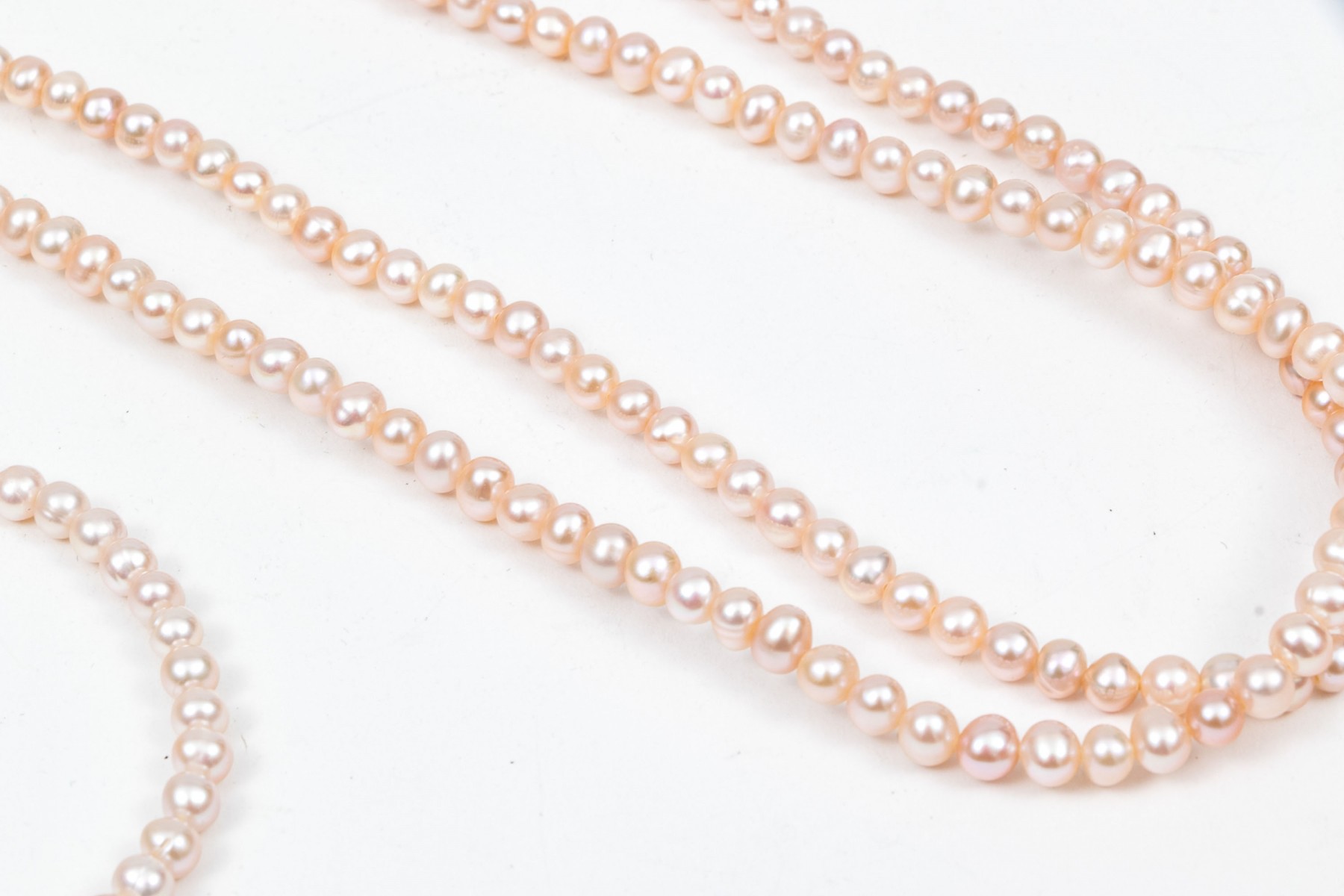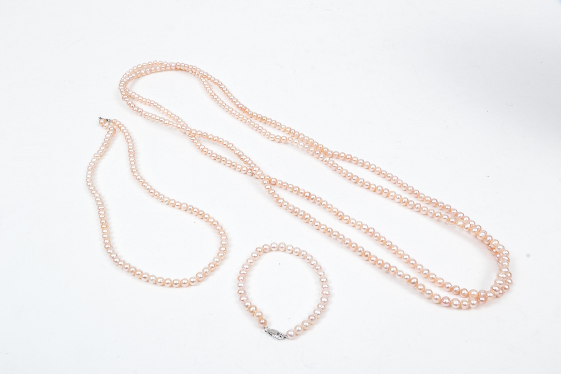 Pale pink cultured fresh water pearl necklaces and bracelet set. Slight pink pearls, averaging 6mm, are strung over two necklaces and one bracelet. The bracelet and one necklace secure with sterling silver lobster claw clasps and the second 62" L necklace is an eternity strand.