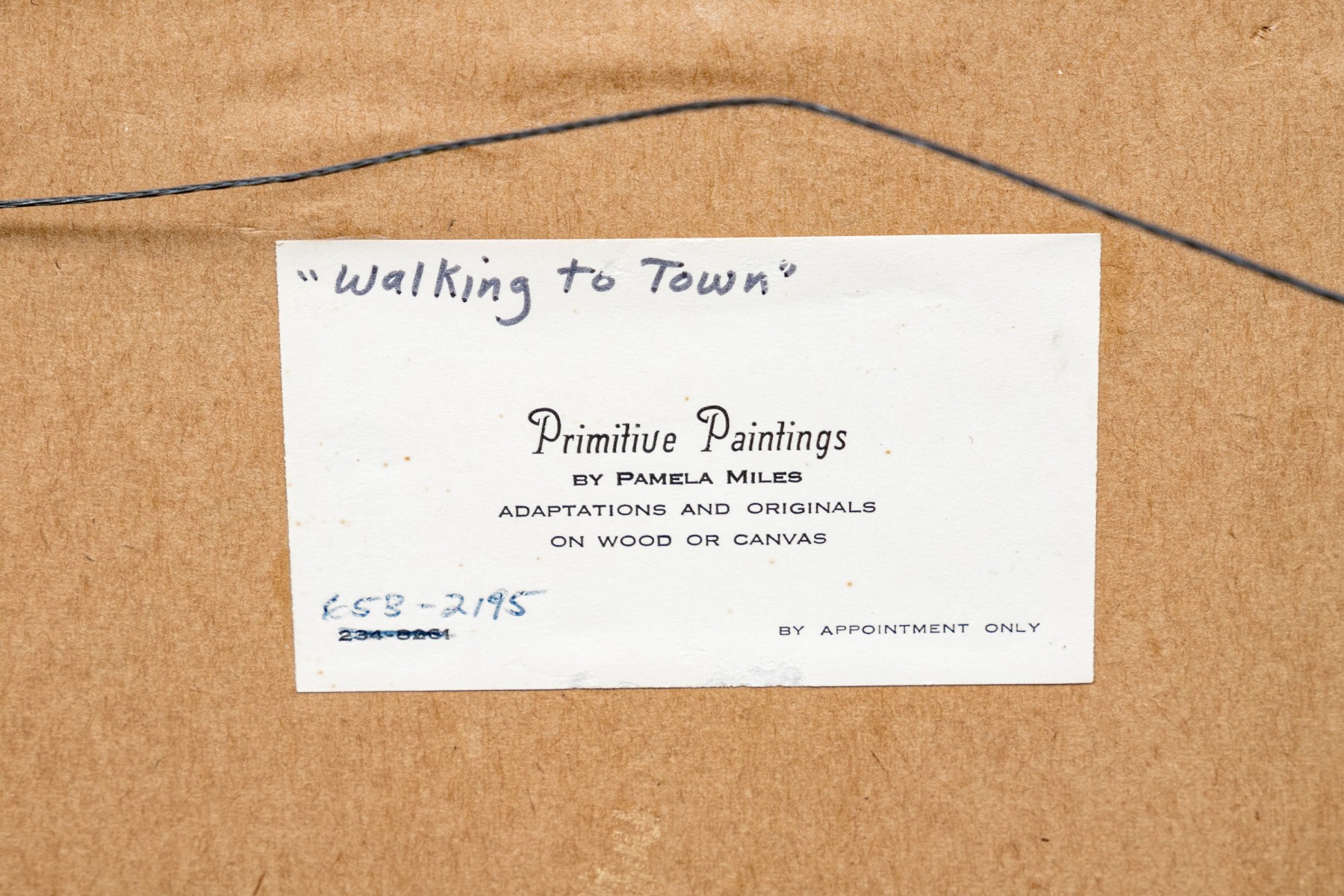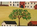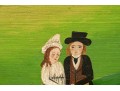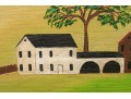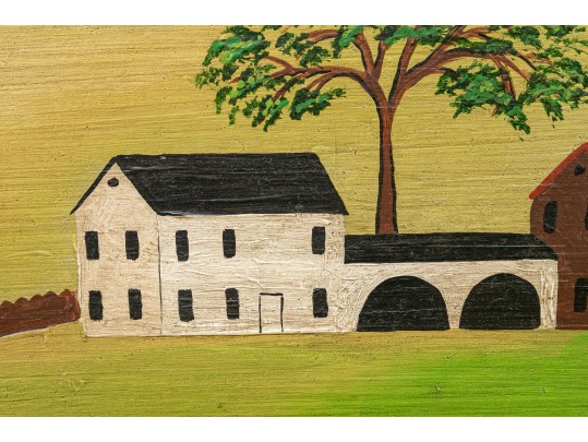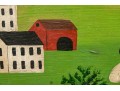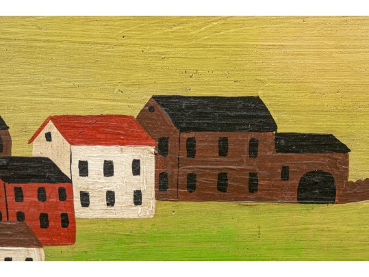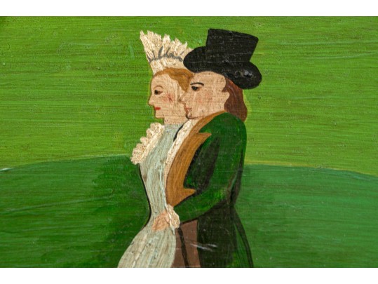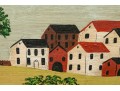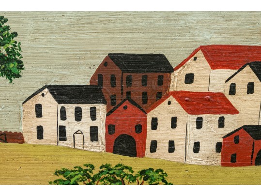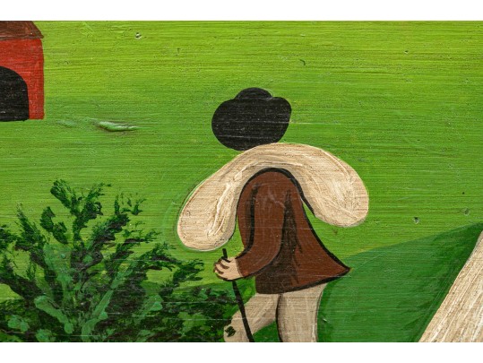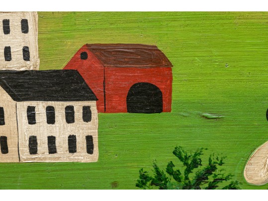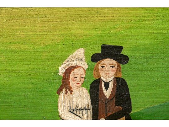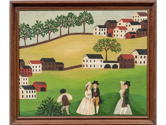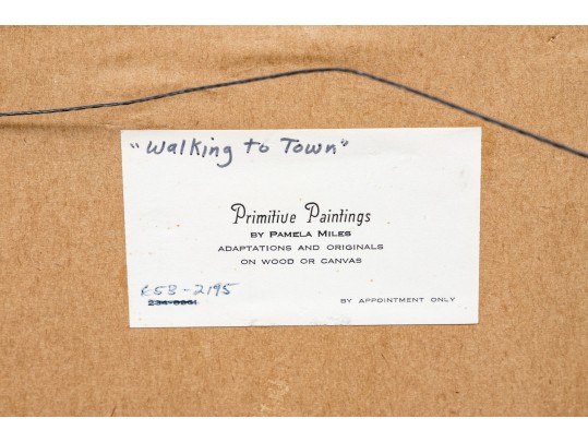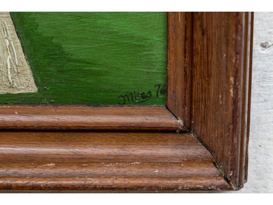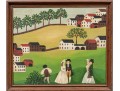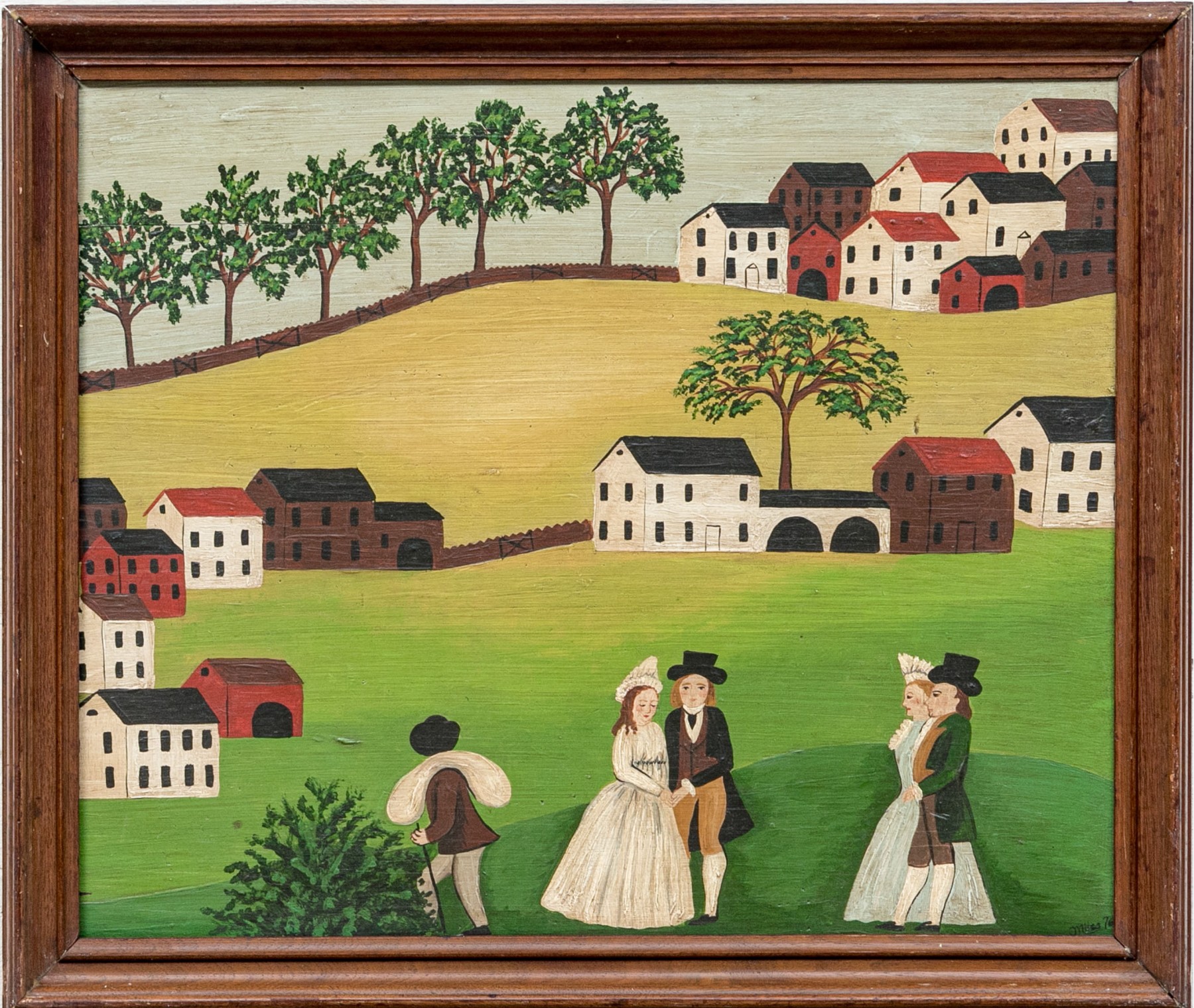 Signed and dated 76 lower right, label on verso with title. A classic Miles naive landscape painting, here featuring couples walking in a field near the village with colonial houses. Presented in a wood frame.