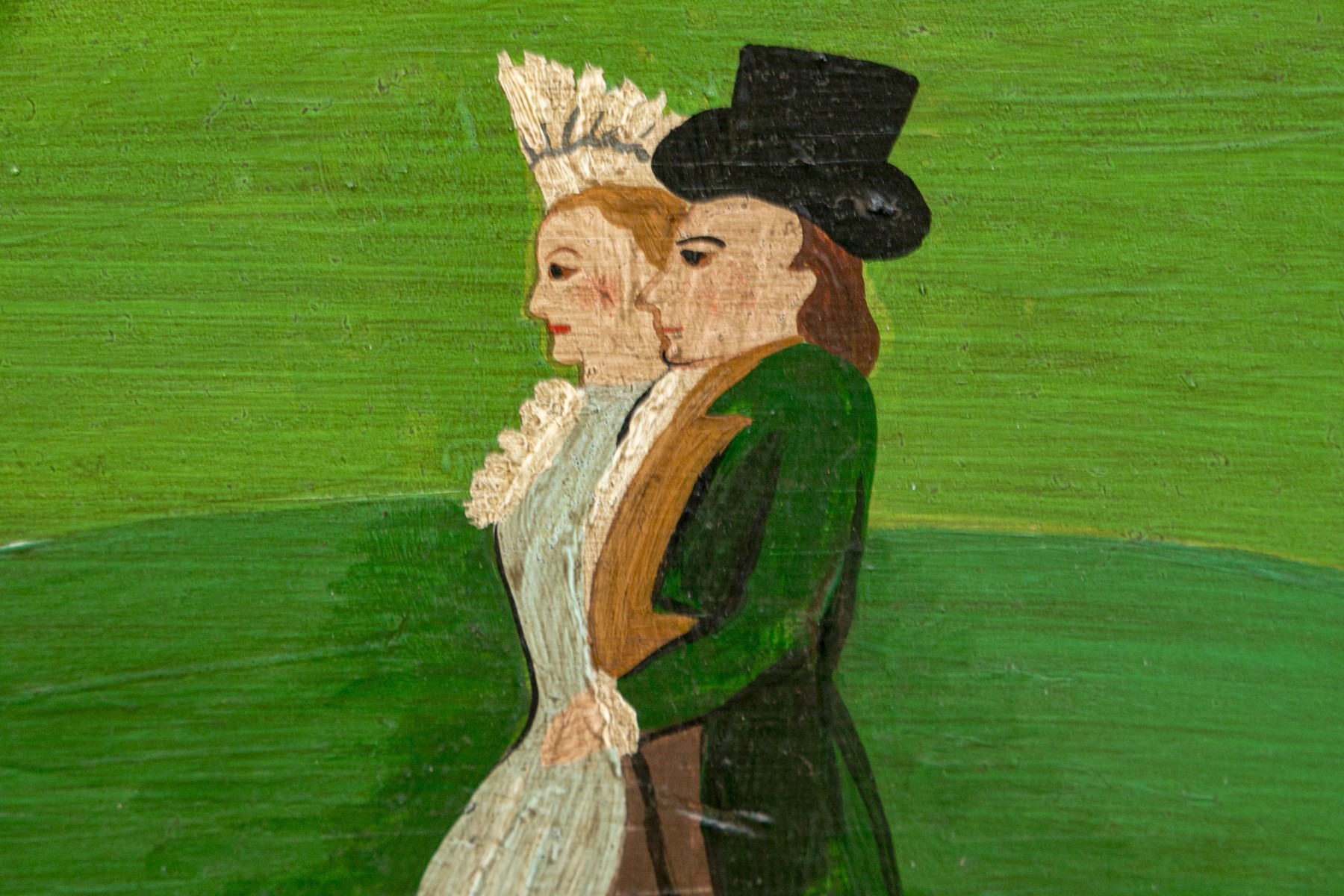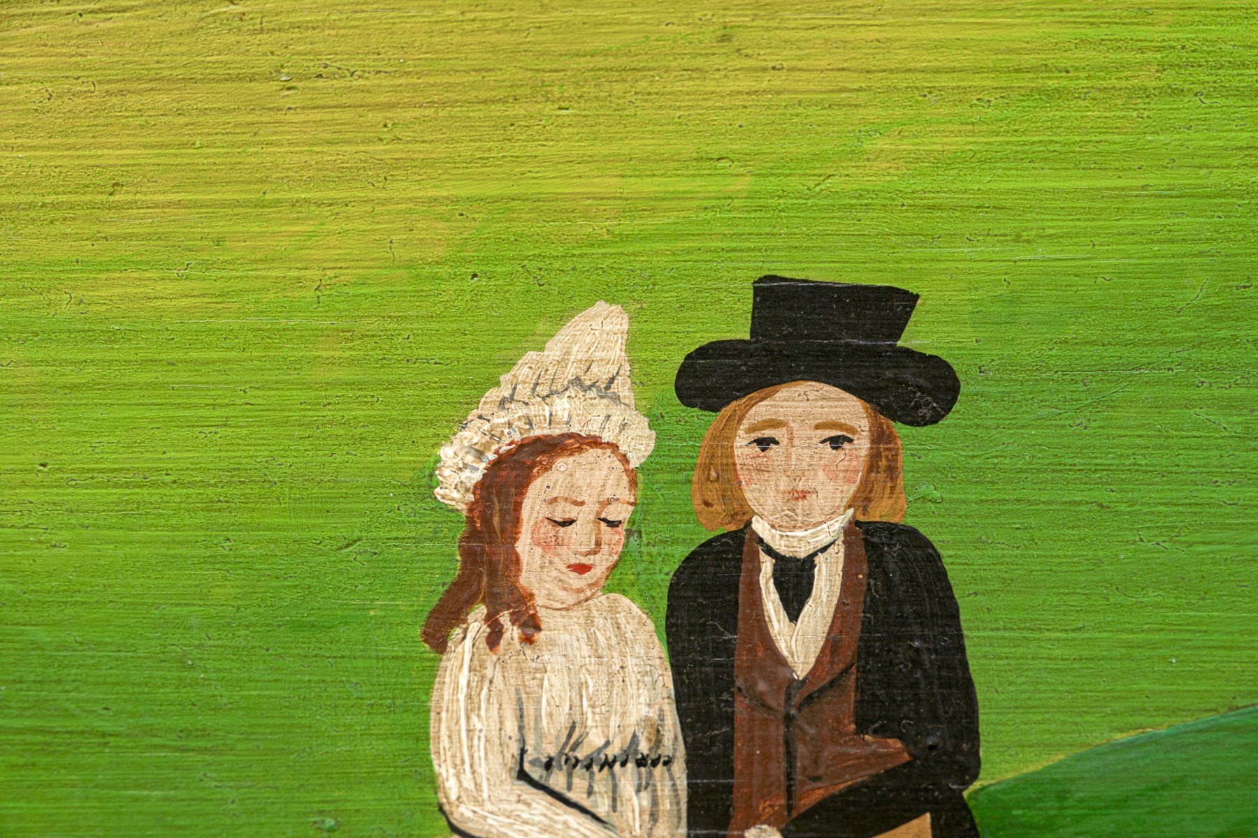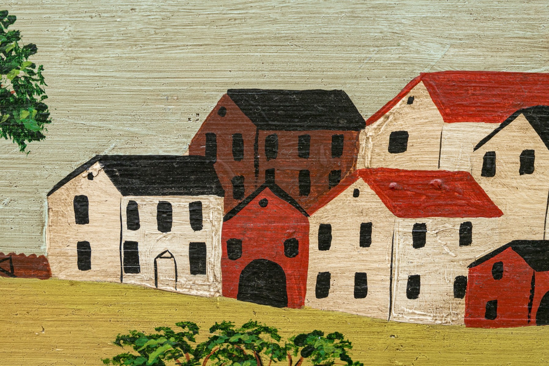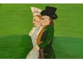 Signed and dated 76 lower right, label on verso with title. A classic Miles naive landscape painting, here featuring couples walking in a field near the village with colonial houses. Presented in a wood frame.