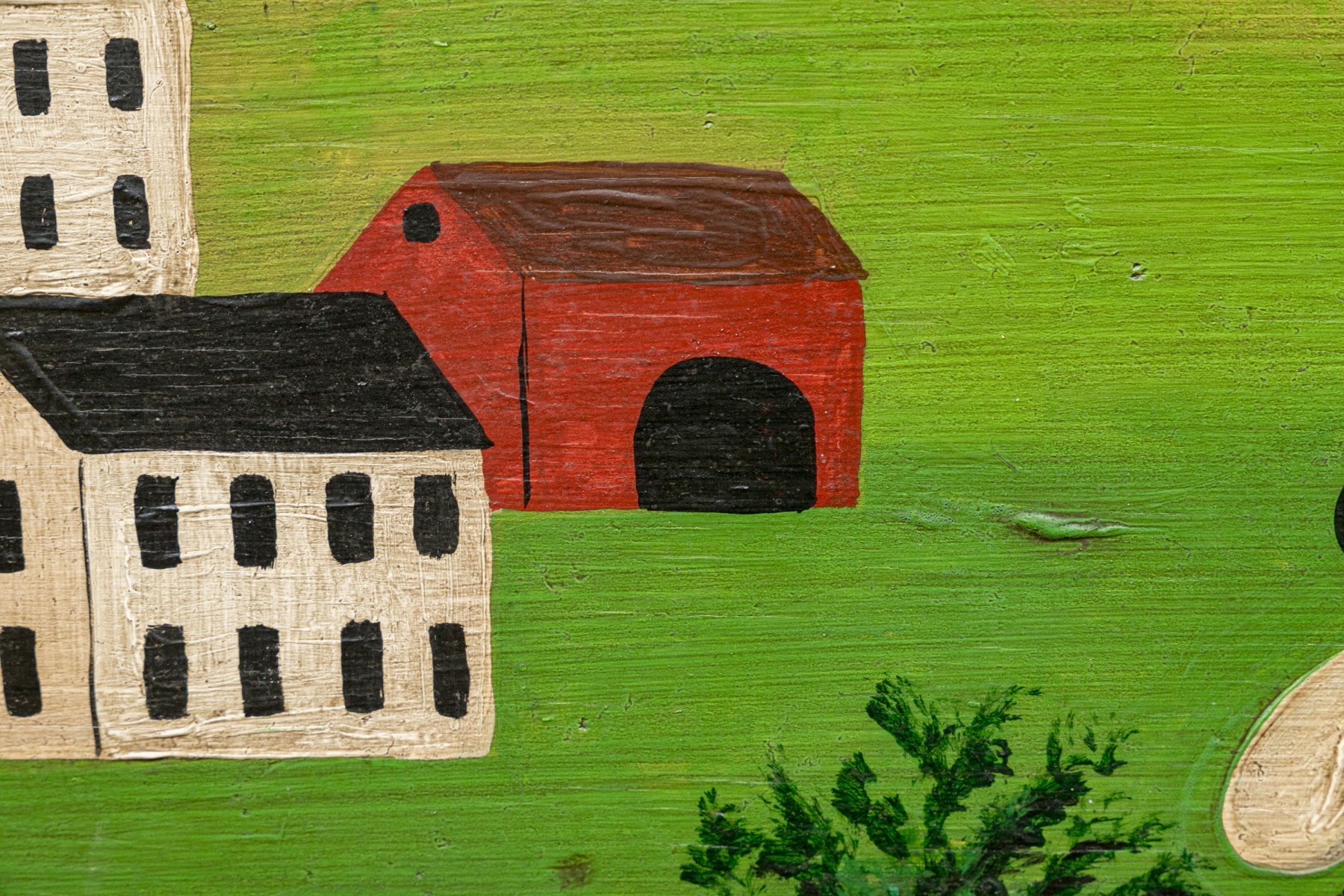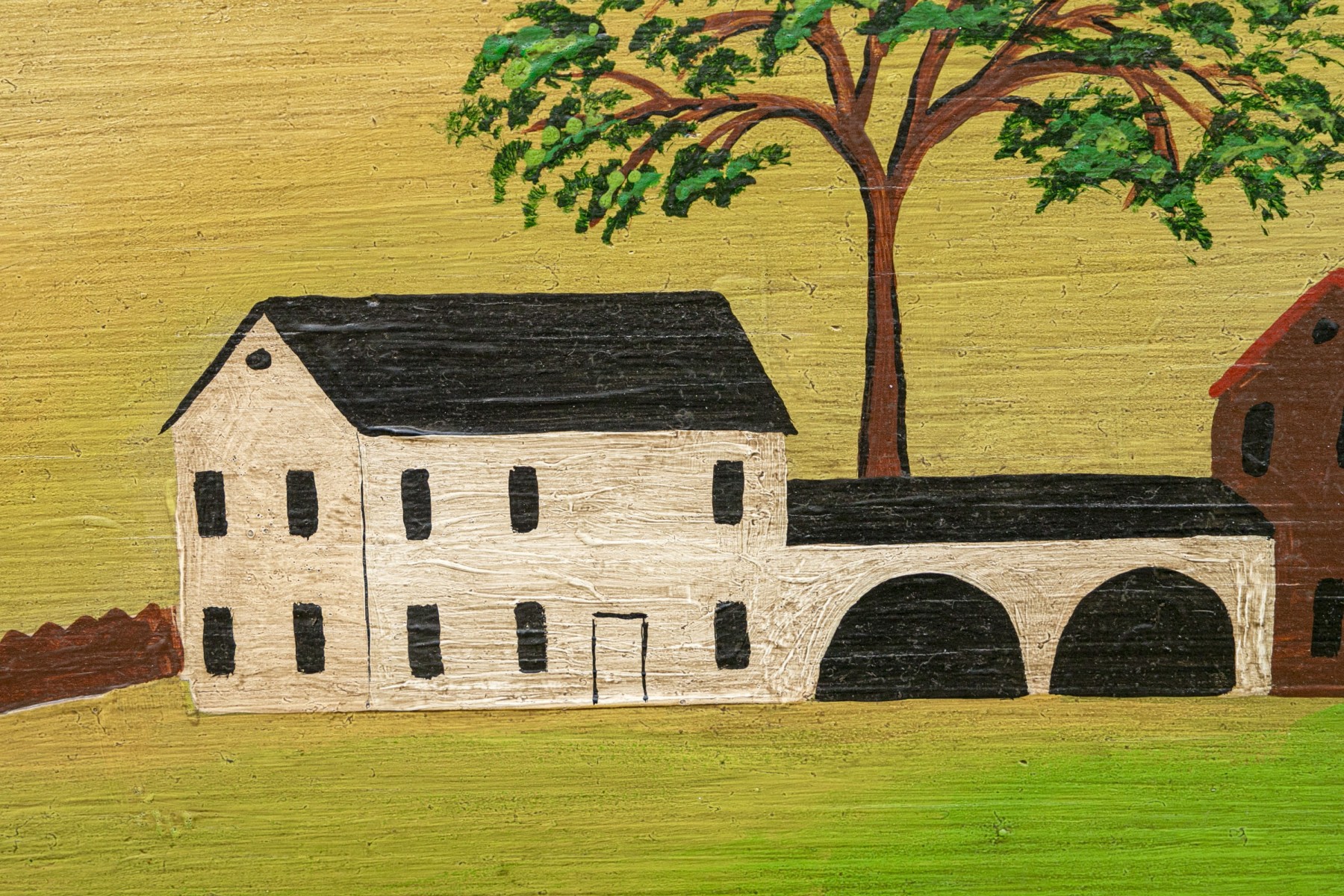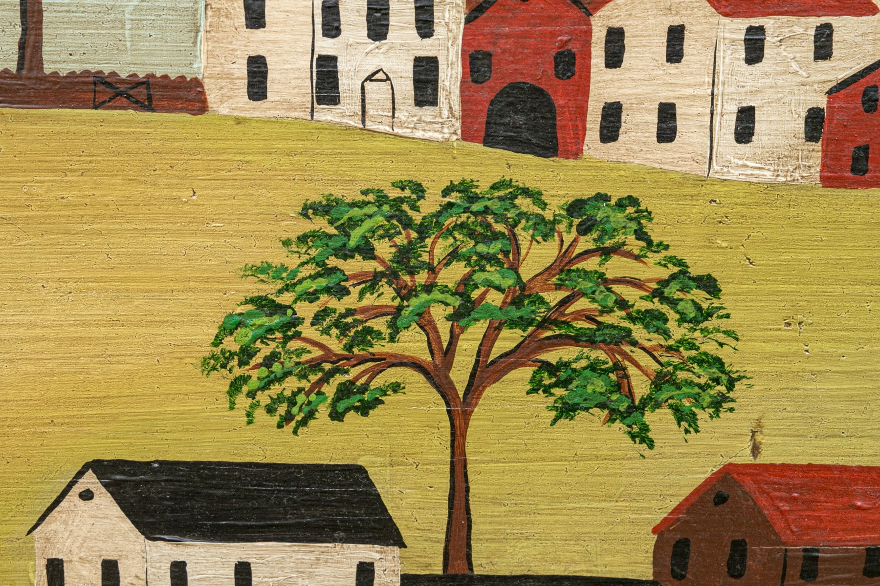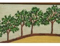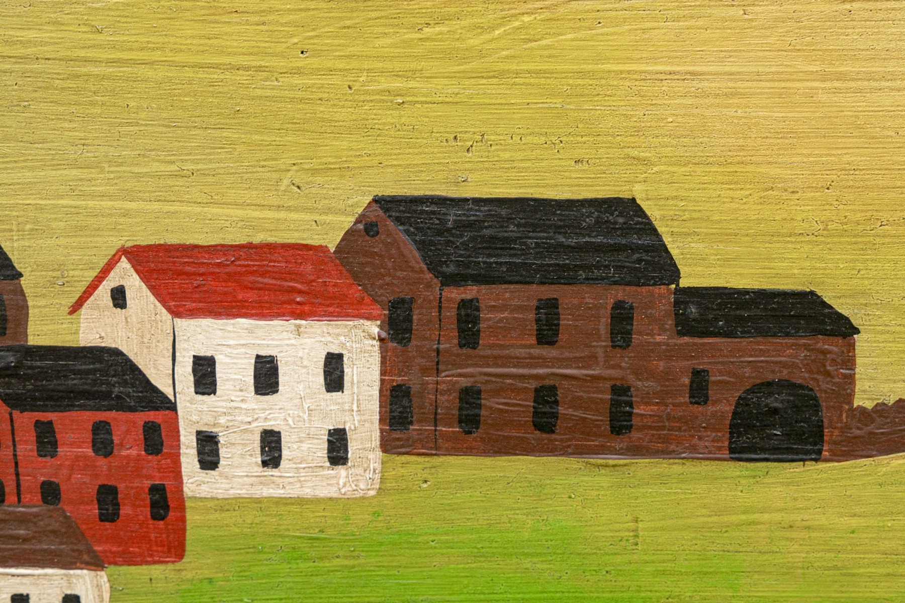Signed and dated 76 lower right, label on verso with title. A classic Miles naive landscape painting, here featuring couples walking in a field near the village with colonial houses. Presented in a wood frame.