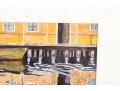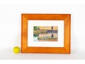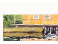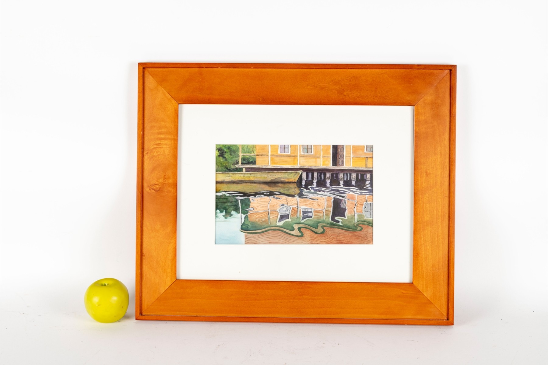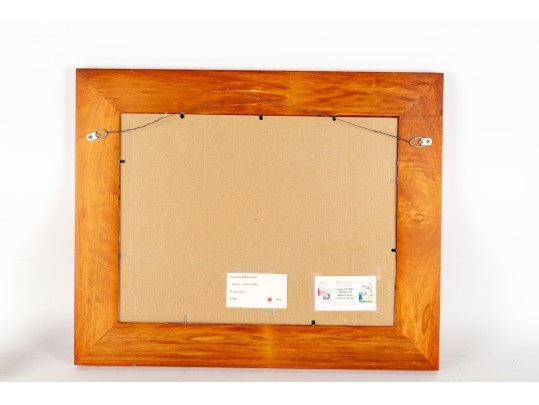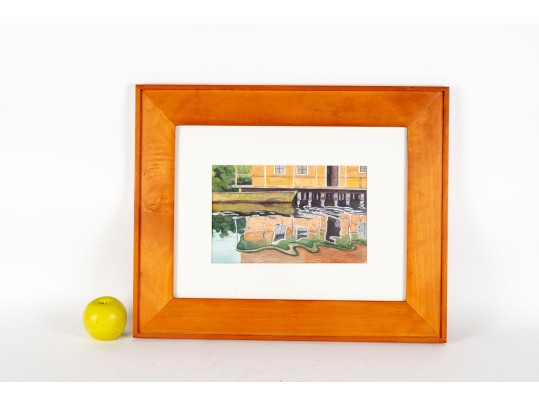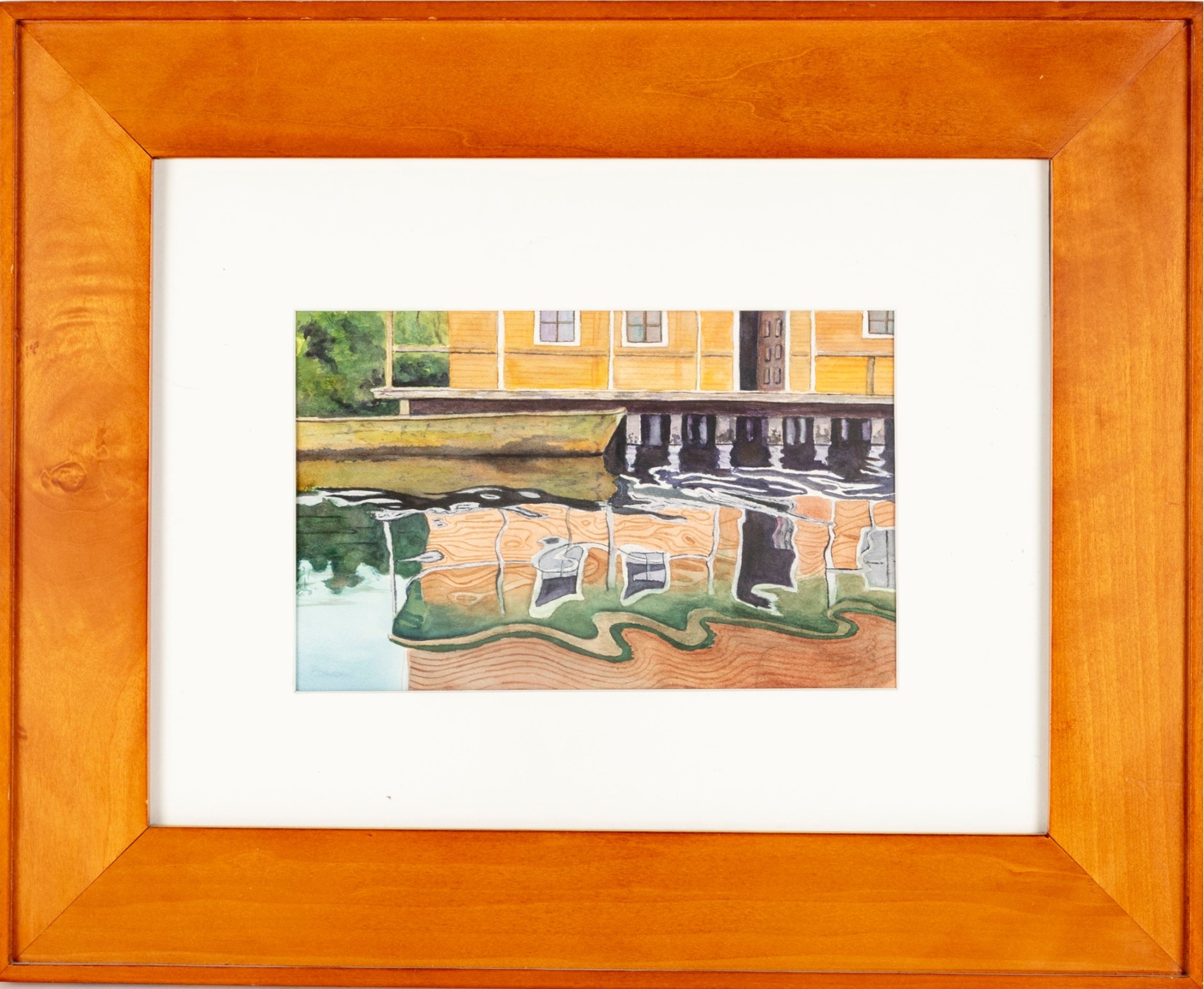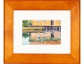 A vibrant watercolor print titled Panama Reflections by Anna Lohse, capturing the playful distortion of a yellow waterfront building reflected in still water. The artwork is displayed in a wood frame, faced with glass.