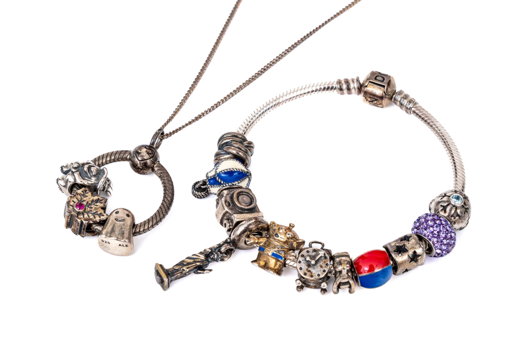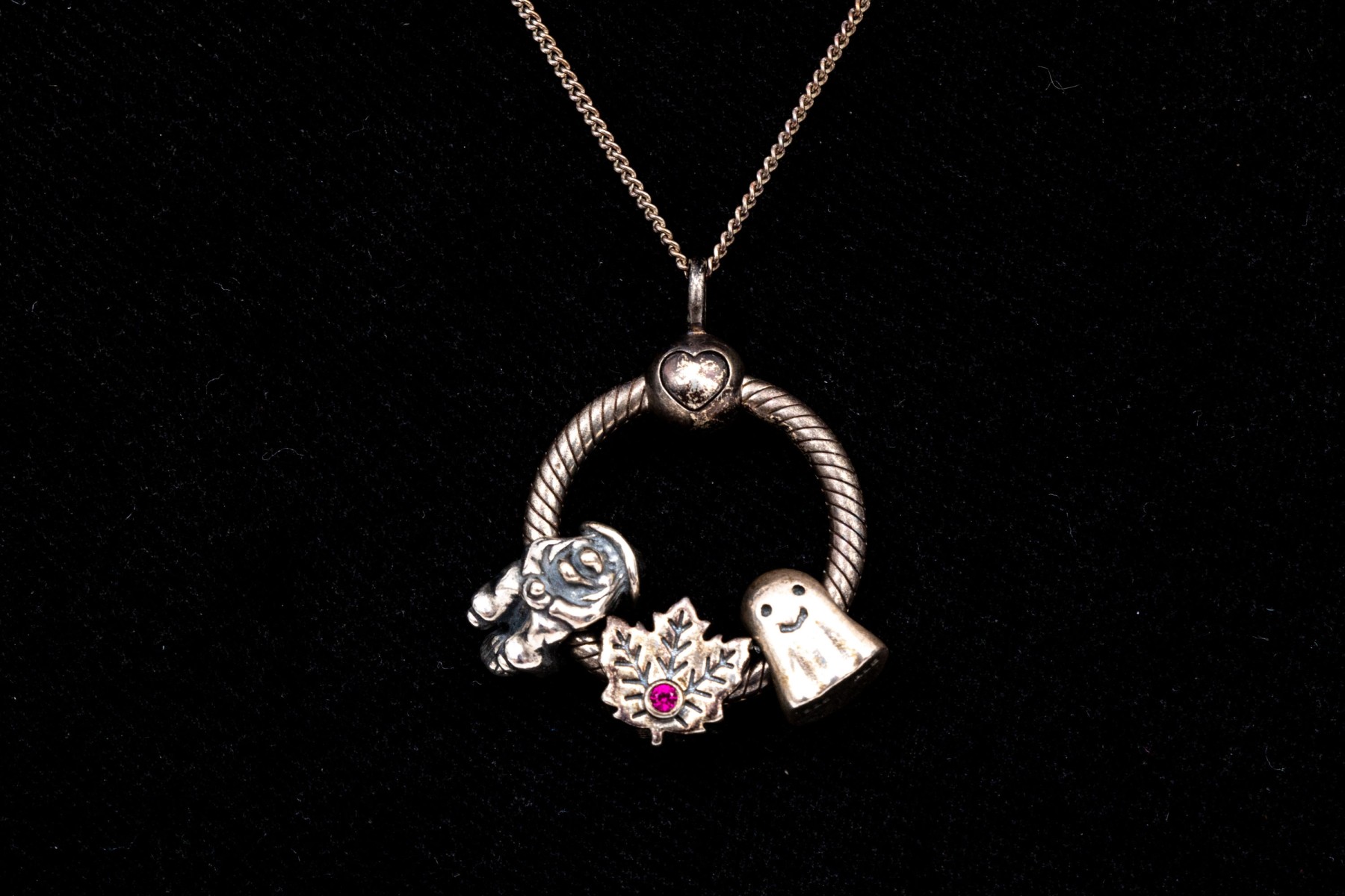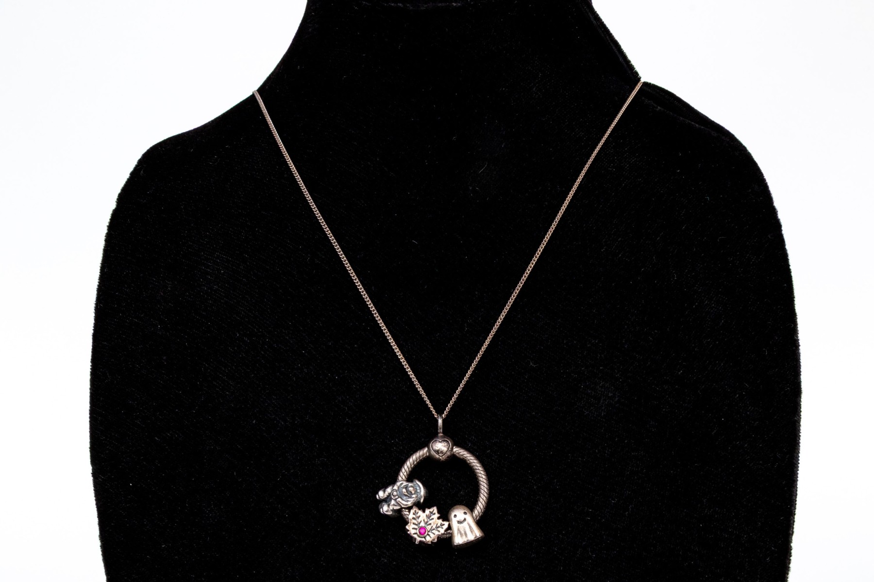 Pandora sterling silver charm bracelet and Pandora sterling Halloween/fall themed charm necklace. This bracelet features and assortment of figural sterling silver forms, including the rare snowflake charm, displayed on a sterling silver Pandora bracelet. The necklace features two Halloween motif charms, and a rare Canadian maple leaf sterling silver travel charm with synthetic ruby