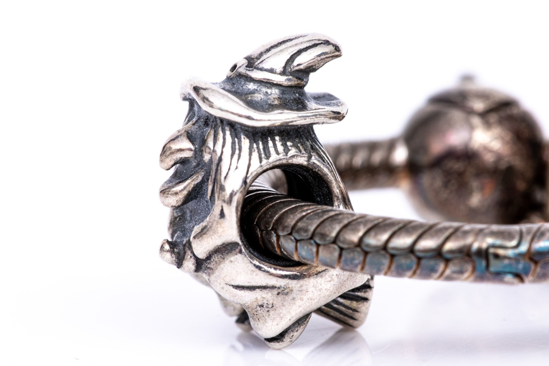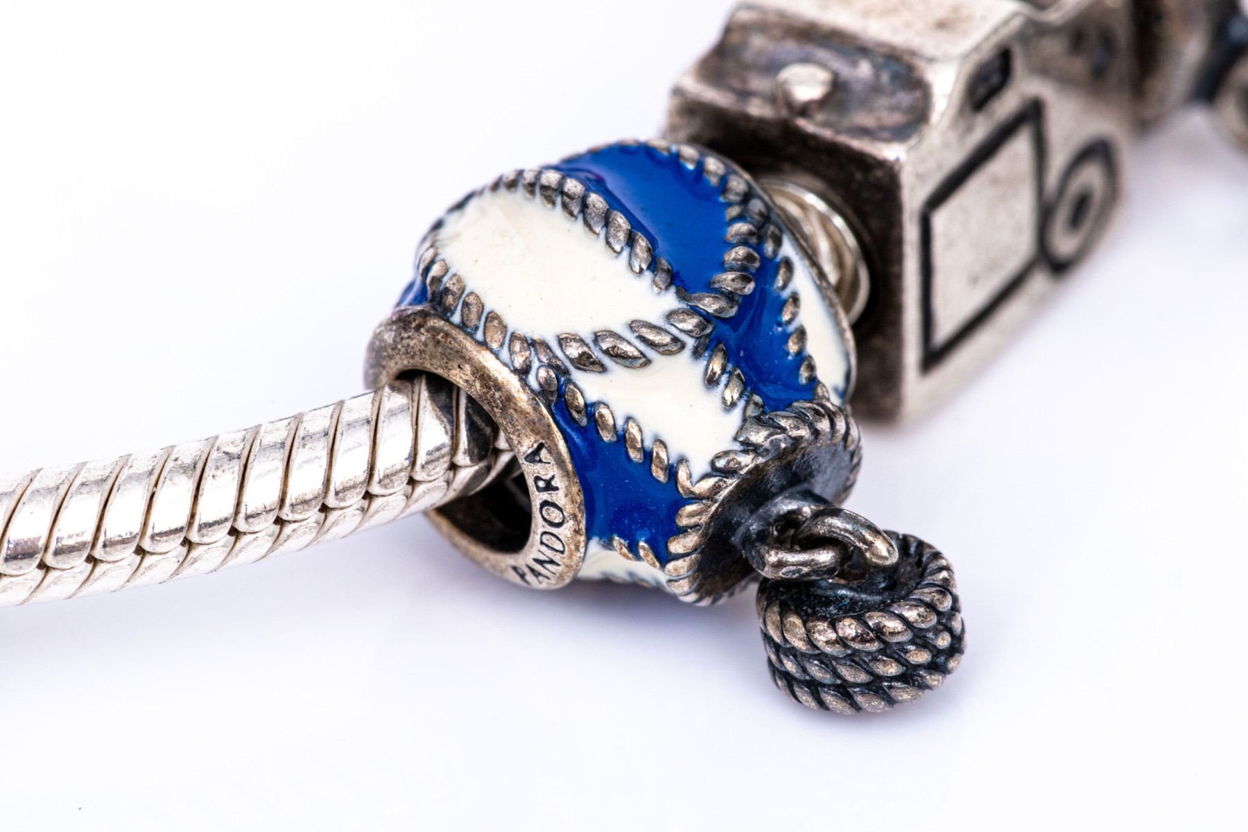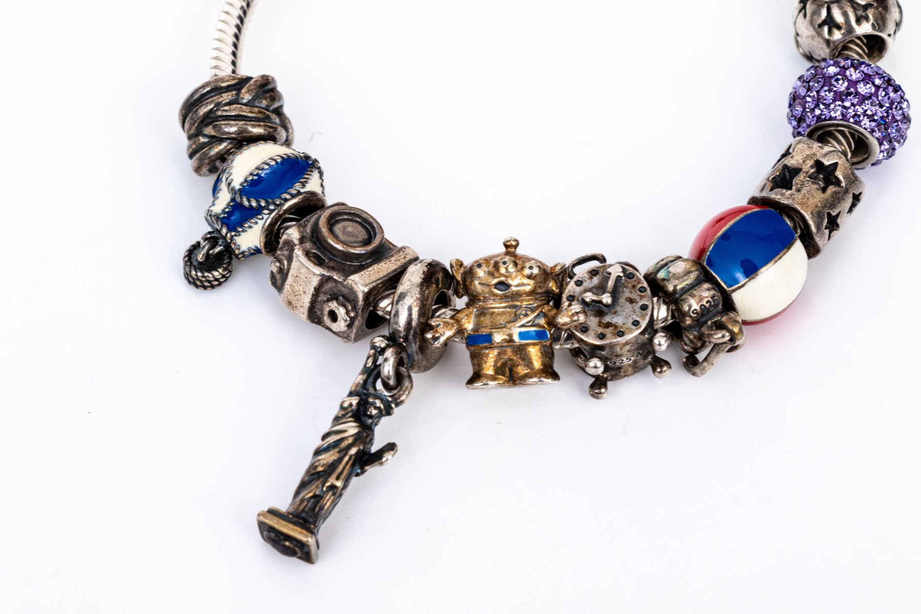 Pandora sterling silver charm bracelet and Pandora sterling Halloween/fall themed charm necklace. This bracelet features and assortment of figural sterling silver forms, including the rare snowflake charm, displayed on a sterling silver Pandora bracelet. The necklace features two Halloween motif charms, and a rare Canadian maple leaf sterling silver travel charm with synthetic ruby