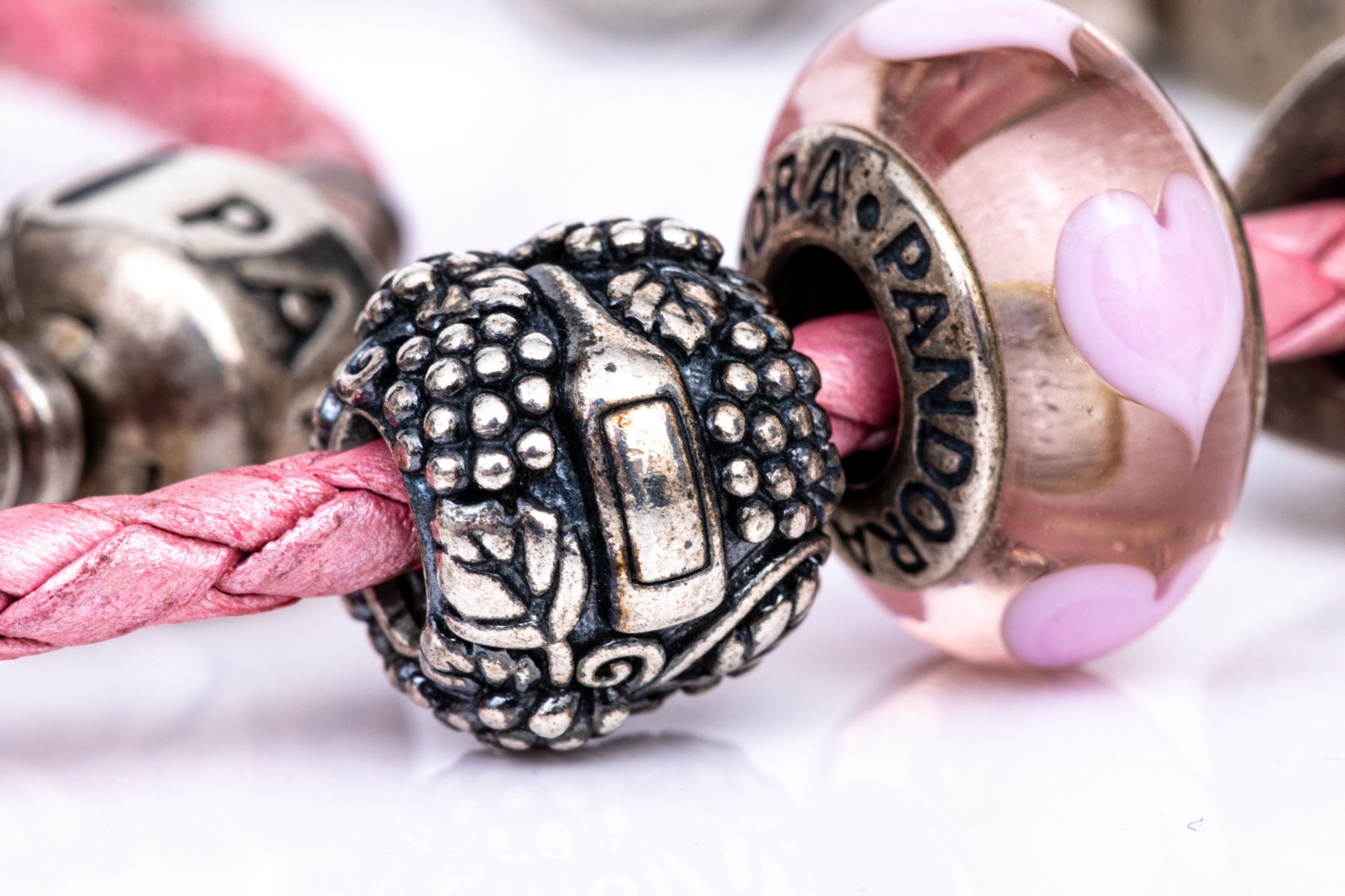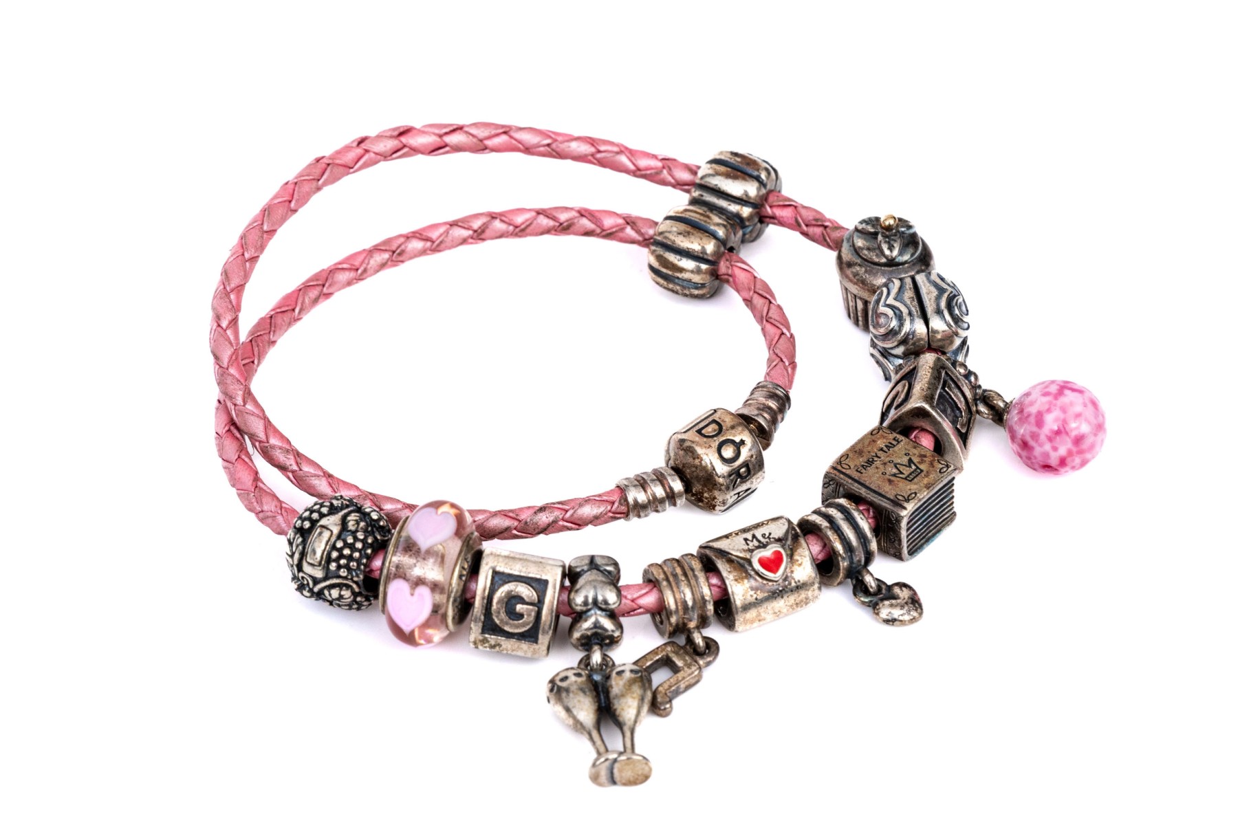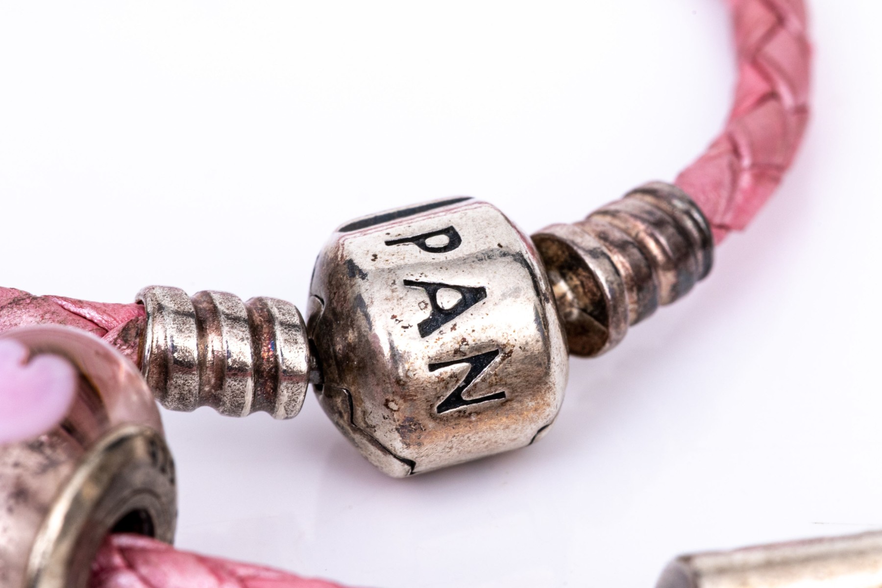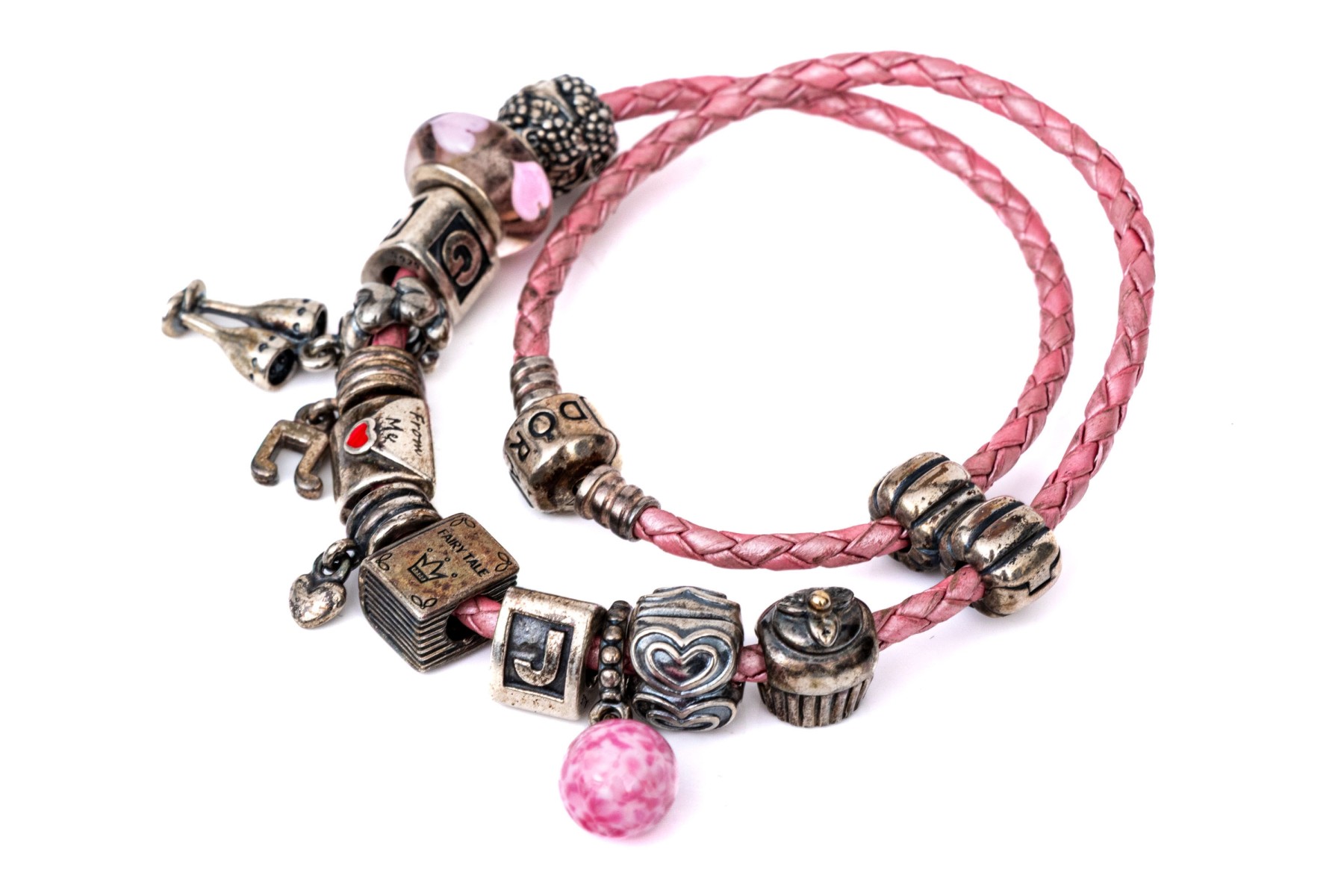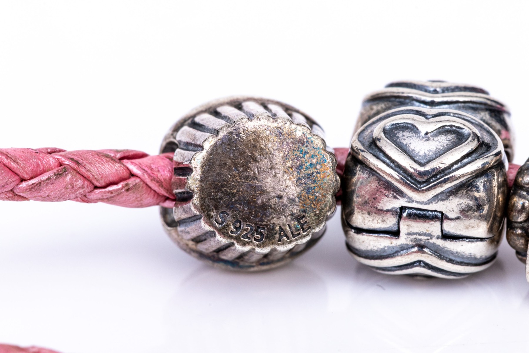 Pandora sterling silver pretty love and romance themed bracelet, on a pink double tour cord. This bracelet features an assortment of figural sterling silver love and romance motif charms, displayed on a pink braided double tour (two row wrap) Pandora cord. One of the charms is the Pandora rare retired sterling silver speckled beauty pink in murano glass