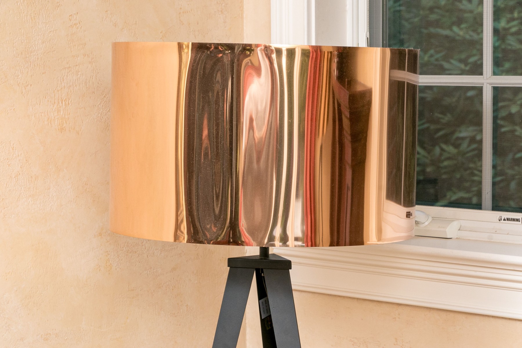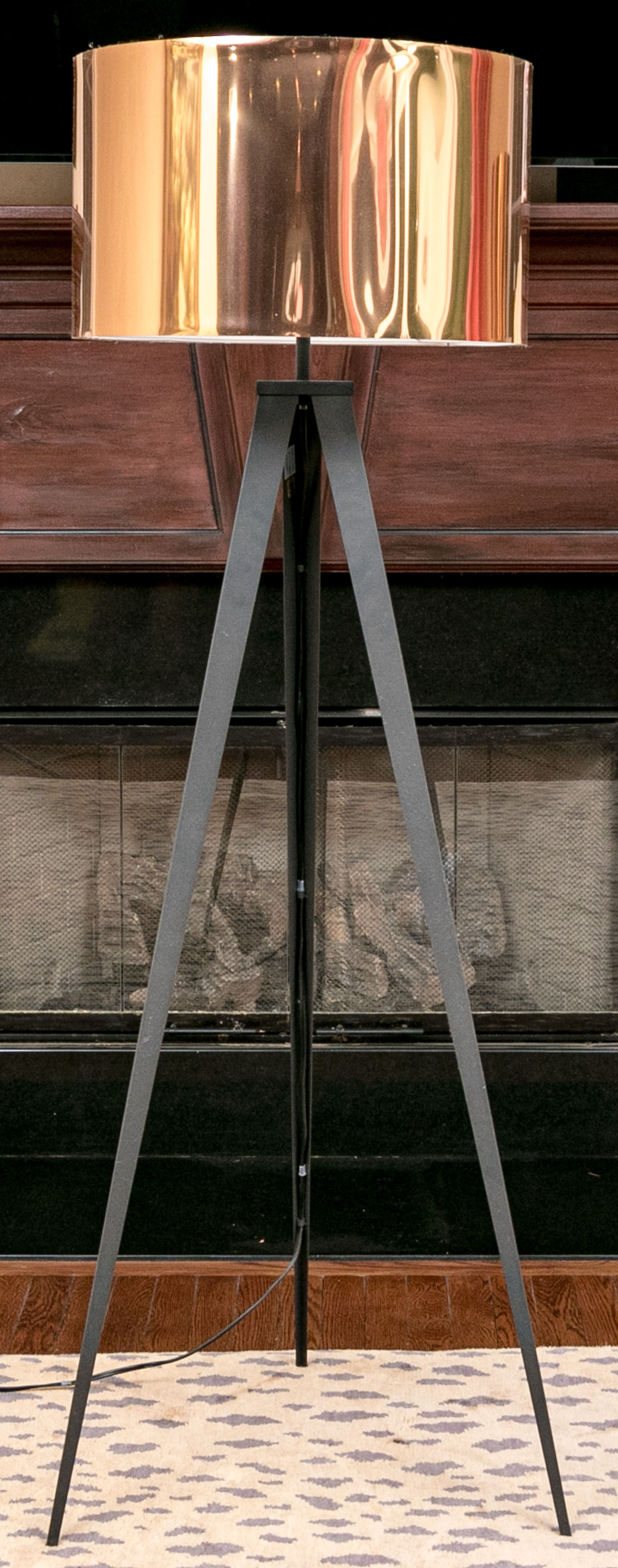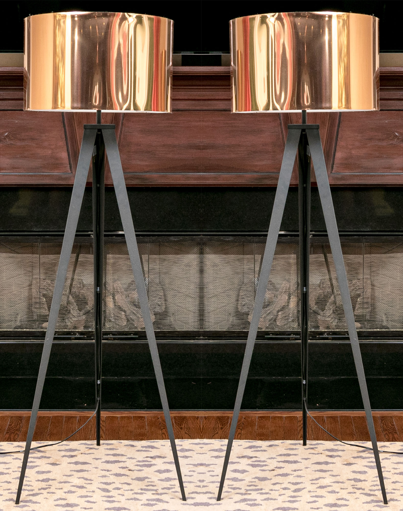 Black metal tripods with shiny copper tone paper drum shades on the outside and shiny silver tone on the inside.