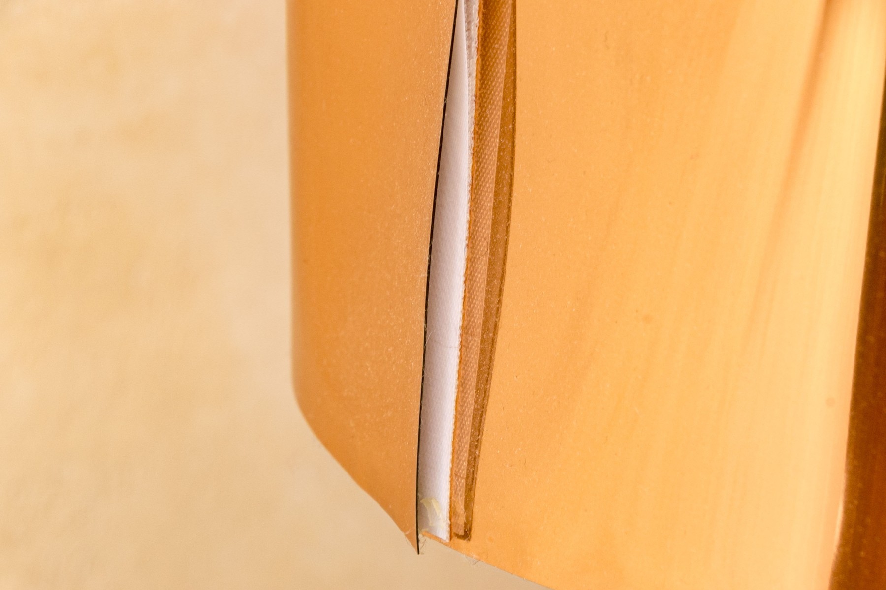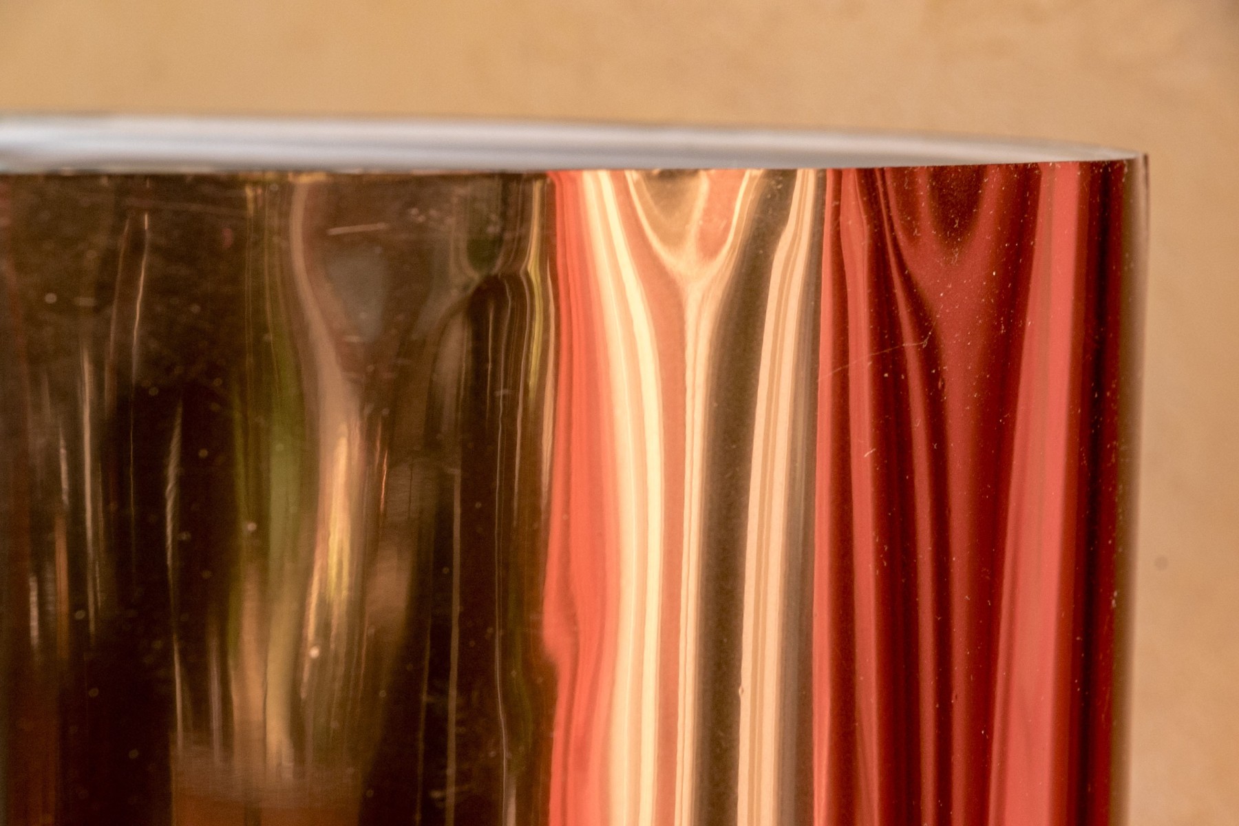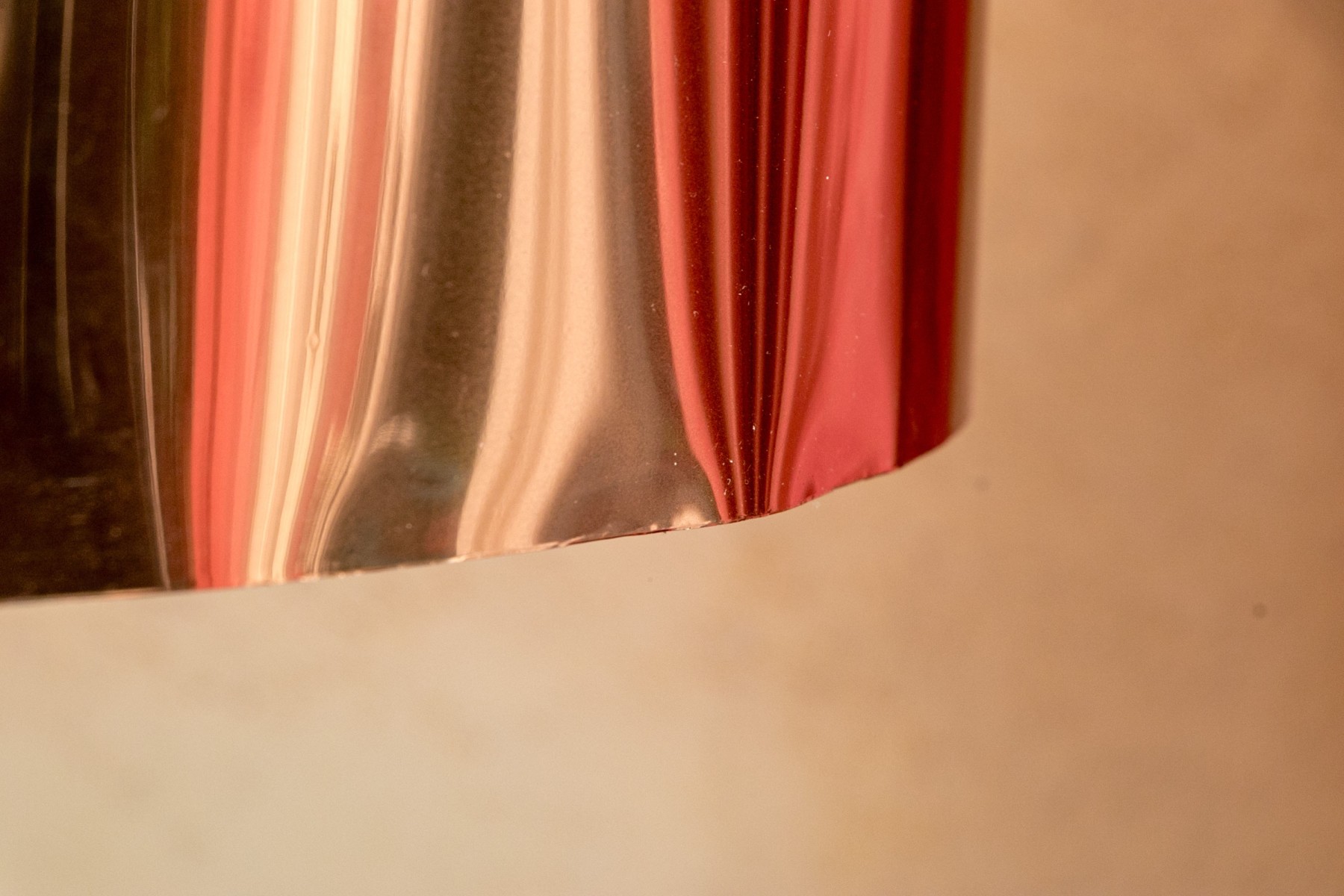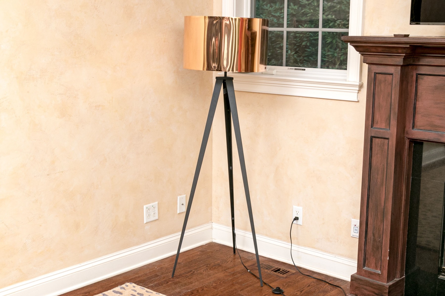 Black metal tripods with shiny copper tone paper drum shades on the outside and shiny silver tone on the inside.