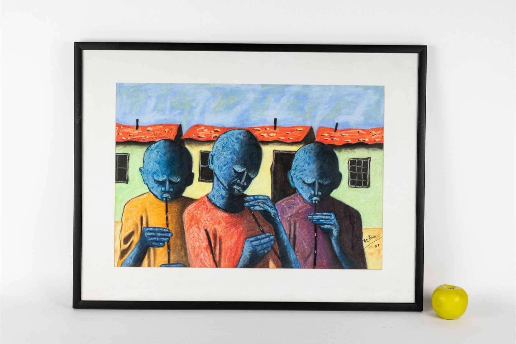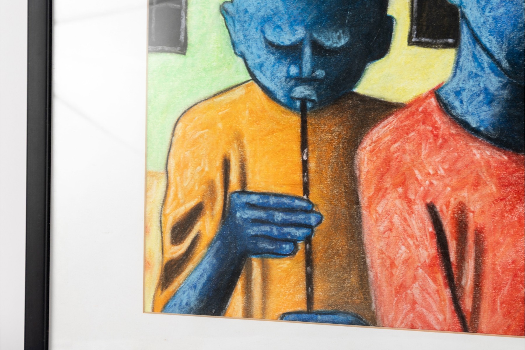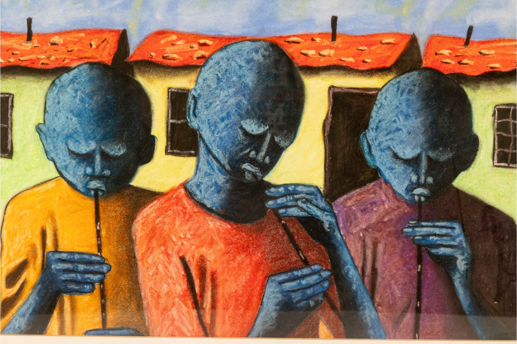 Pat Sithole (South African, b. 1970) pastel on paper depicting three blue musicians in yellow, red, and purple playing in front of three green-yellow houses with orange-red roofs. Signed and dated '07 lower right.
