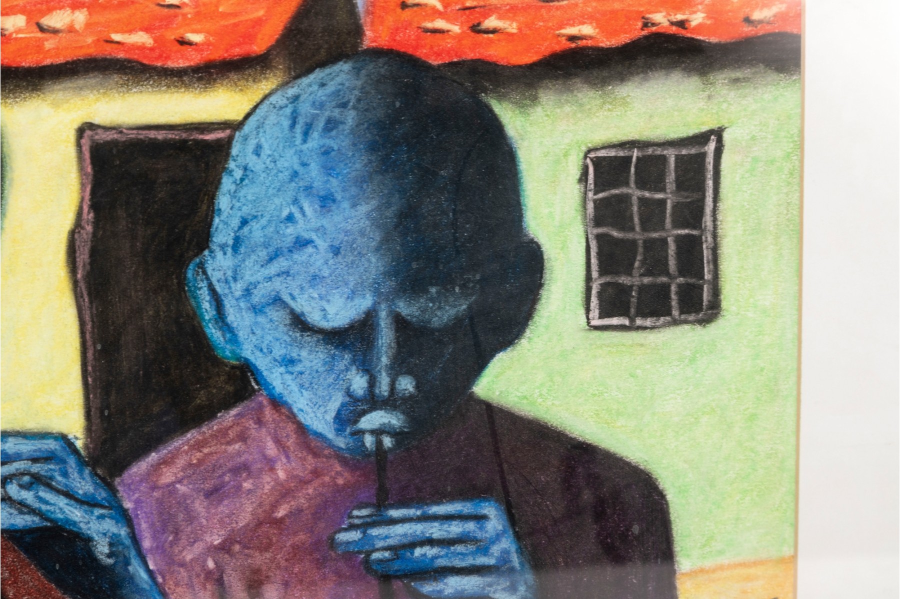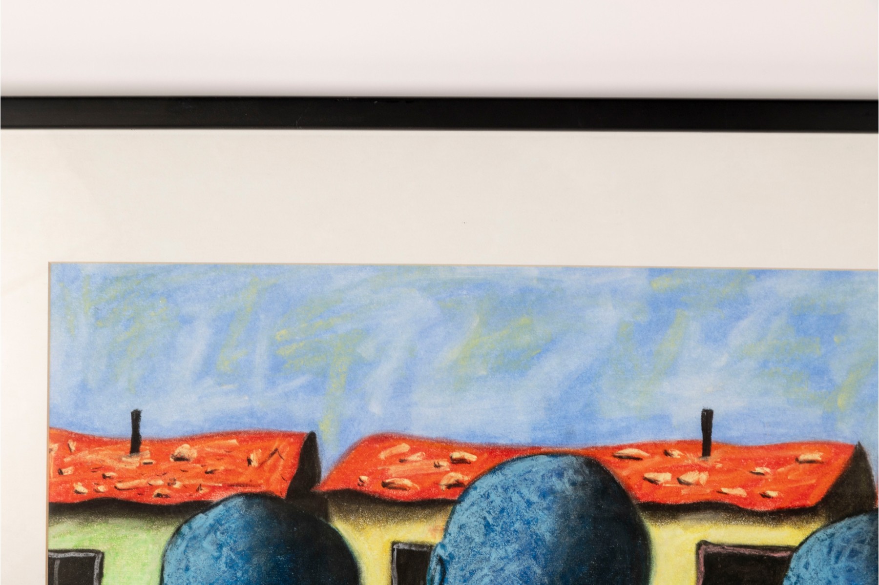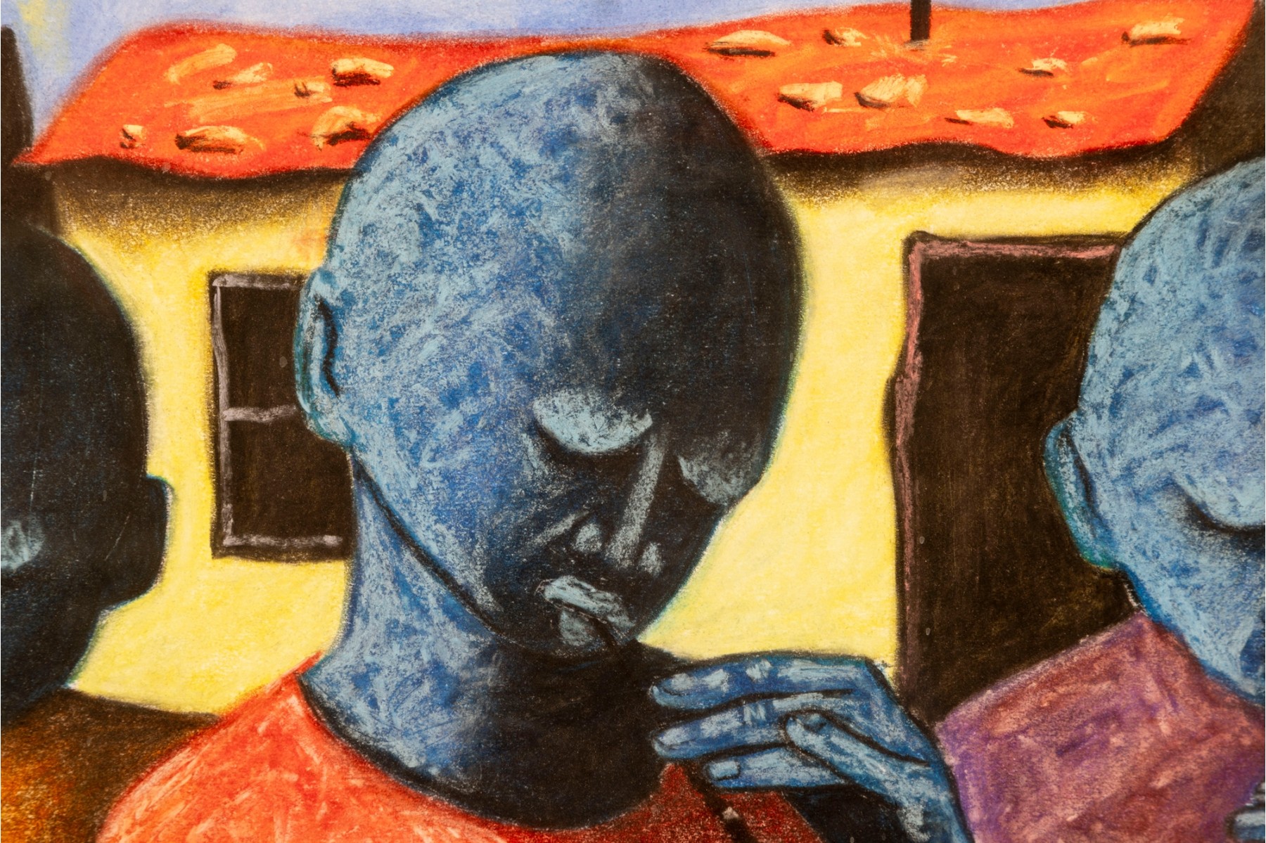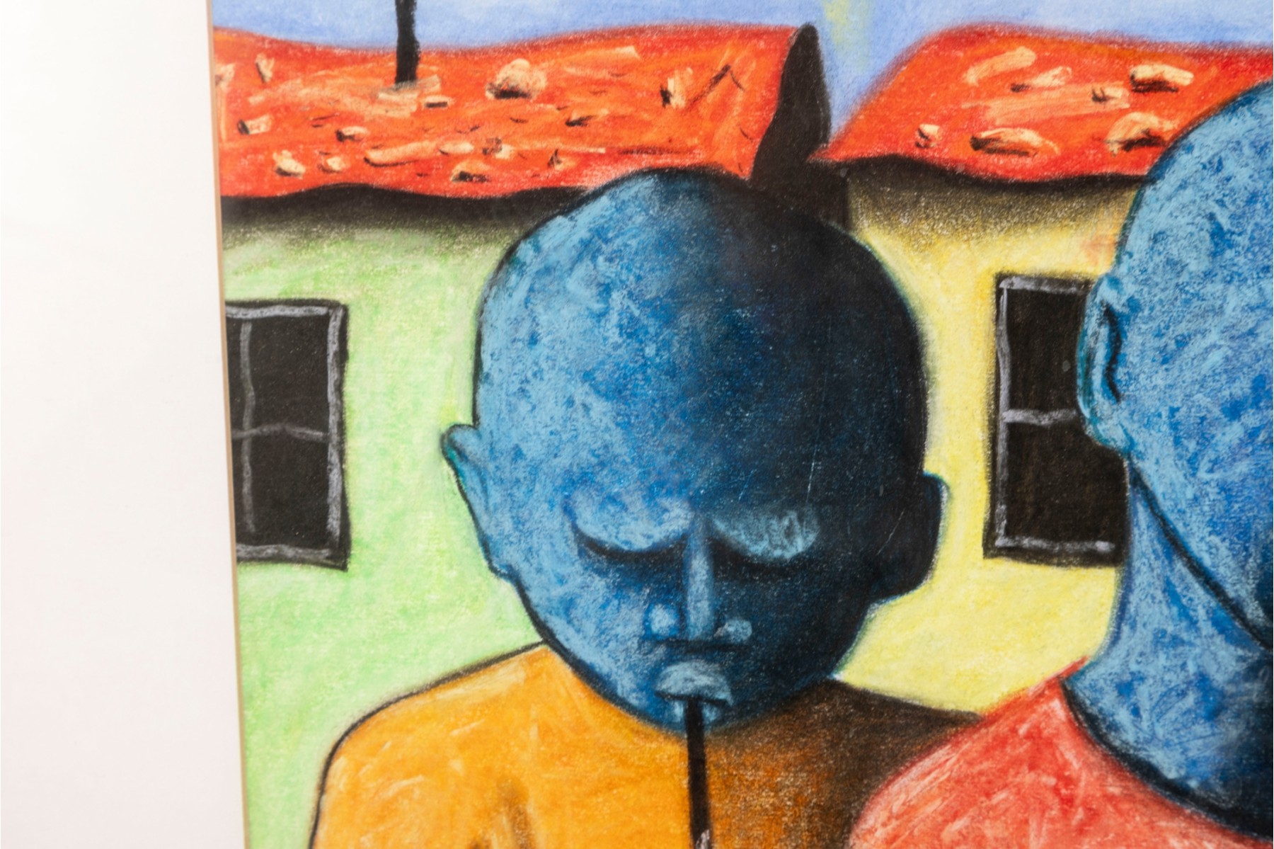 Pat Sithole (South African, b. 1970) pastel on paper depicting three blue musicians in yellow, red, and purple playing in front of three green-yellow houses with orange-red roofs. Signed and dated '07 lower right.