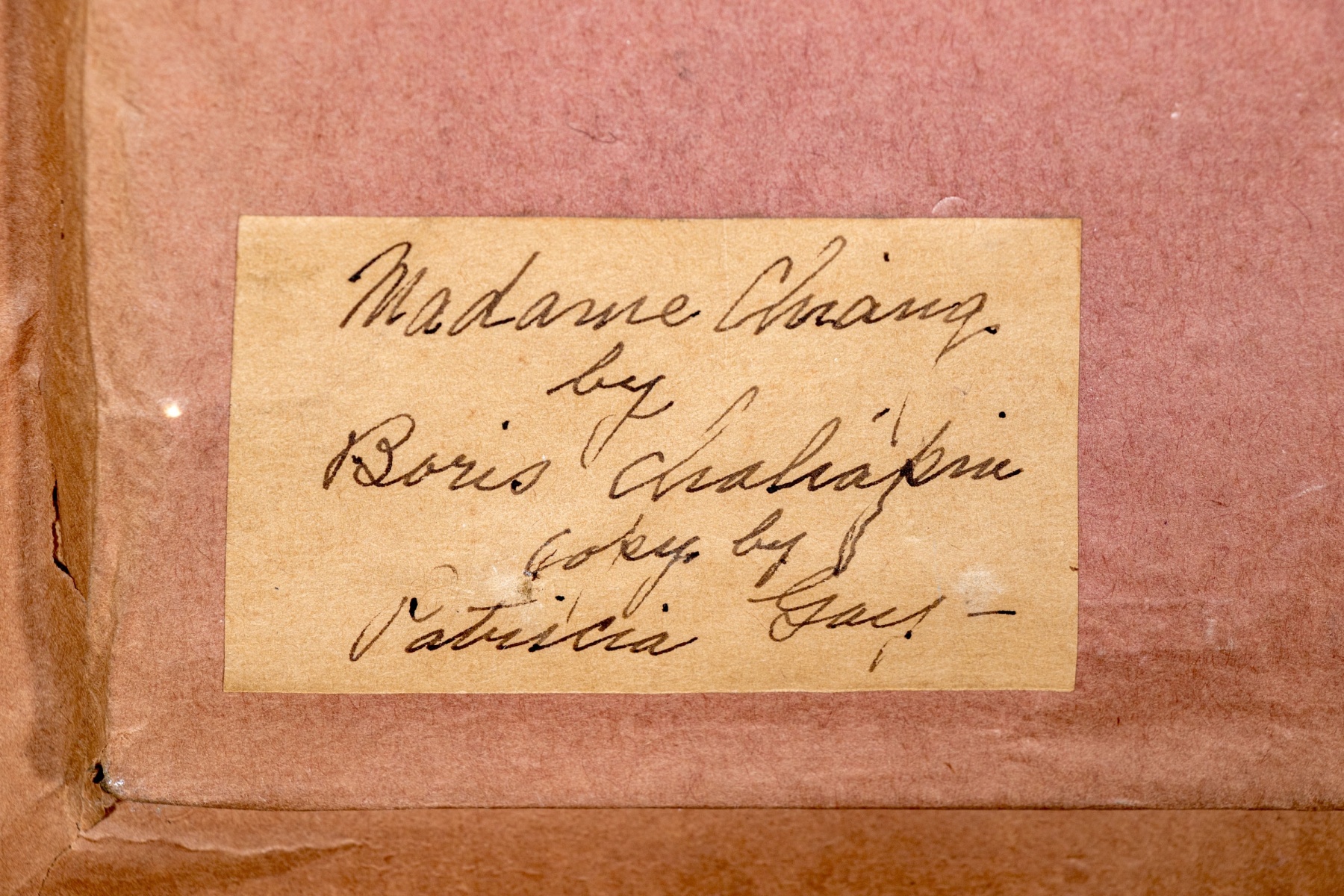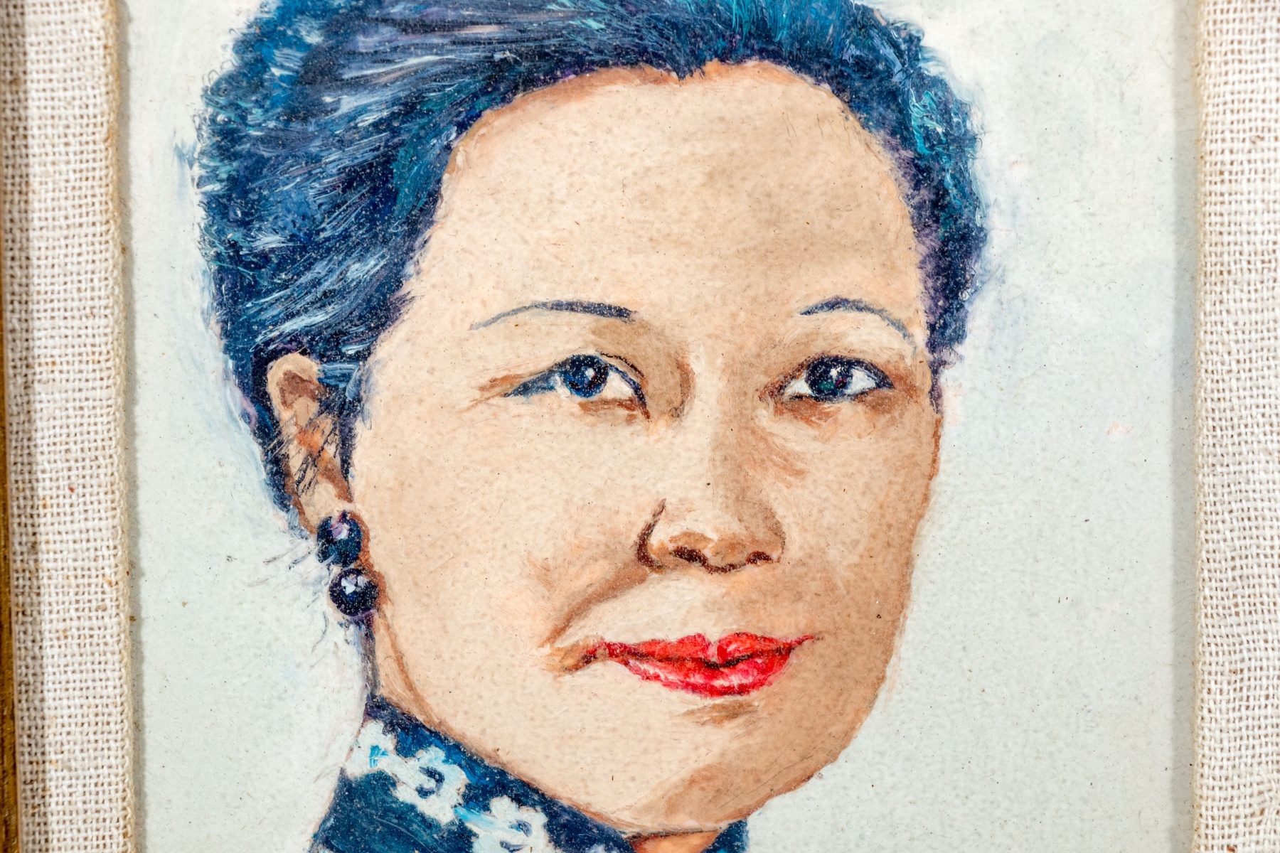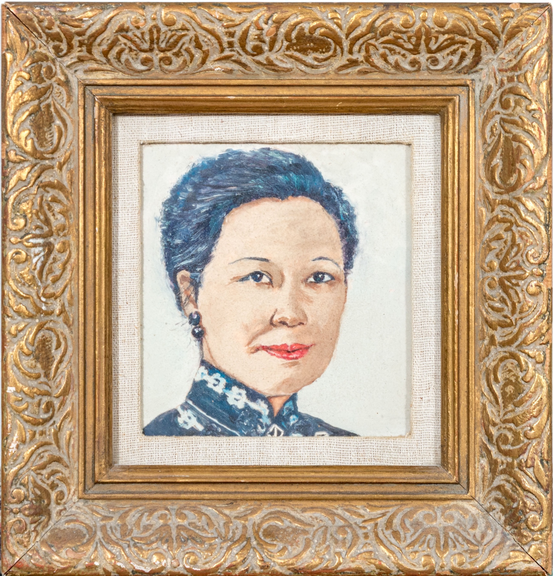 Patricia Gay after Boris Chaliapin (Russian/American 1904-1979) "Madame Chiang Kai-shek (Soong Mei-ling)" depicting a portrait of the Former First Lady of Taiwan with black hair in an updo and double black pearl earrings posed in three quarter profile looking at the viewer with a gentle smile. With a handwritten label to the verso.