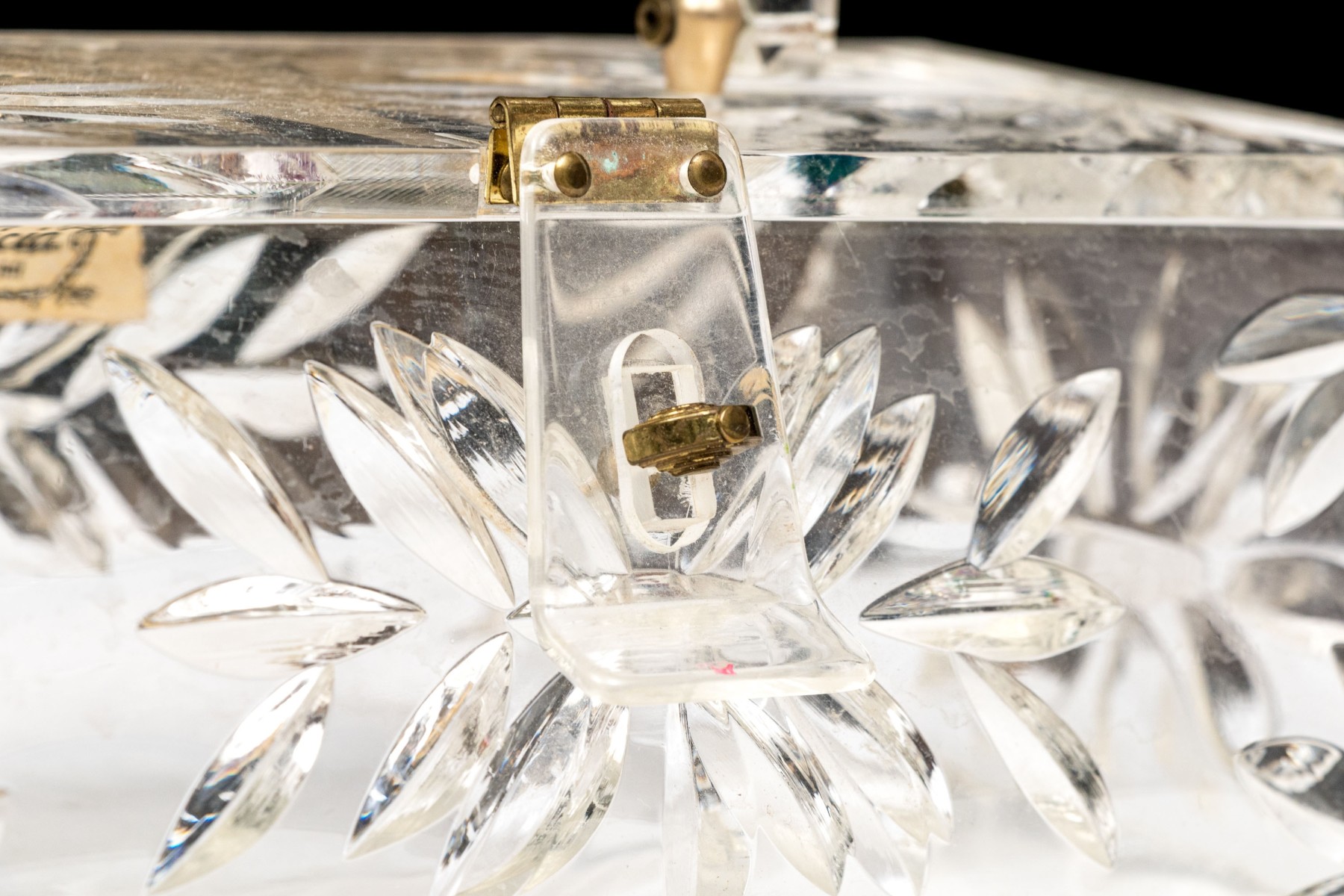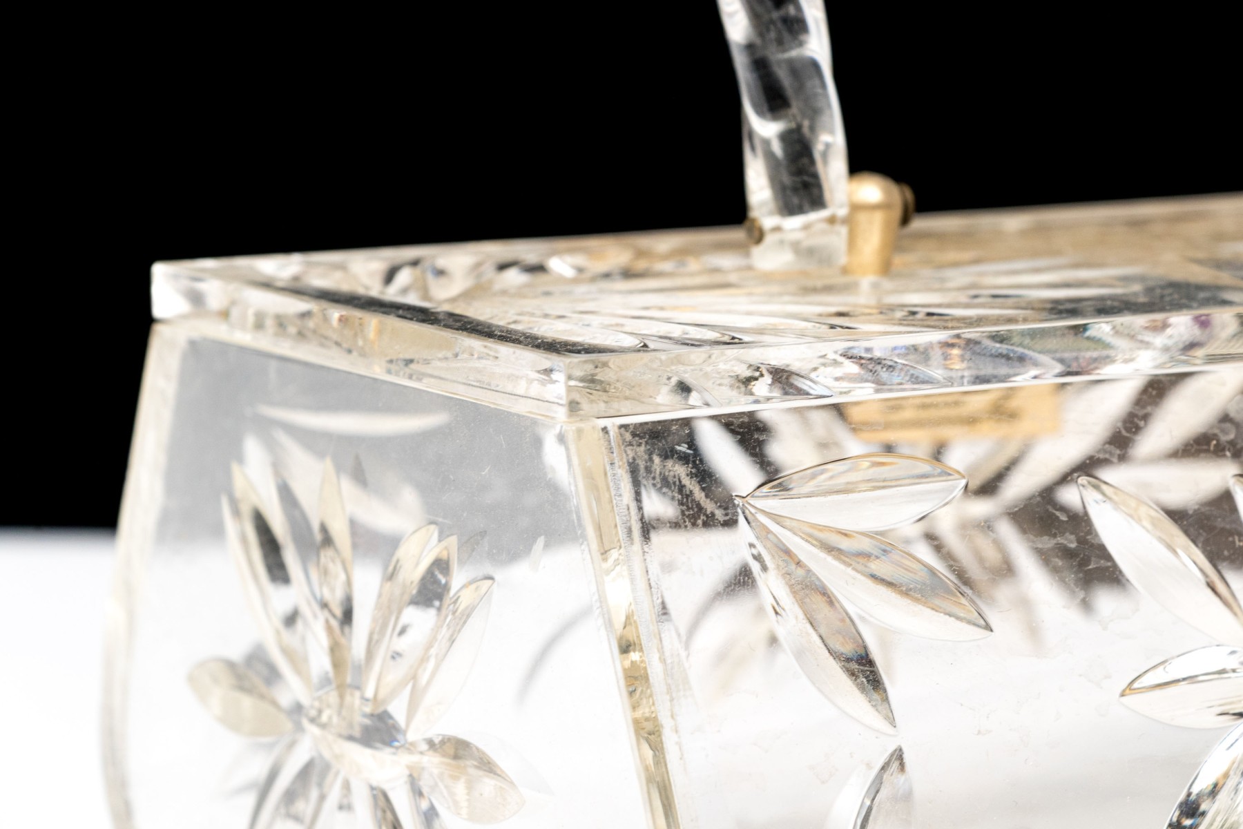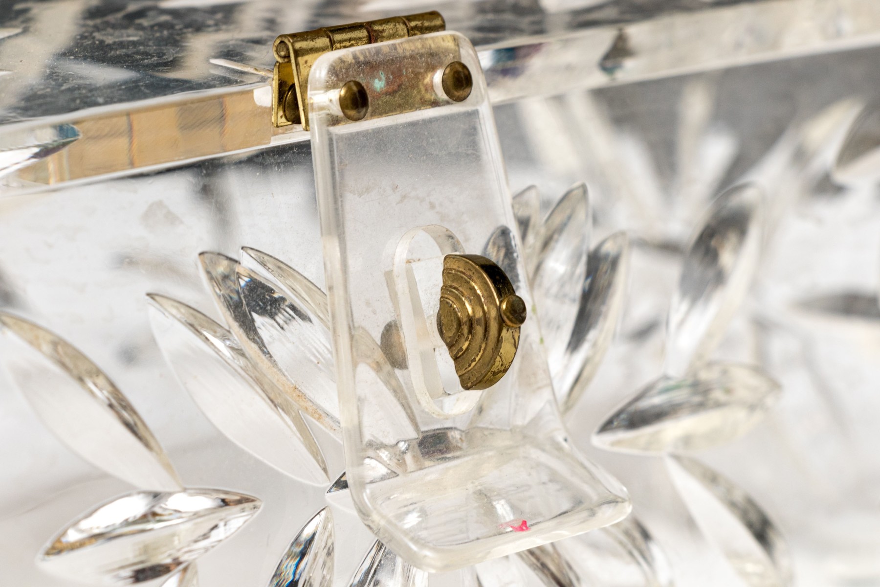The acrylic frame is decorated in faux cut crystal body with hinged lid and hinged handle with hinged close clasp.