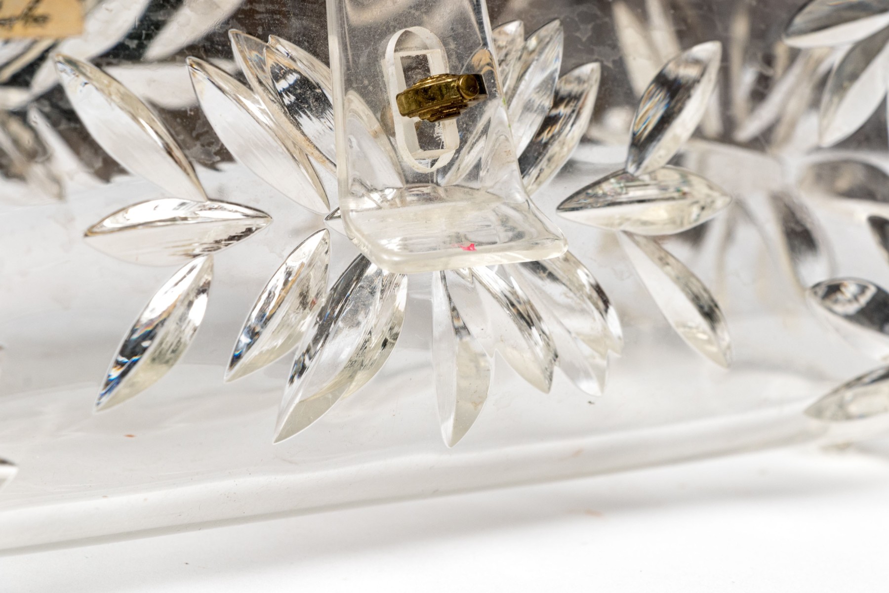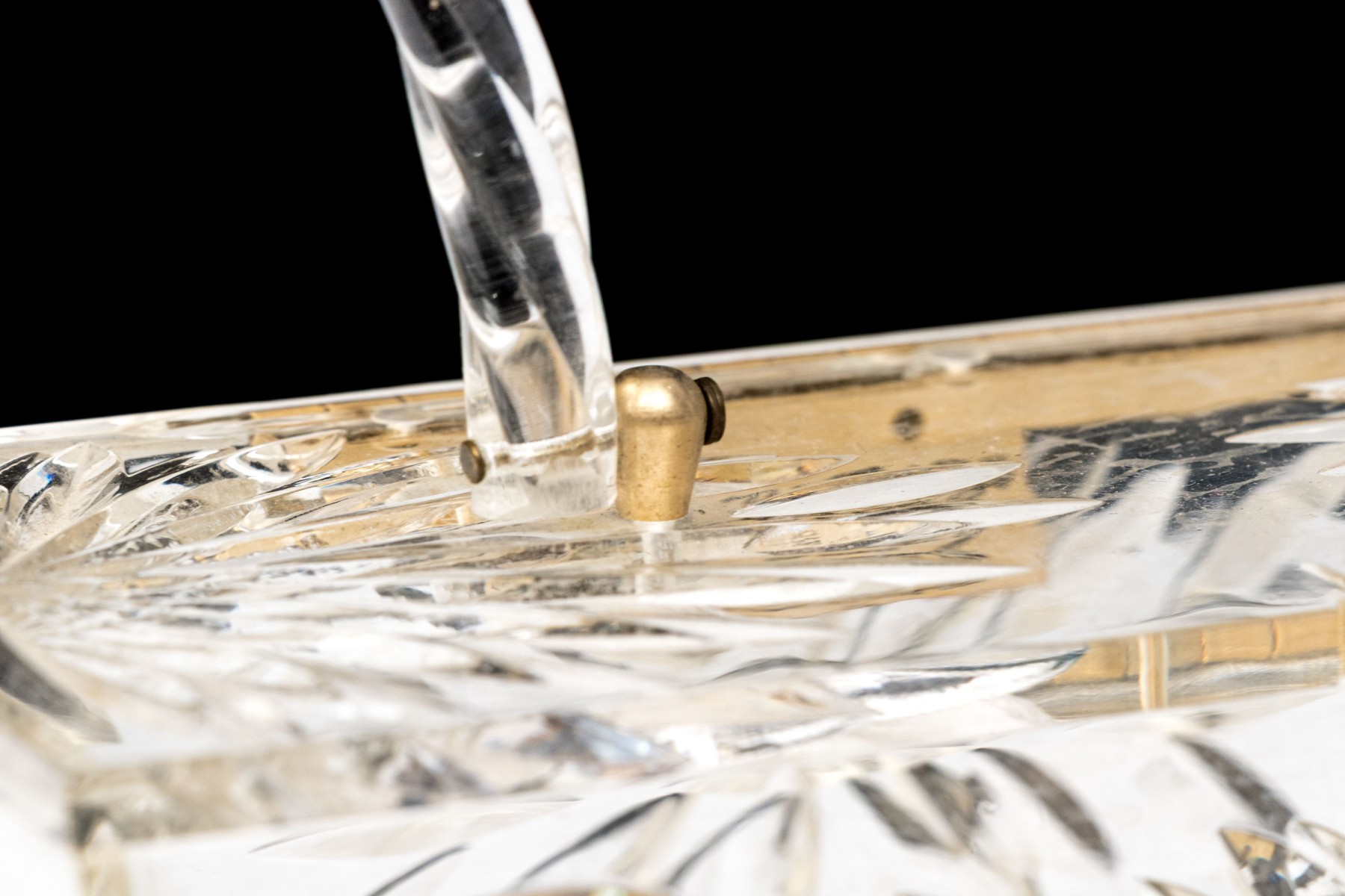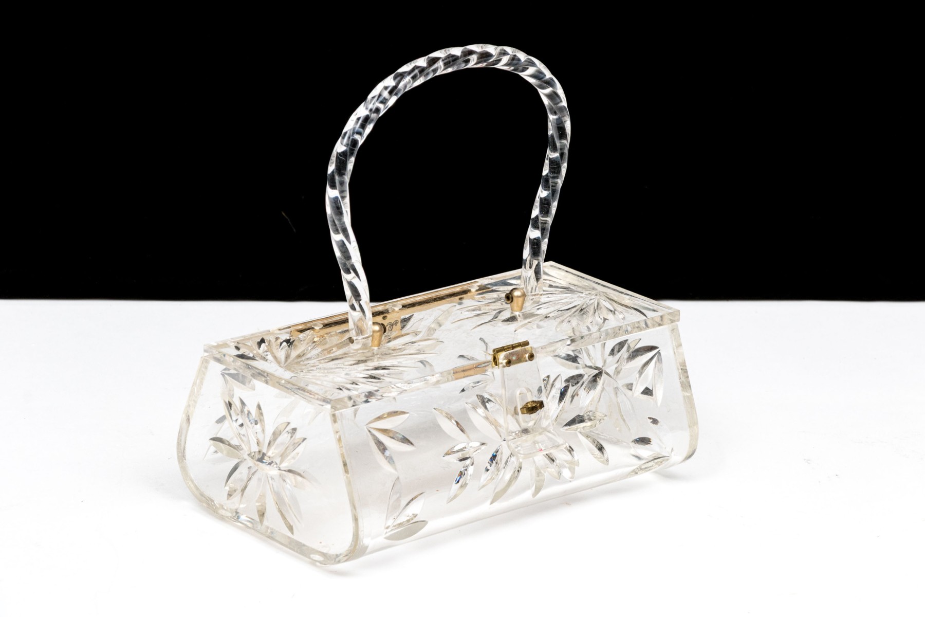 The acrylic frame is decorated in faux cut crystal body with hinged lid and hinged handle with hinged close clasp.