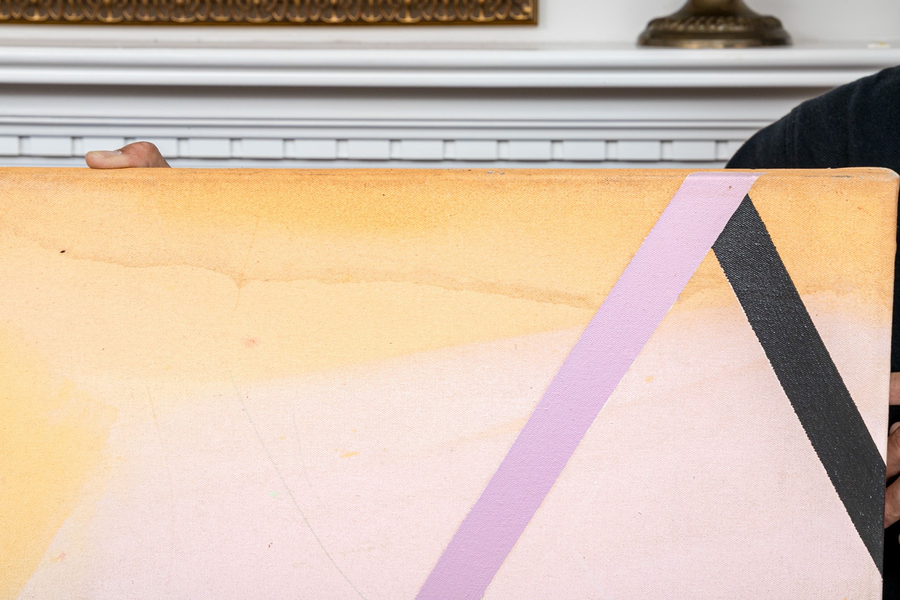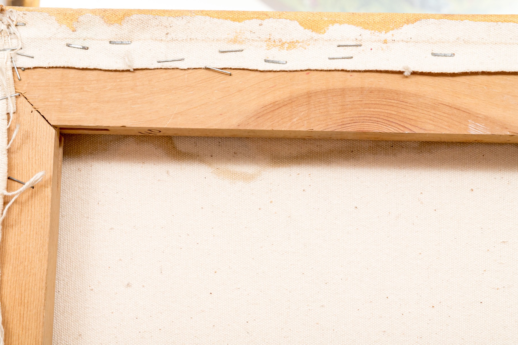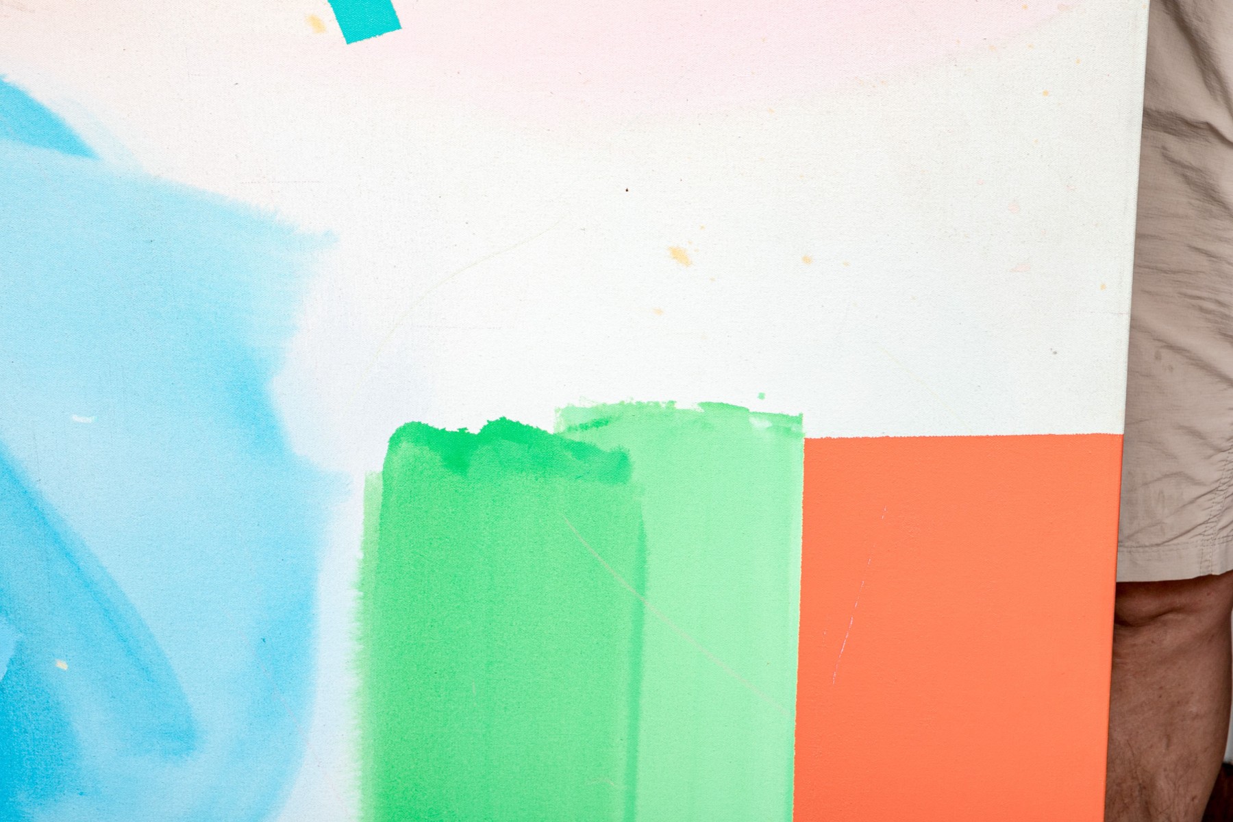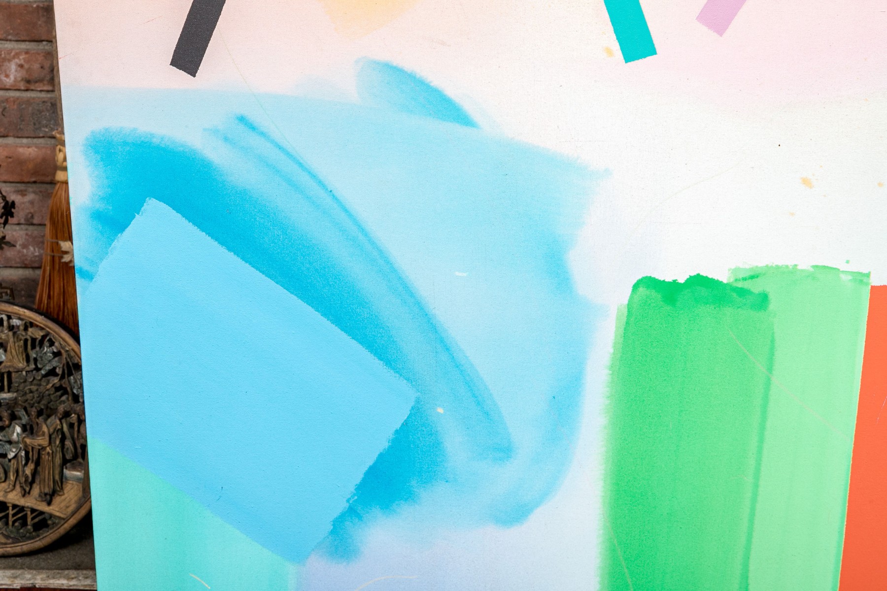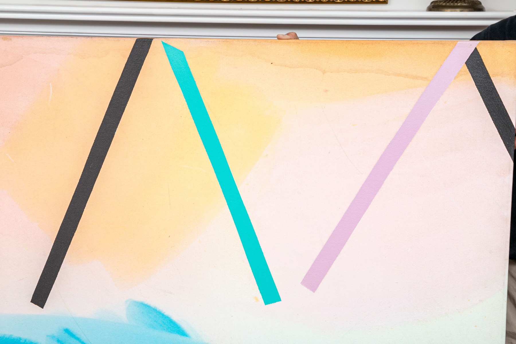 A bright and evocative acrylic on canvas. Painted in the modern, color field style with swaths of bright colors along with more organically painted areas derivative of the modern push towards abstraction.