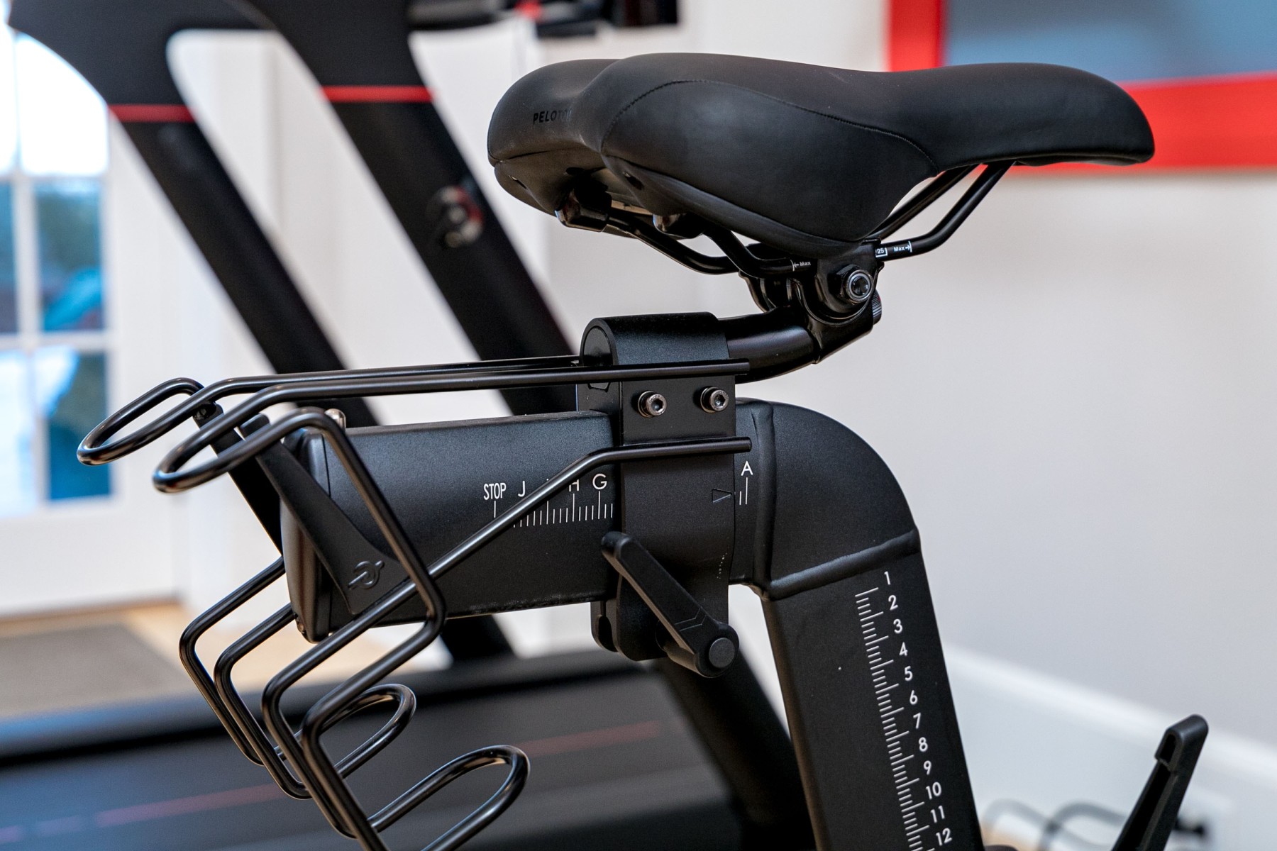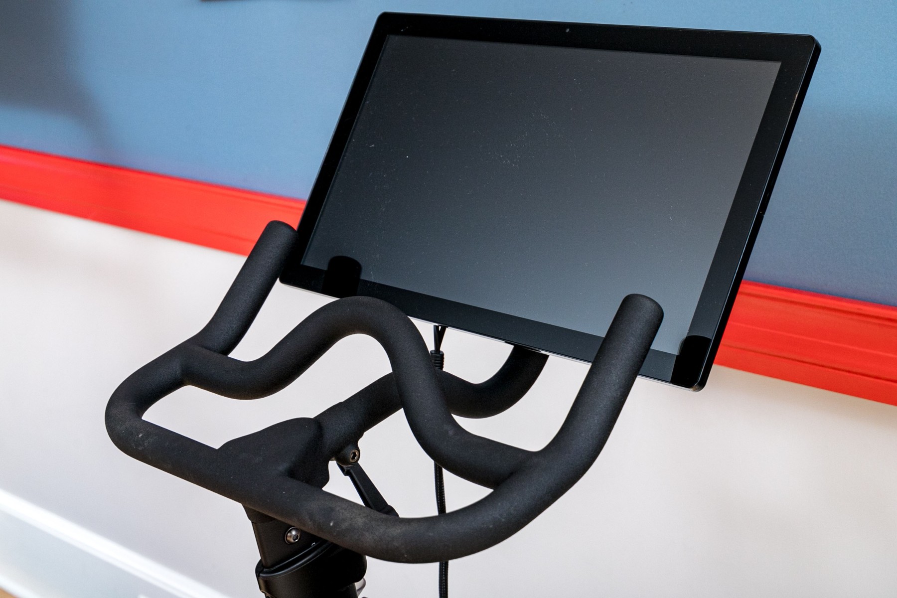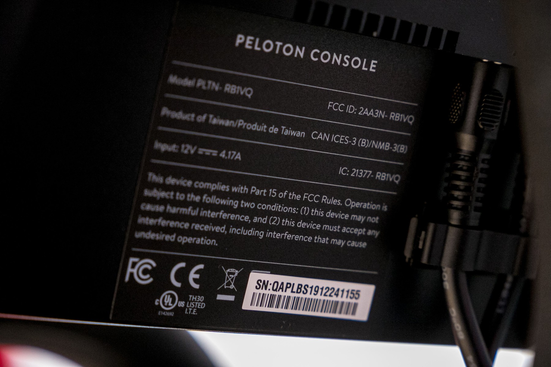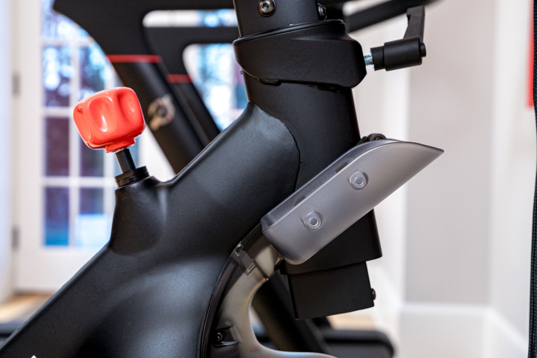Exercise in style with this Peloton 3rd gen stationary bike, model PLTN-RB1VQ. The bike features a sleek profile in classic black with eye-catching red details, complete with a large console.