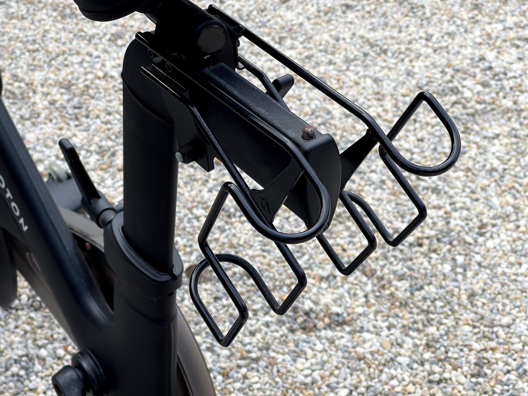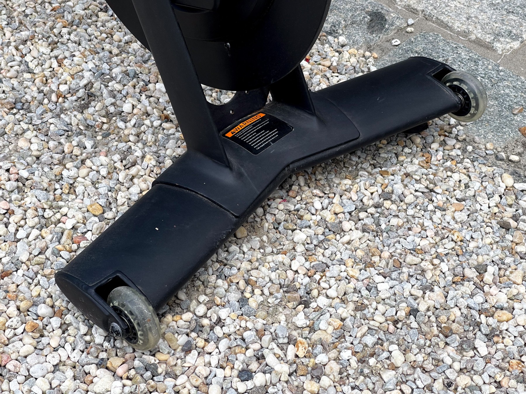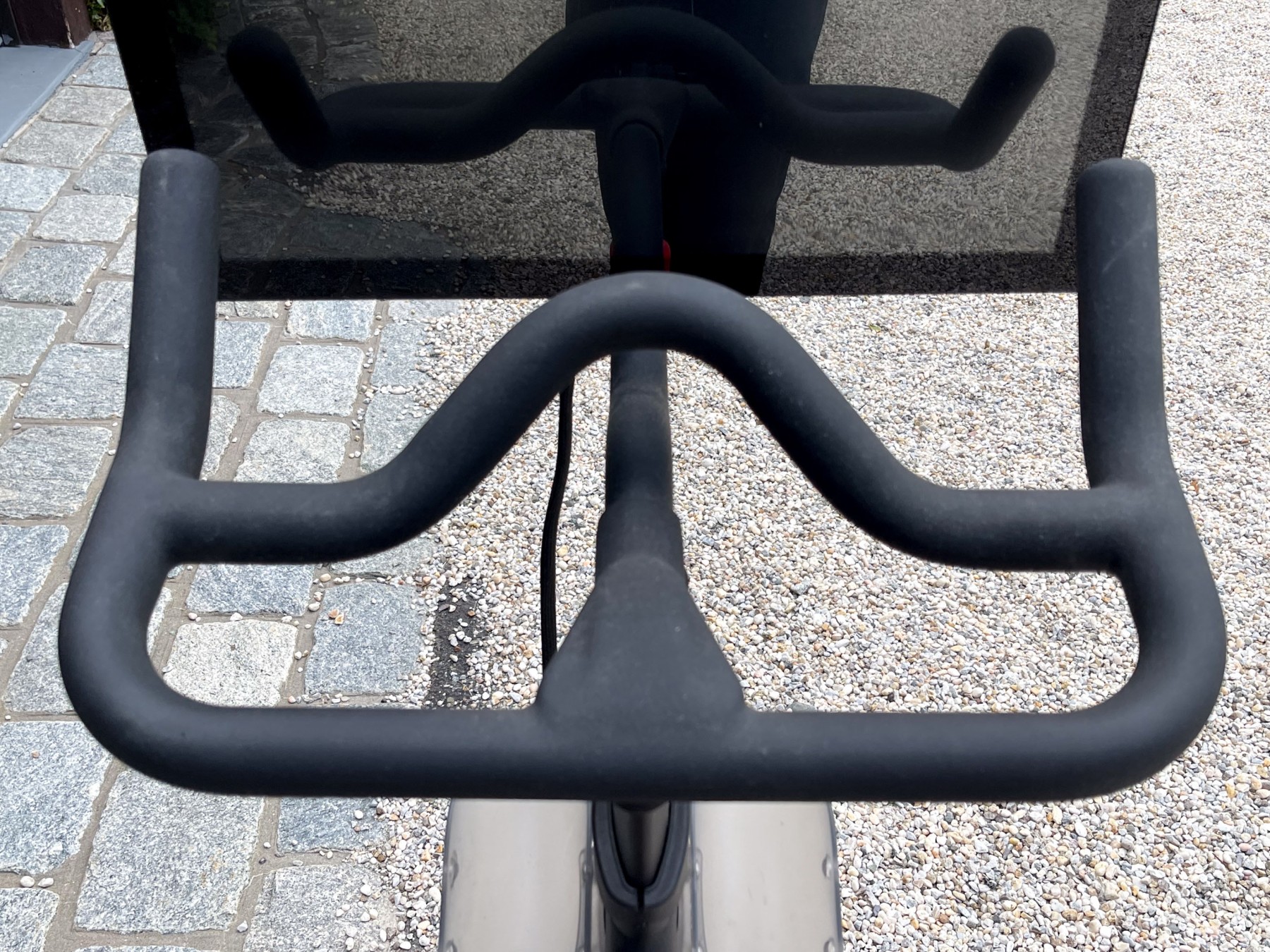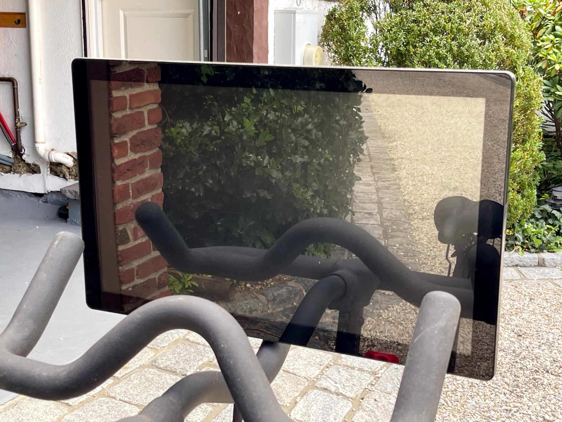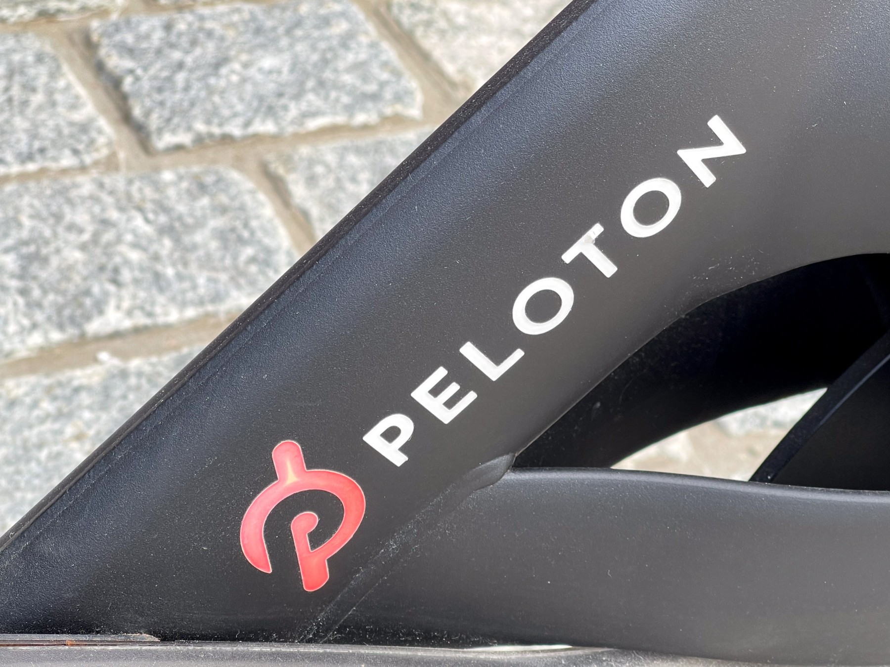 A wonderful Peloton PLTN-RB1VQ exercise bike in sleek black and red.