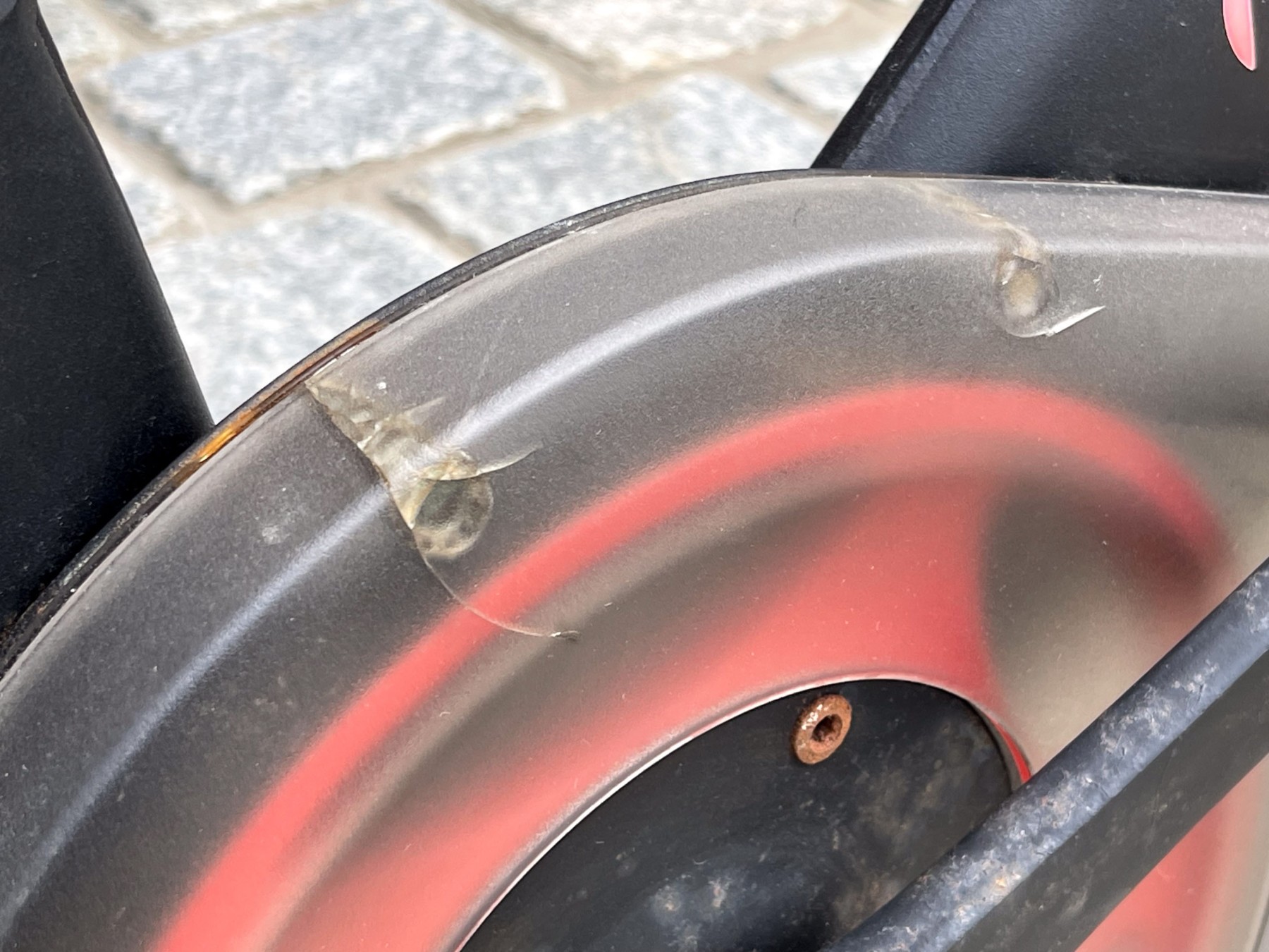 Good overall, gently used. Some cosmetic wear to the clear plastic over the smaller back wheel.