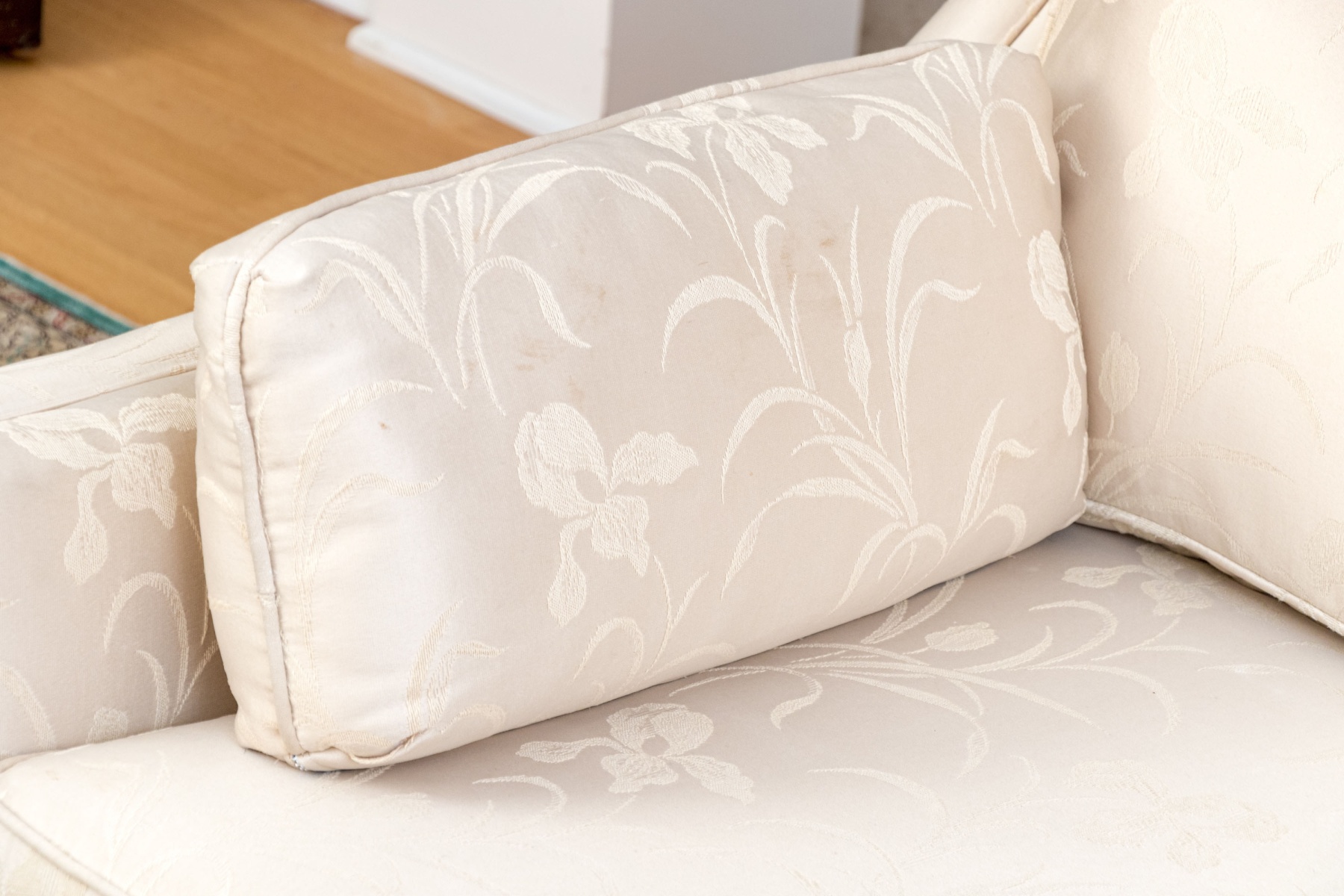 A delightful Pem-Kay Furniture loveseat upholstered in elegant cream white with a luxurious satin feel and pretty beige floral sprays and foliate flourishes. The sofa features a straight back with ears sloping into rail arms, made comfortable with two loose back and seat cushions with two matching accent pillows, all with piped edges for a clean finish. The design rounds out with a short skirted apron concealing the legs beneath.