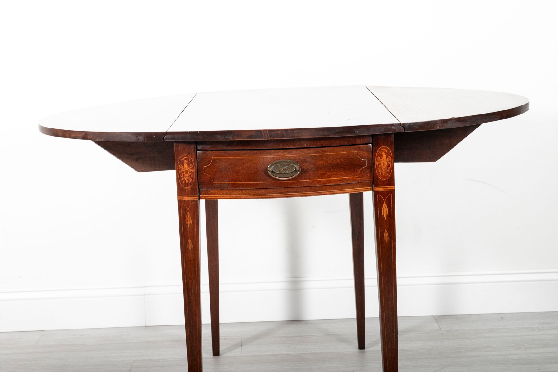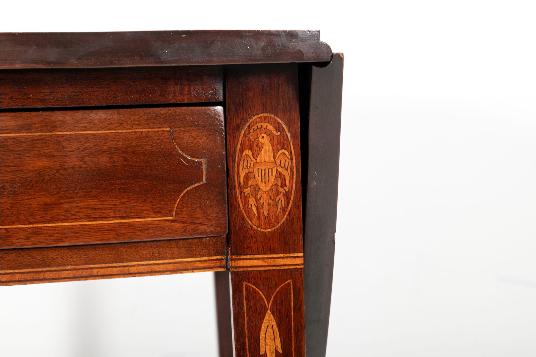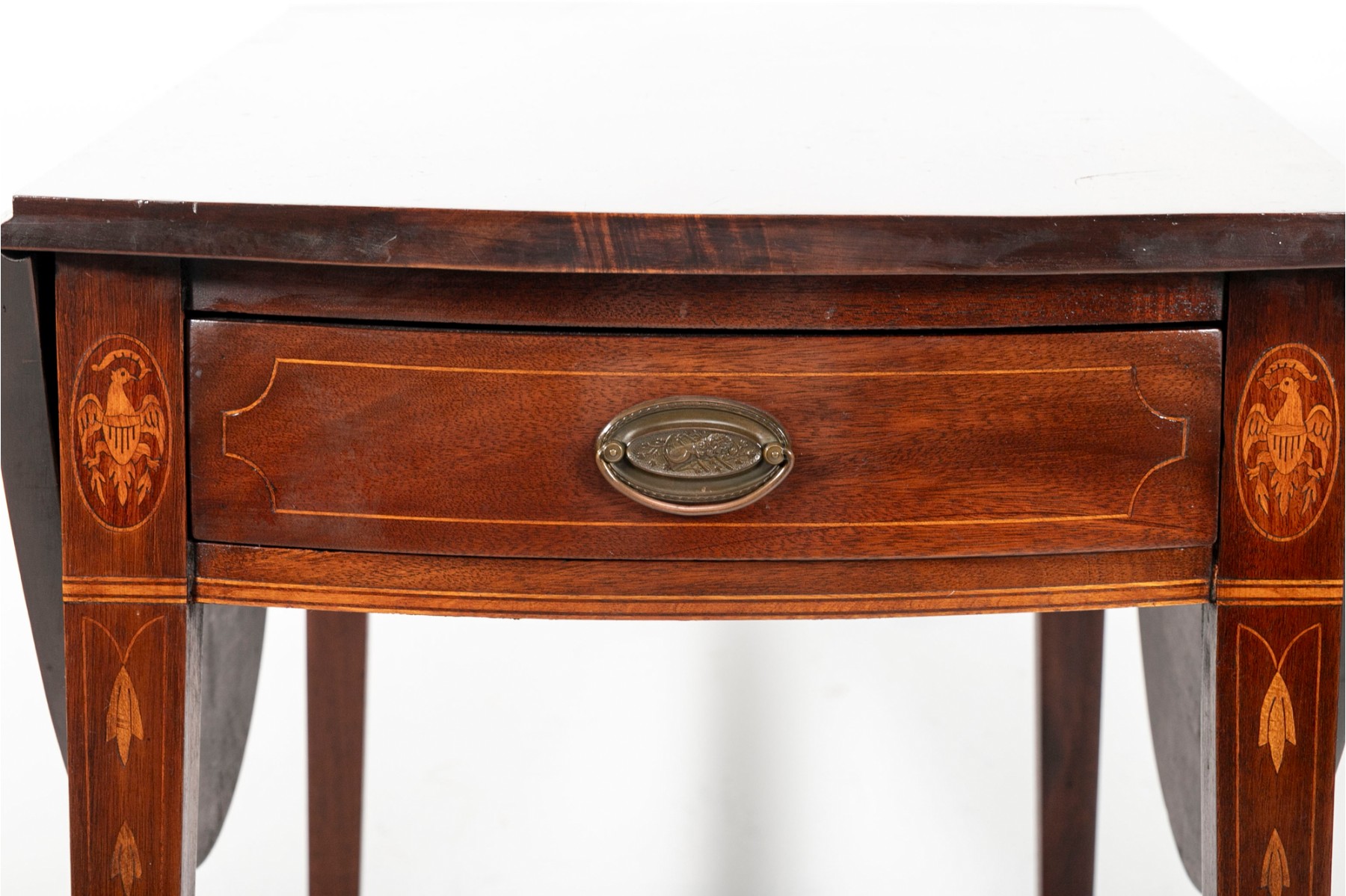 A wonderful pembroke drop-leaf occasional table displaying a gently convex rounded apron flanked by tapered legs accented with inlaid marquetry depicting American eagles and striped shield motifs.