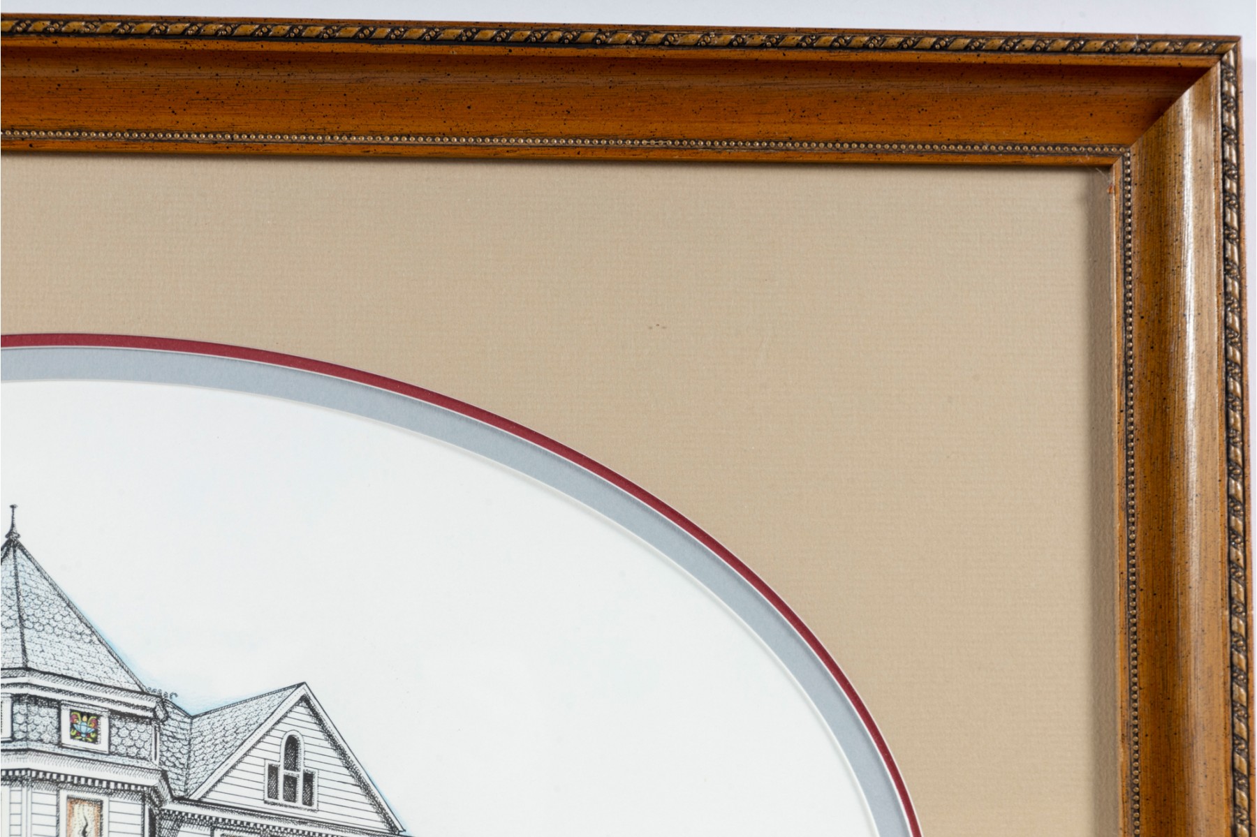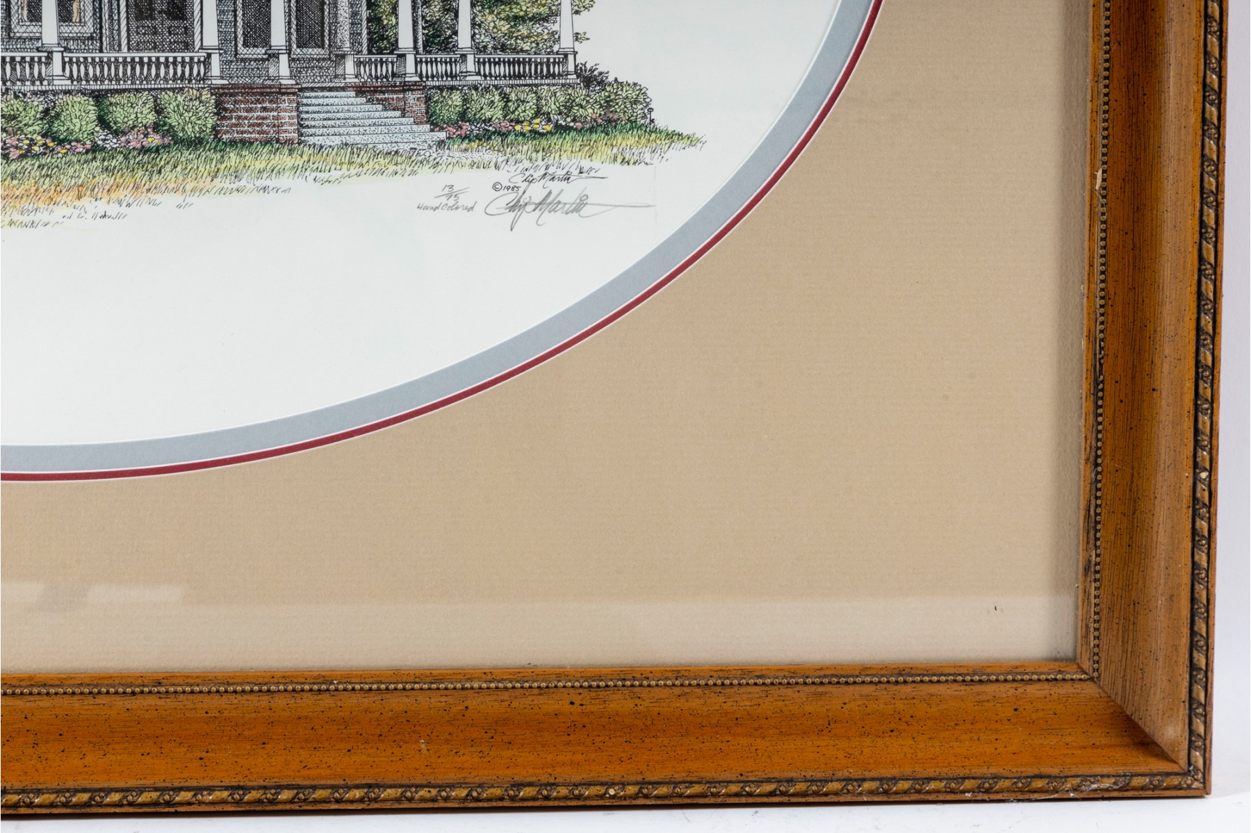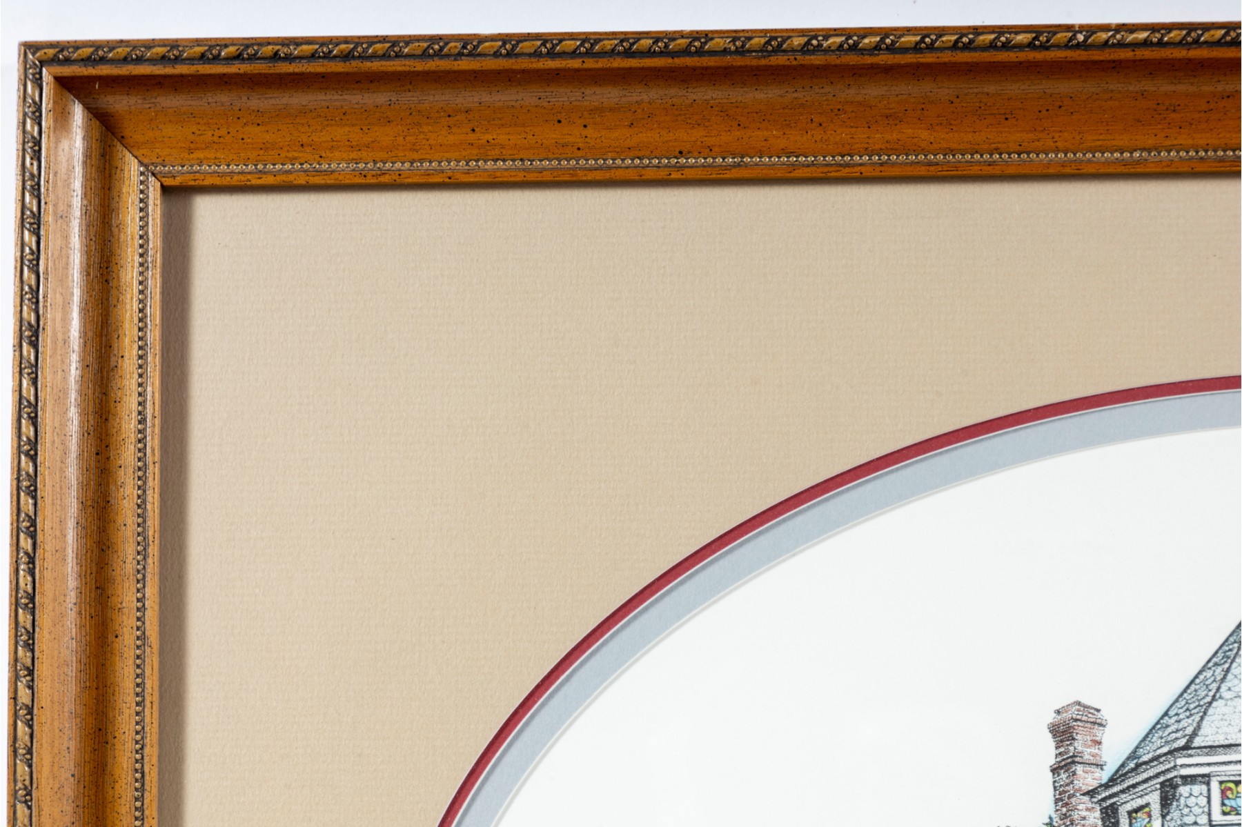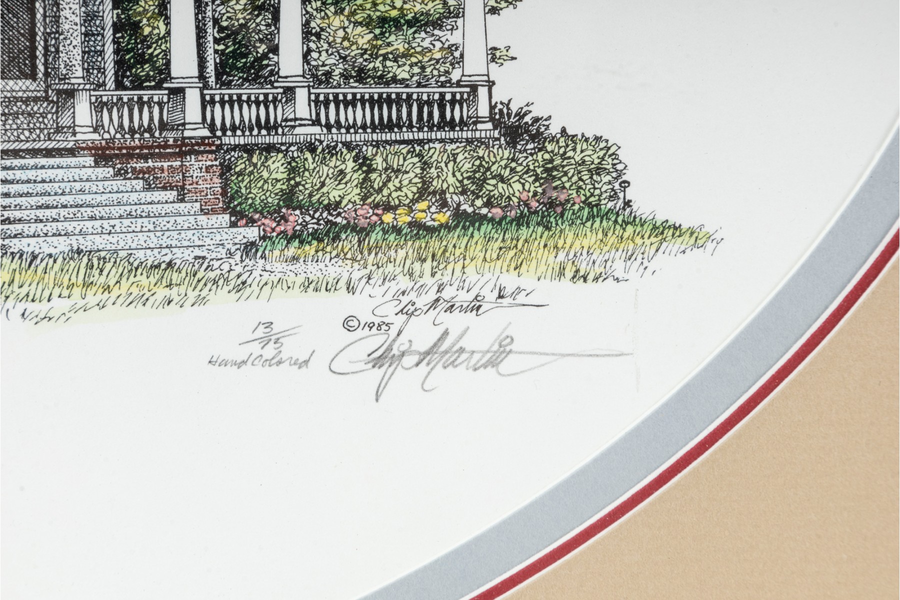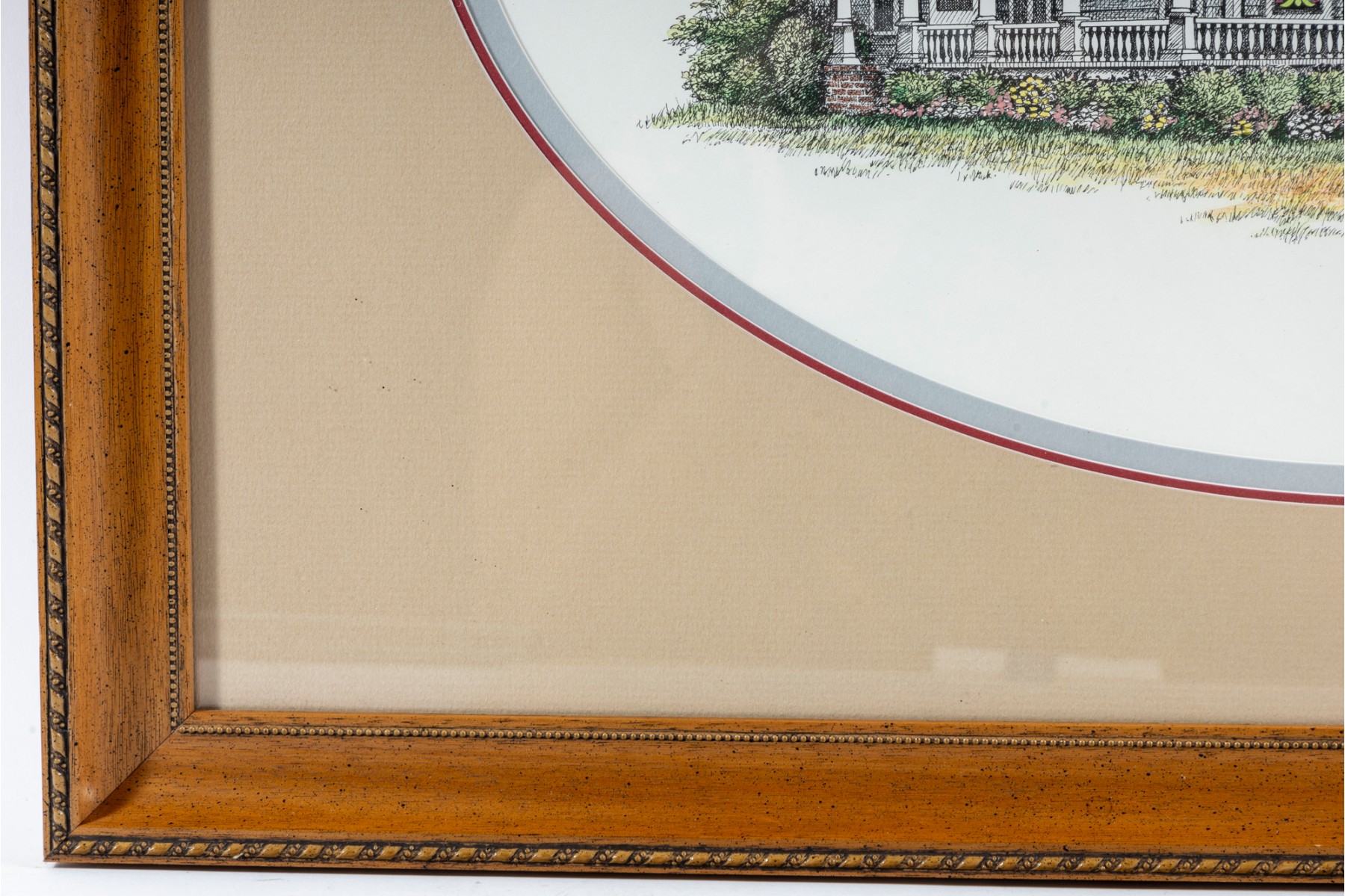 A limited edition pencil signed and hand-colored lithograph numbered 13/75. The artwork depicts a detailed country estate set within a wood frame, faced with glass and accented with oval mat-borders. See photos for signature details.