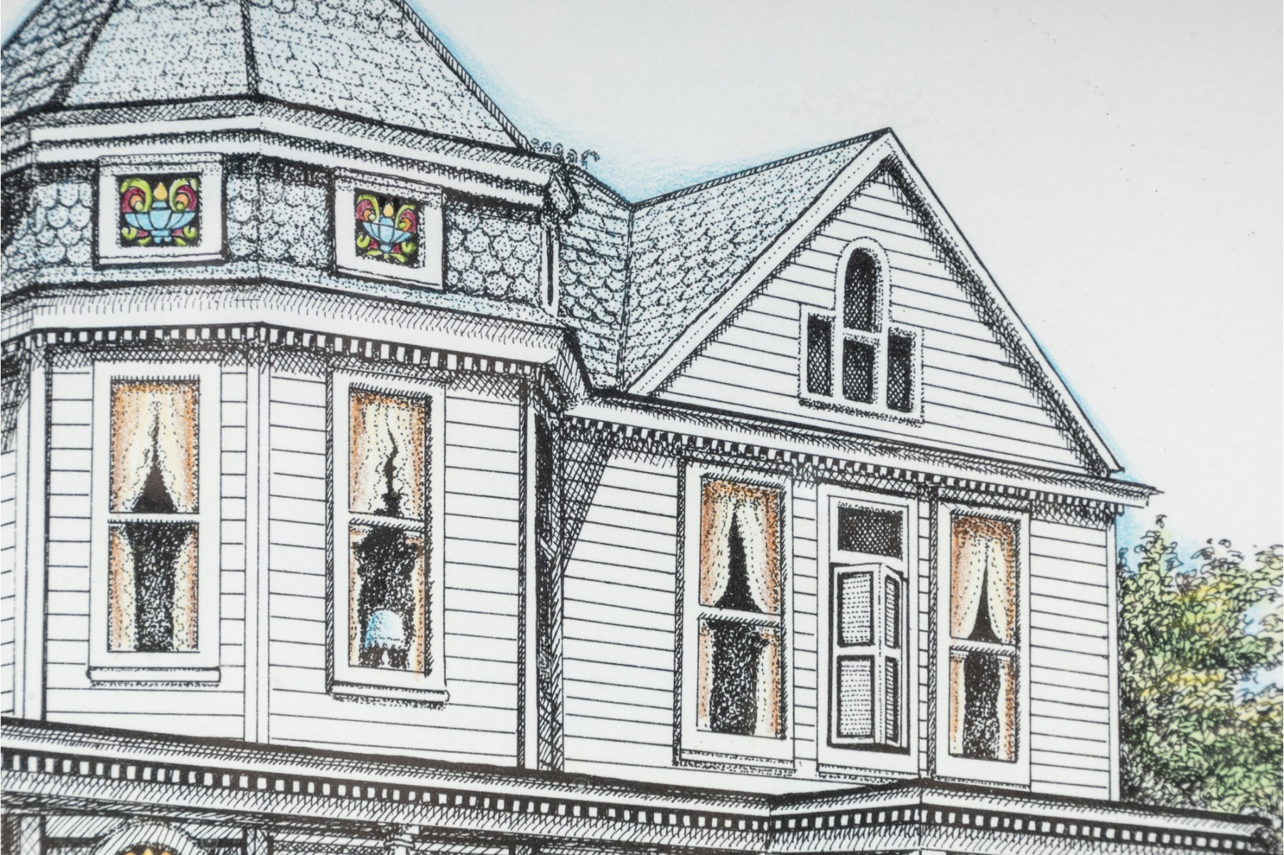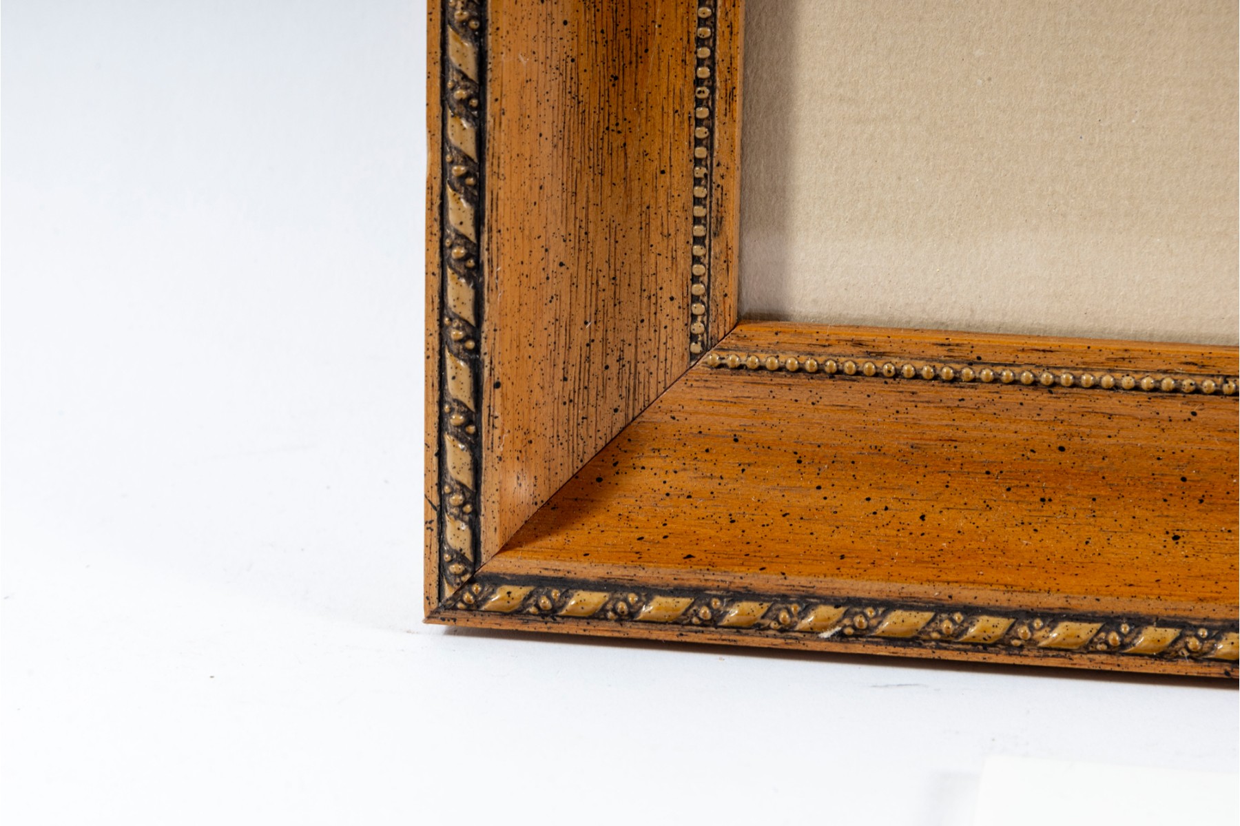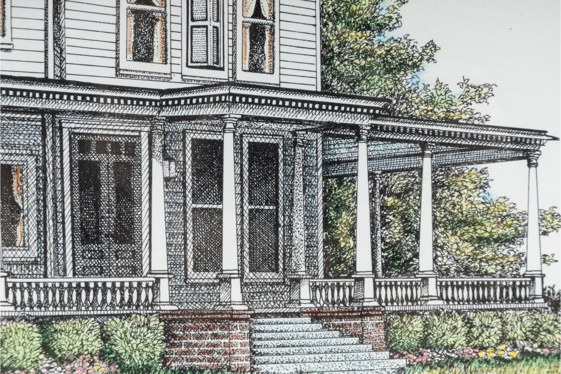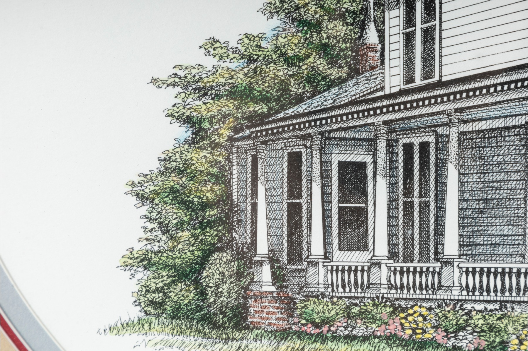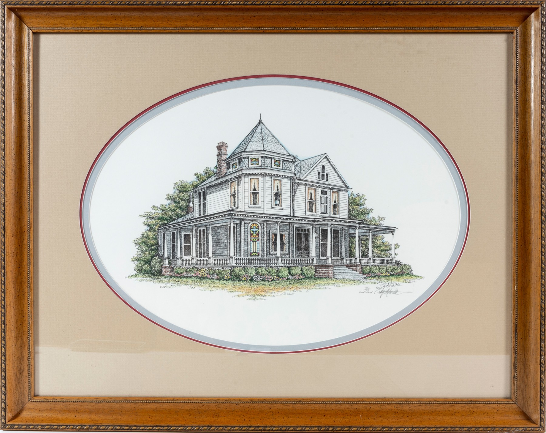A limited edition pencil signed and hand-colored lithograph numbered 13/75. The artwork depicts a detailed country estate set within a wood frame, faced with glass and accented with oval mat-borders. See photos for signature details.