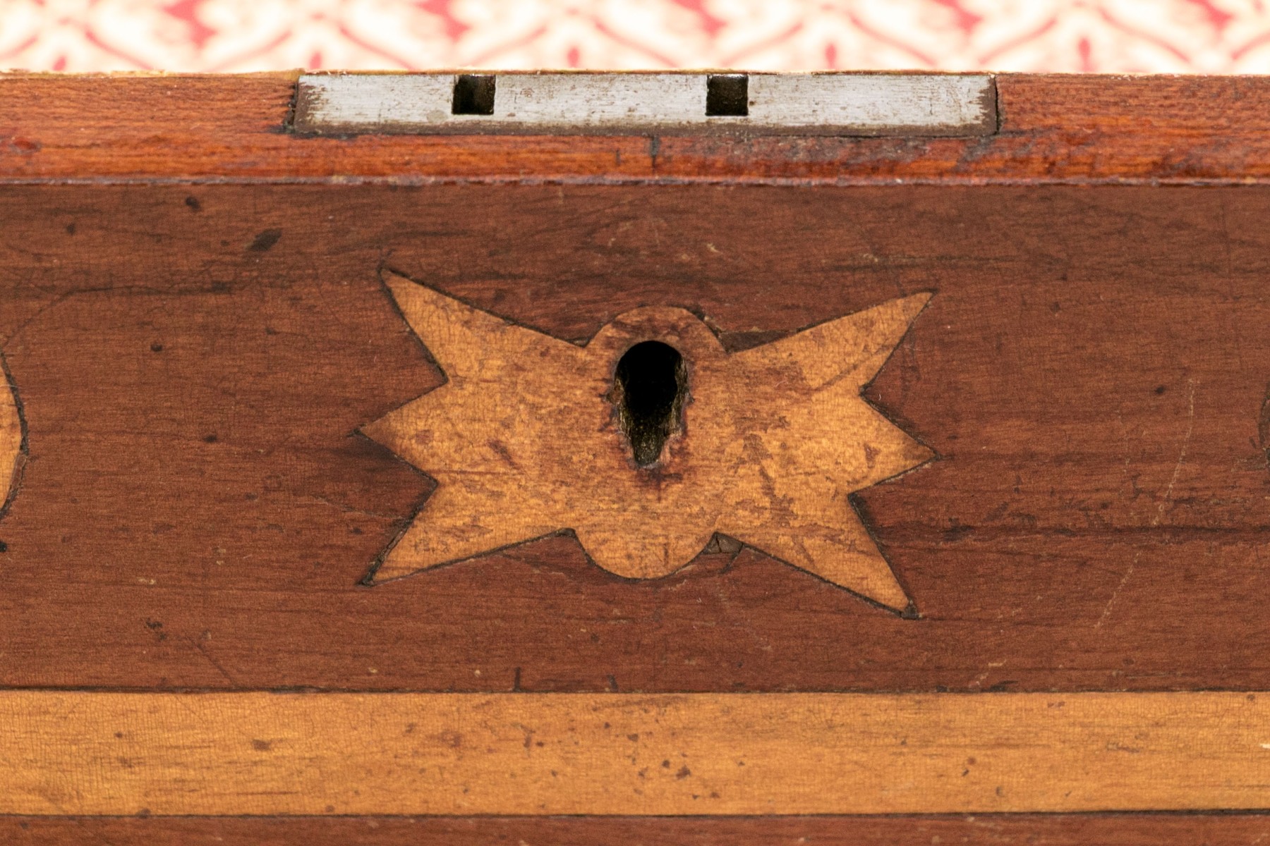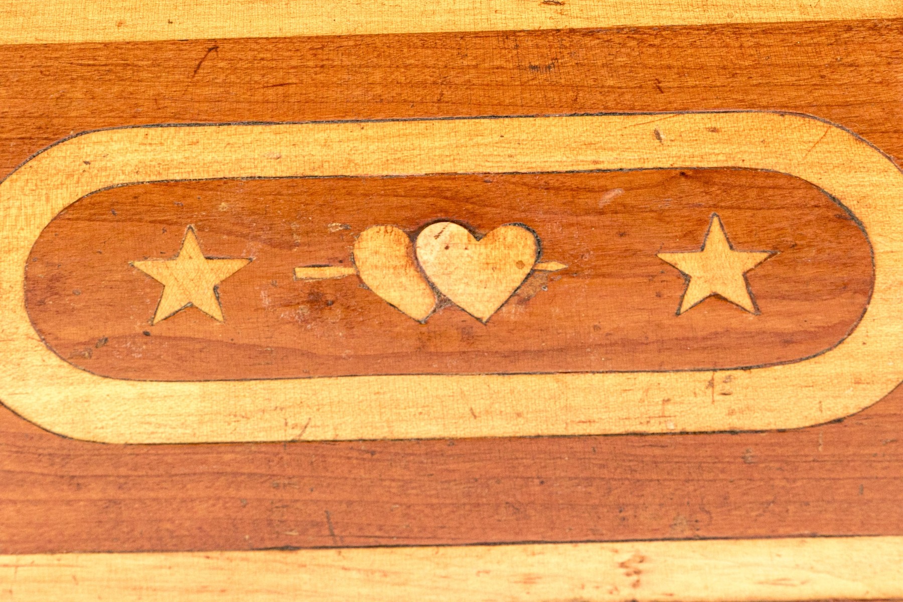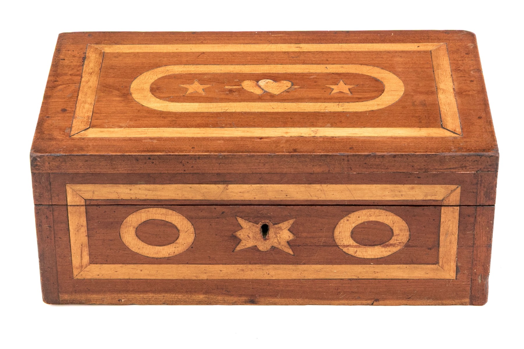 A beautiful antique American Pennsylvania Dutch sewing box, crafted in beautiful honeyed medium brown cherry wood with traditional marquetry maple inlays including rectangular bands, circular borders, and a center of two pierced hearts and two stars on the lid. The hinged lid opens to an interior lined in wonderful cream and red lattices detailed with lions and fleur-de-lis motifs.