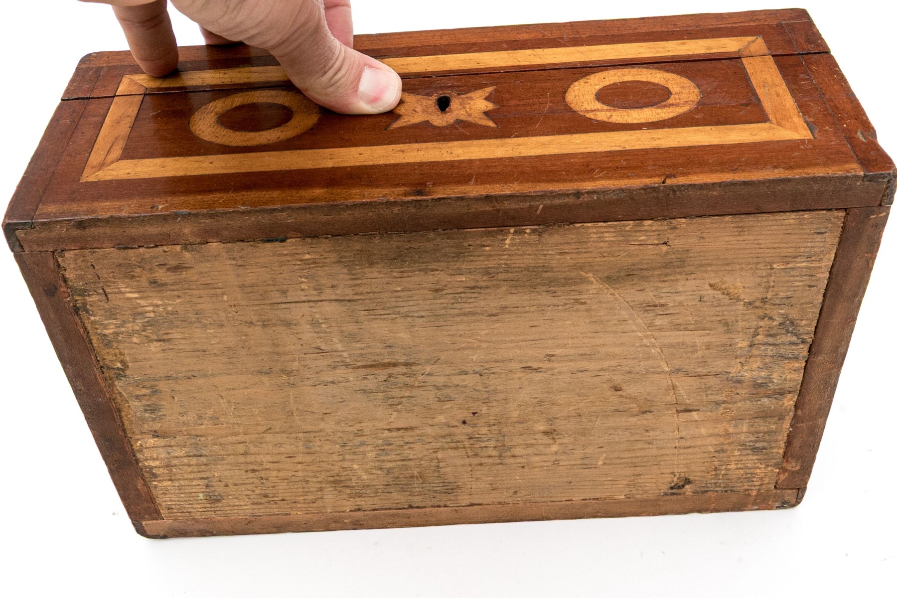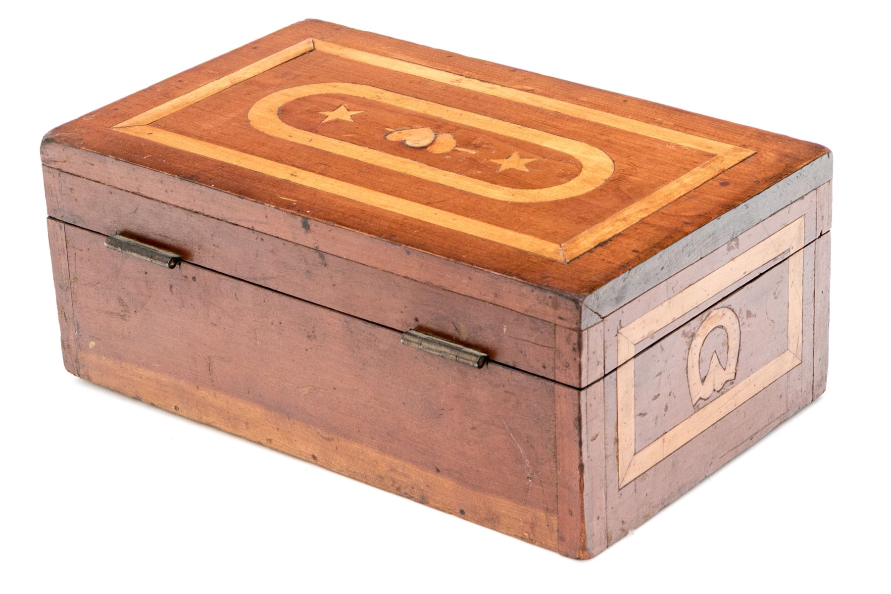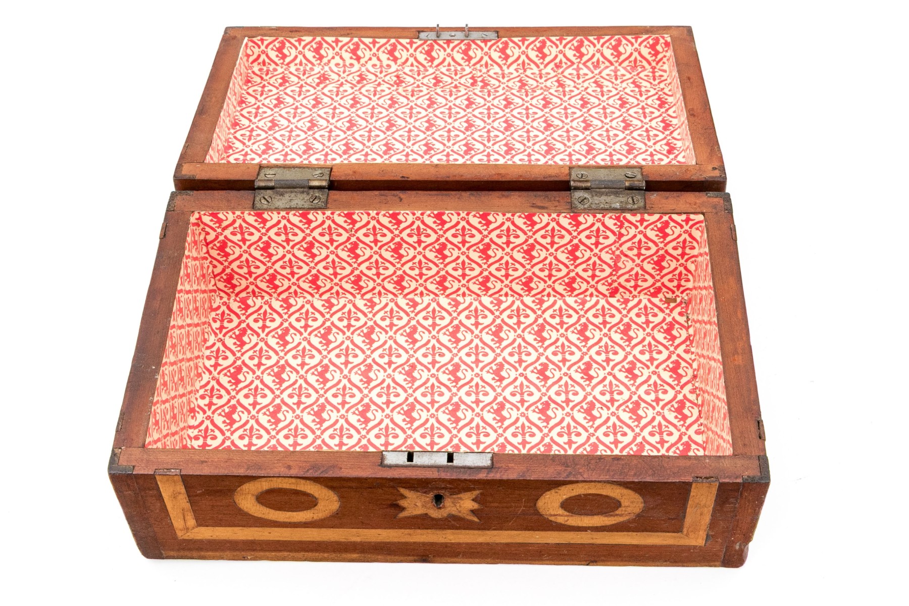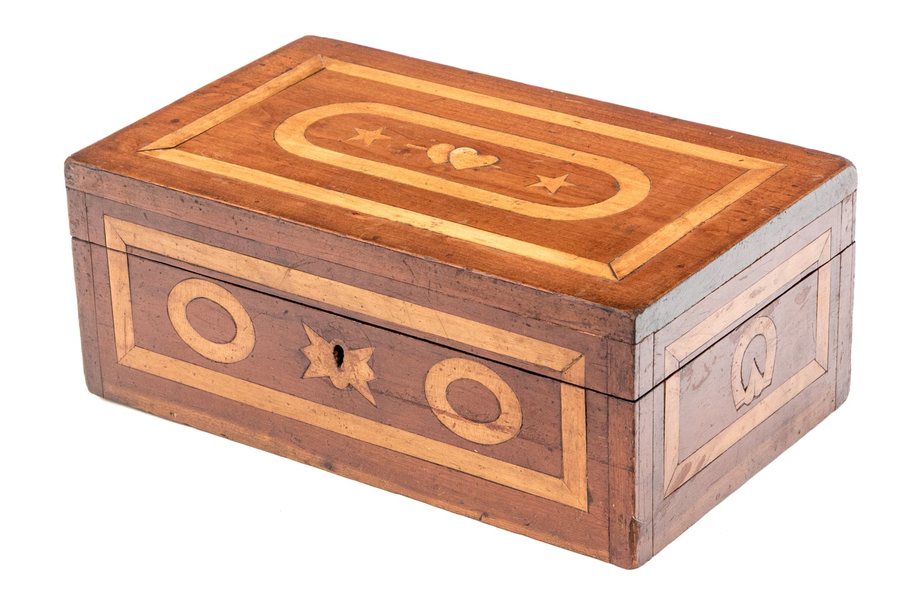 A beautiful antique American Pennsylvania Dutch sewing box, crafted in beautiful honeyed medium brown cherry wood with traditional marquetry maple inlays including rectangular bands, circular borders, and a center of two pierced hearts and two stars on the lid. The hinged lid opens to an interior lined in wonderful cream and red lattices detailed with lions and fleur-de-lis motifs.