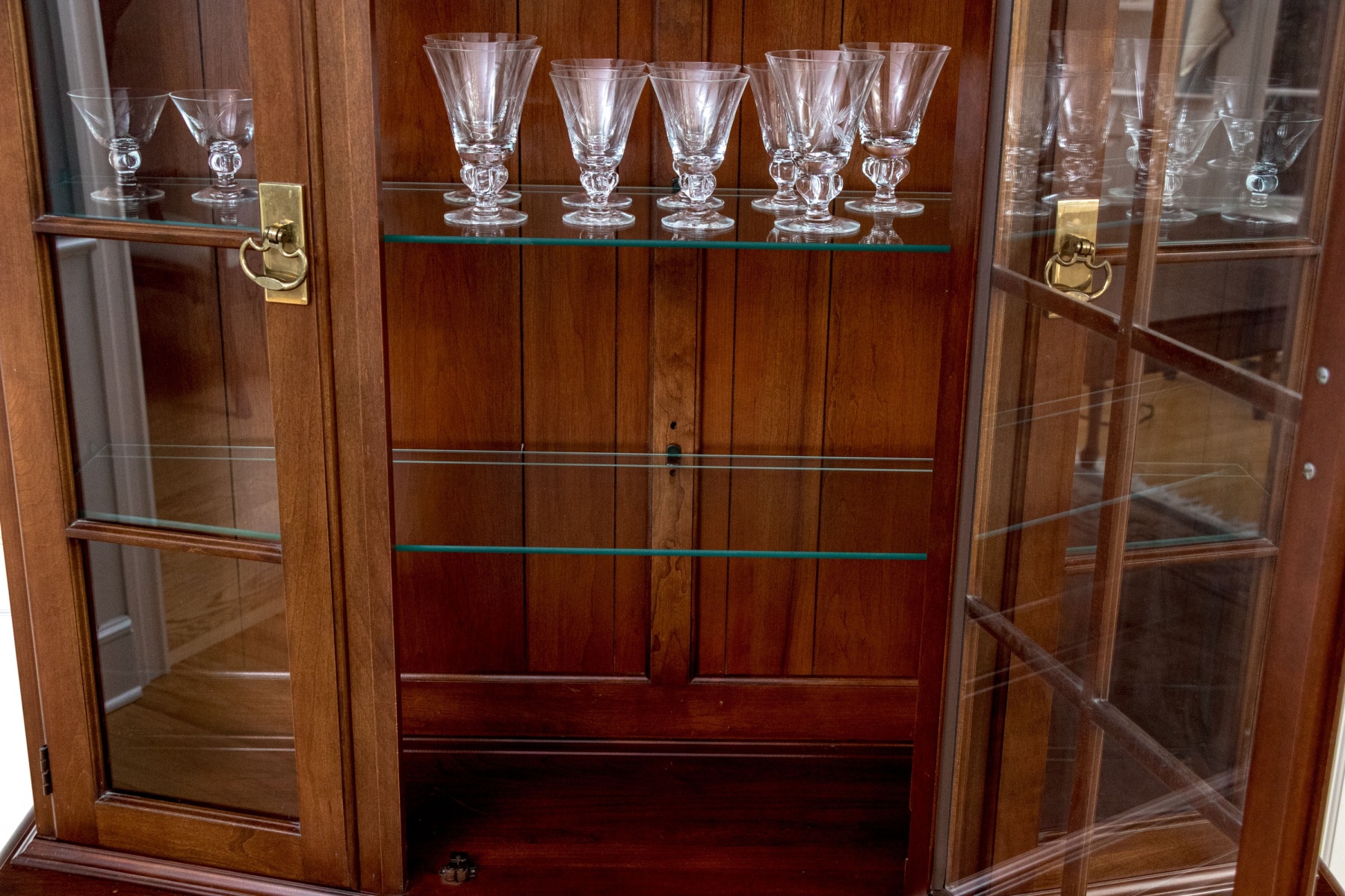 The lower case sports a two-over-two arrangement of drawers at the centers, each with brass bail handles on classic batwing plaques. Cabinet doors with arched paneling flanks the drawers, adorned with stylish key handle knobs.