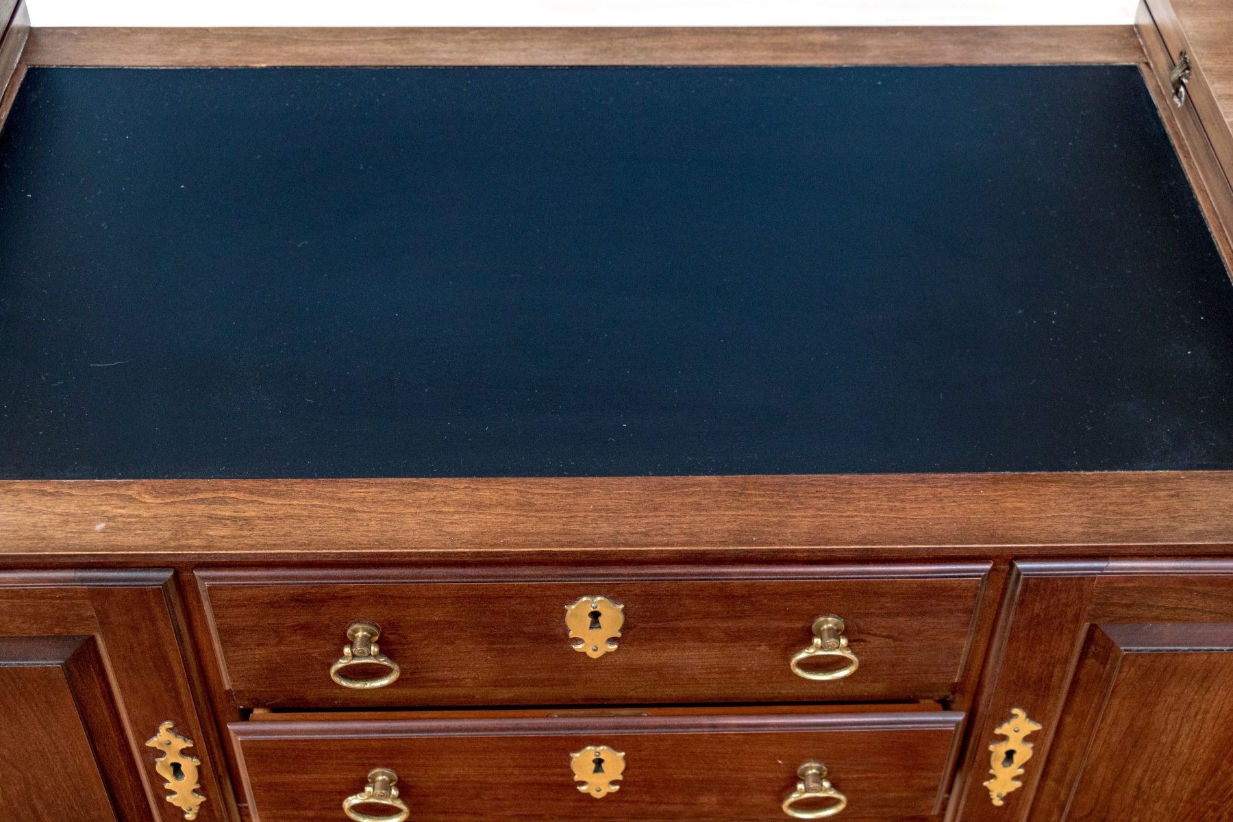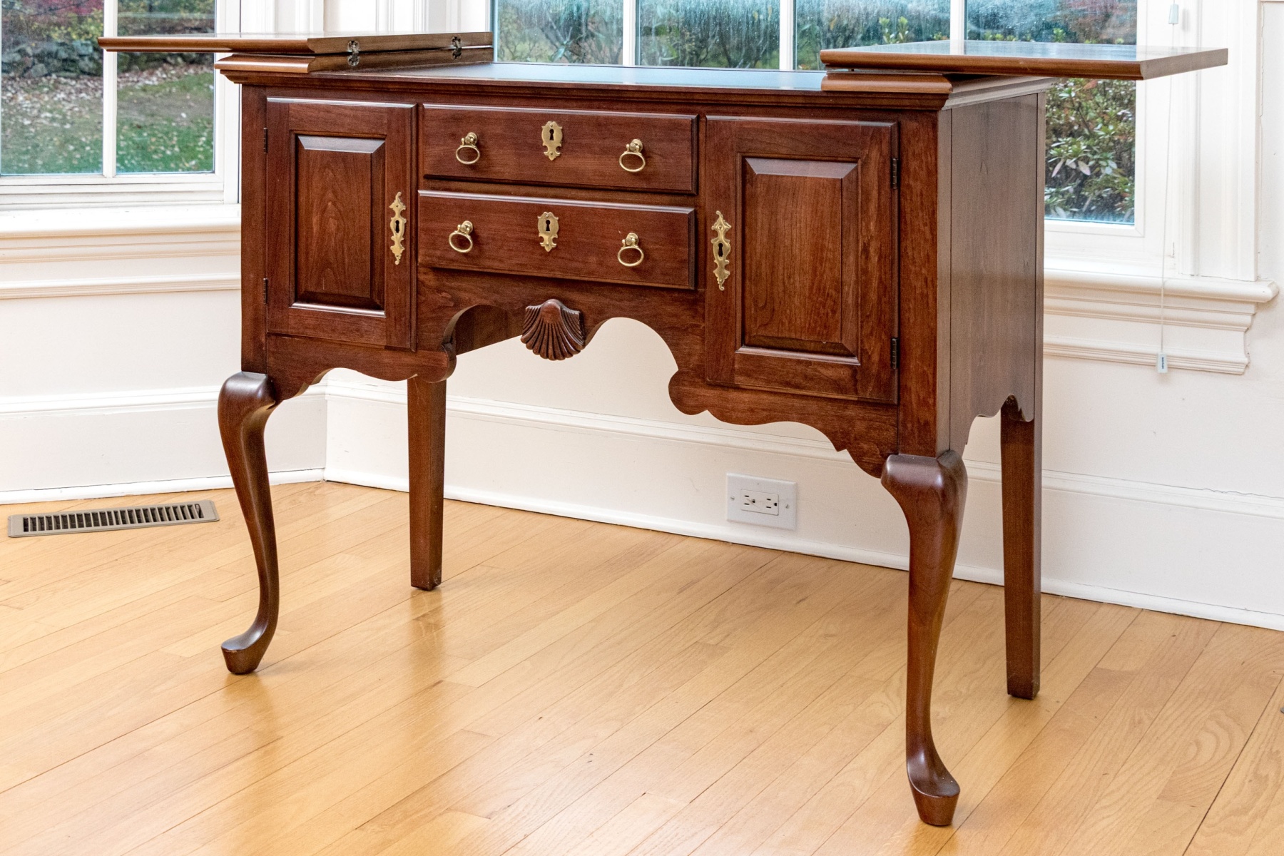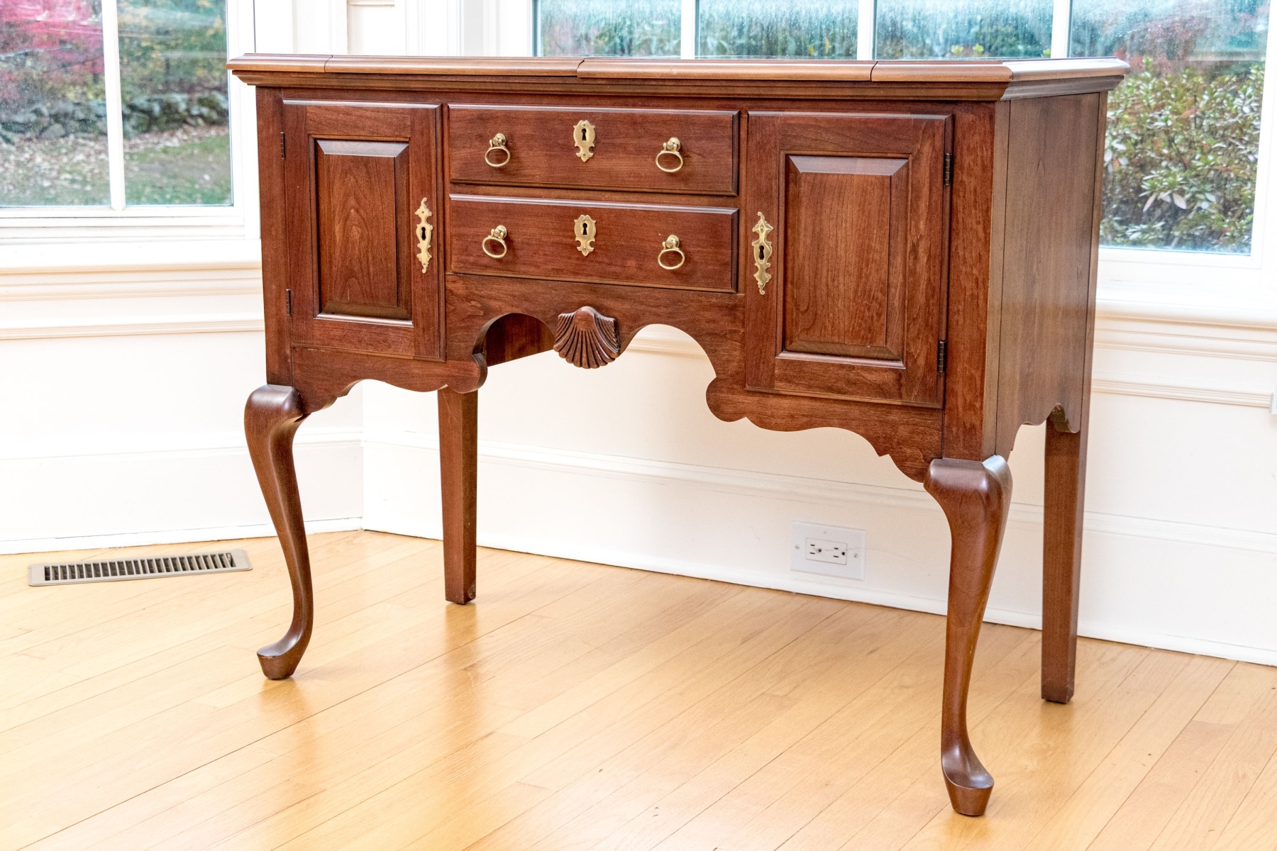 A handsome Pennsylvania House buffet server with great Queen Anne and Georgian appeal, well crafted with a rich, warm-toned medium brown finish. The server features a rectangular top with two hinges wings that can flip out to extend the table surface. Below, the case features two drawers with brass loop handles flanked by cabinet doors with beveled paneling and highly decorative brass key escutcheons. Finished with a scalloped apron featuring a carved shell motif at the center crest. Raised on classic cabriole front legs with slipper feet. Includes a key.