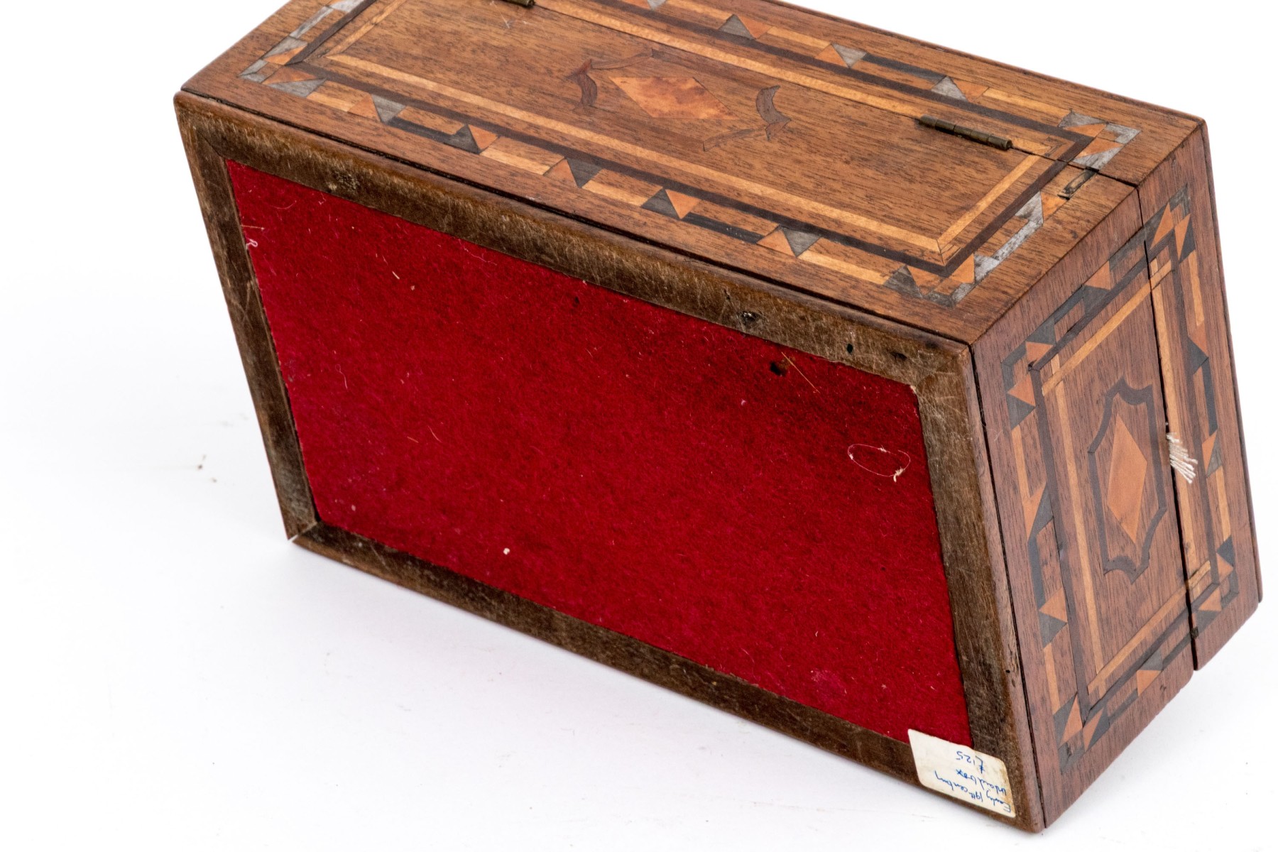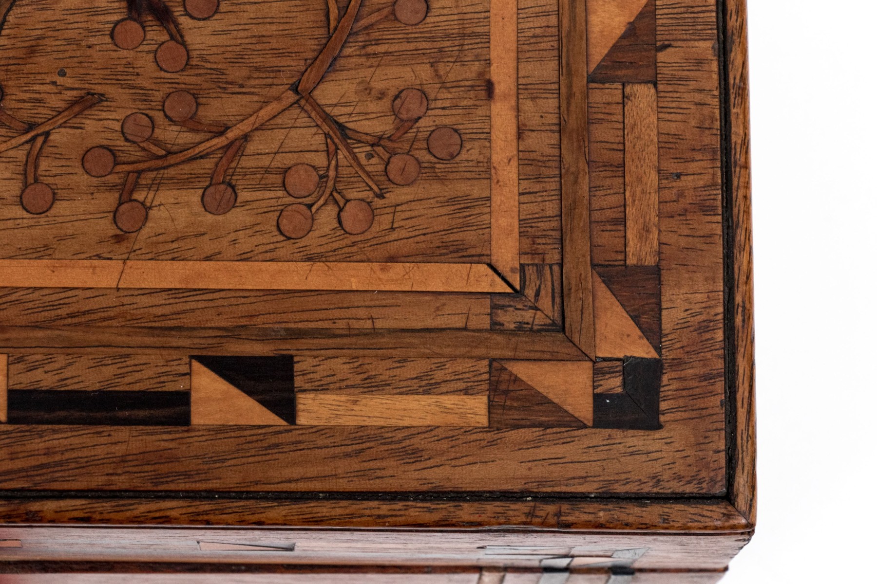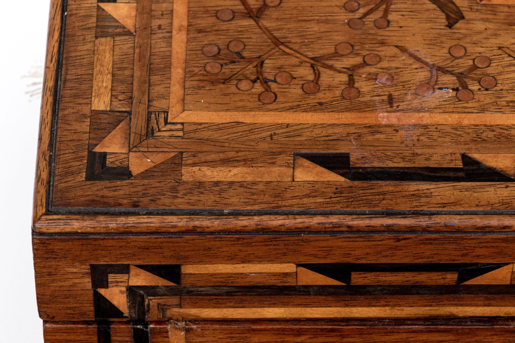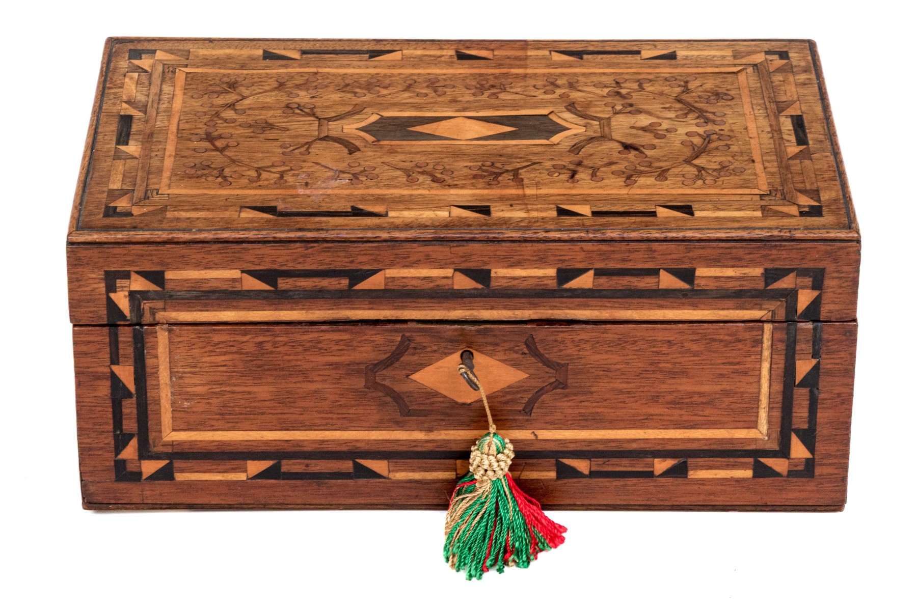 A handsome antique wood box elaborately decorated with geometric inlaid borders around a marquetry scene of vining branches on the lid. The hinged lid opens to an interior lined with yellow and green patterned paper. Lined in red felt underfoot.