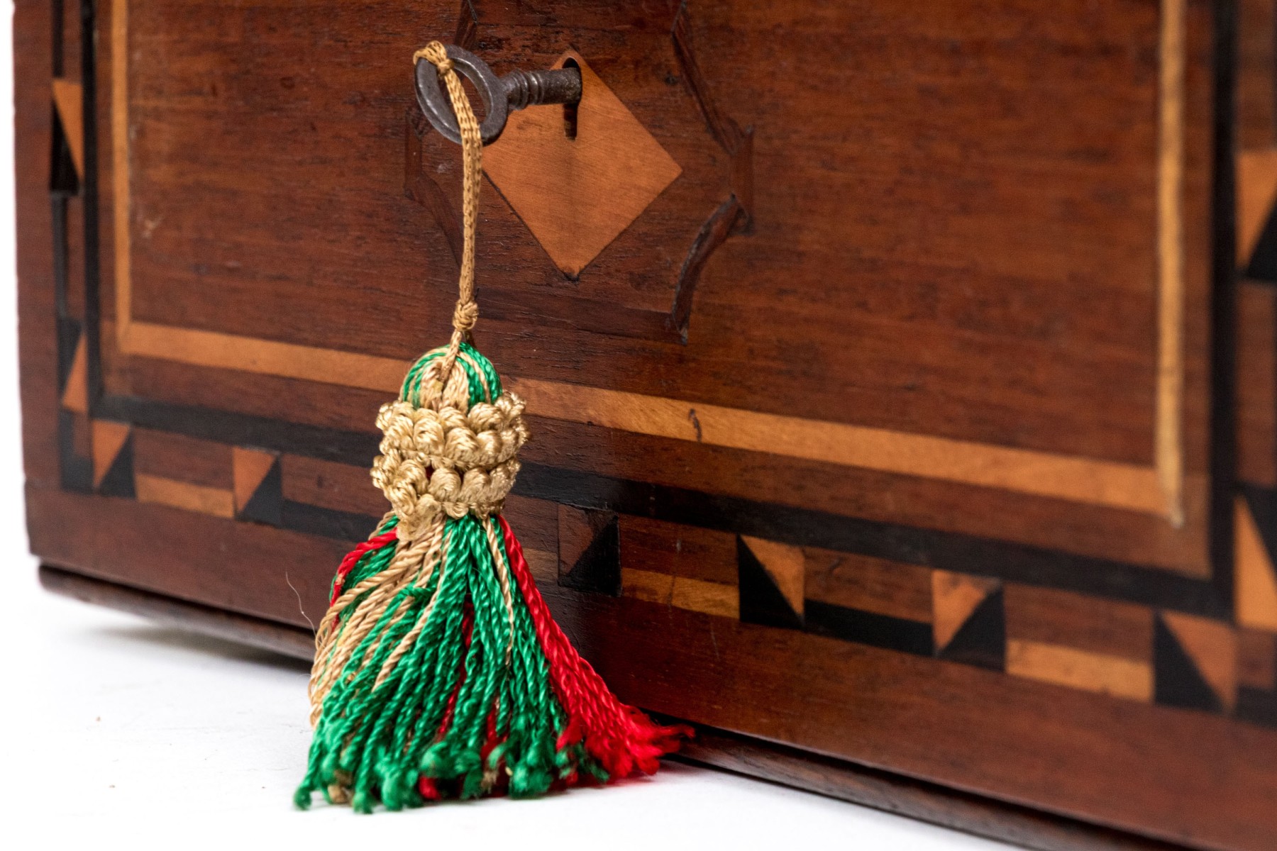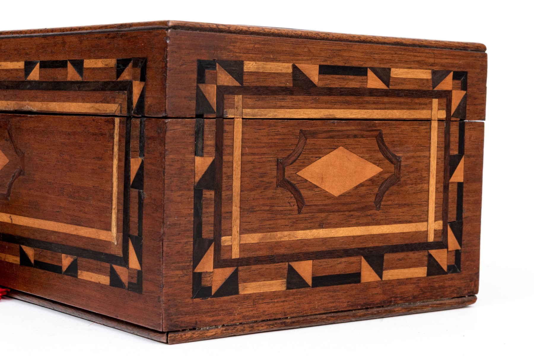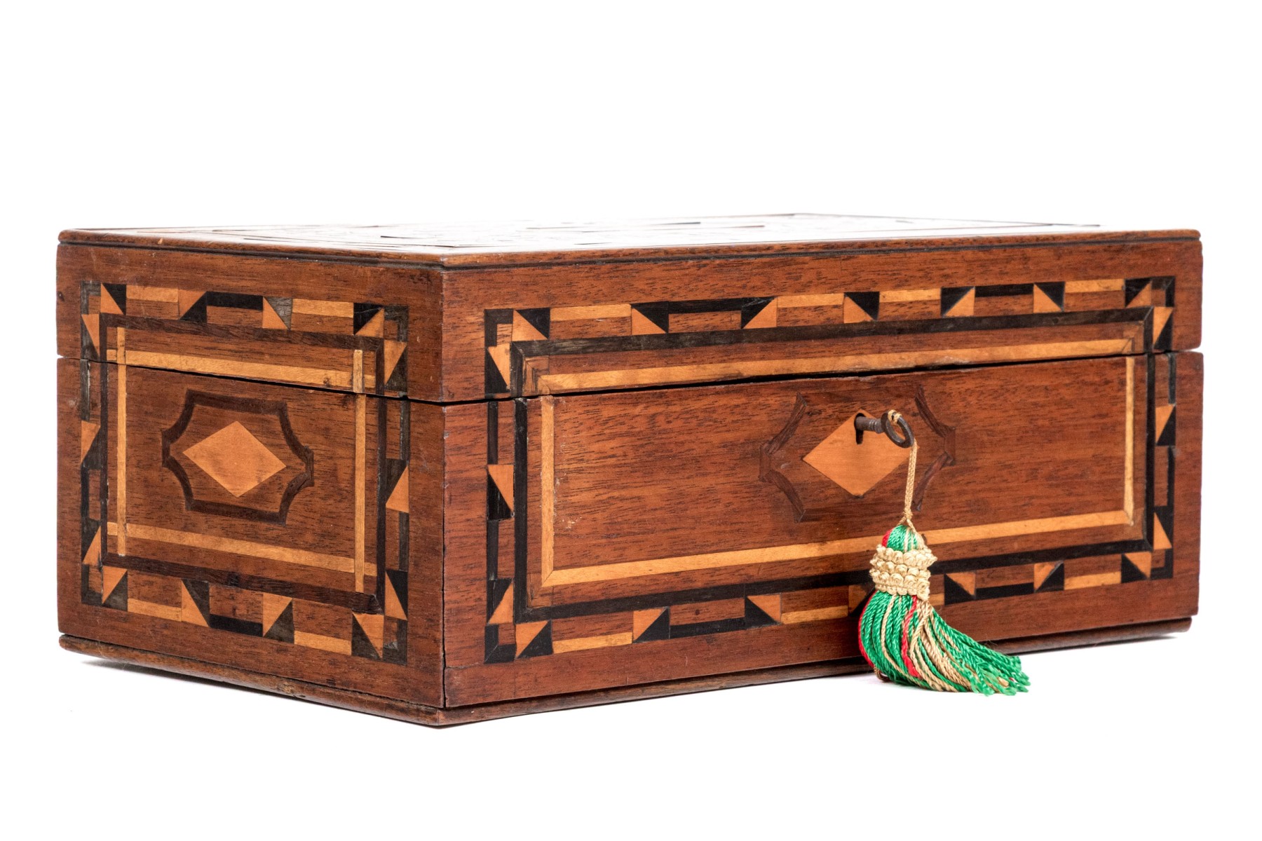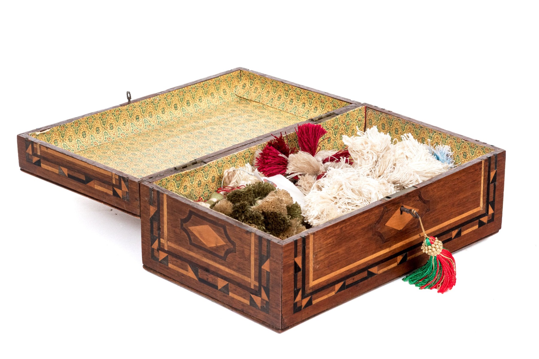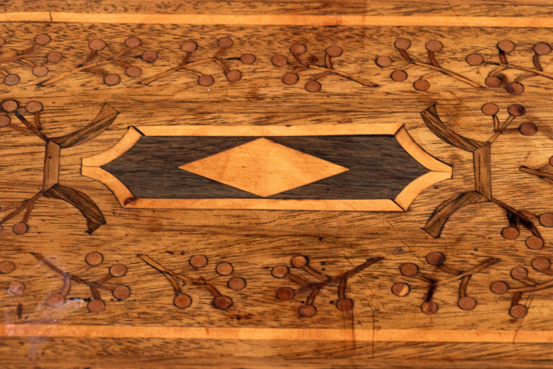 A handsome antique wood box elaborately decorated with geometric inlaid borders around a marquetry scene of vining branches on the lid. The hinged lid opens to an interior lined with yellow and green patterned paper. Lined in red felt underfoot.