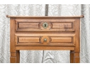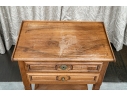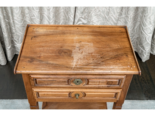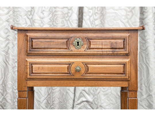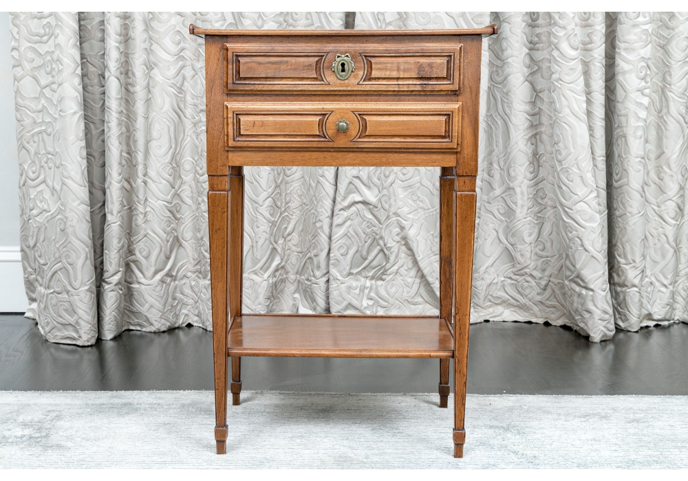 A French Antique table with soft worn wood with tapering legs, Gallery top, dove-tail drawer construction and a particularly fine form. One drawer with a key pull (Not the original key and used for function) and Swag and Bow escutcheon, the other drawer with a delicate brass pull.