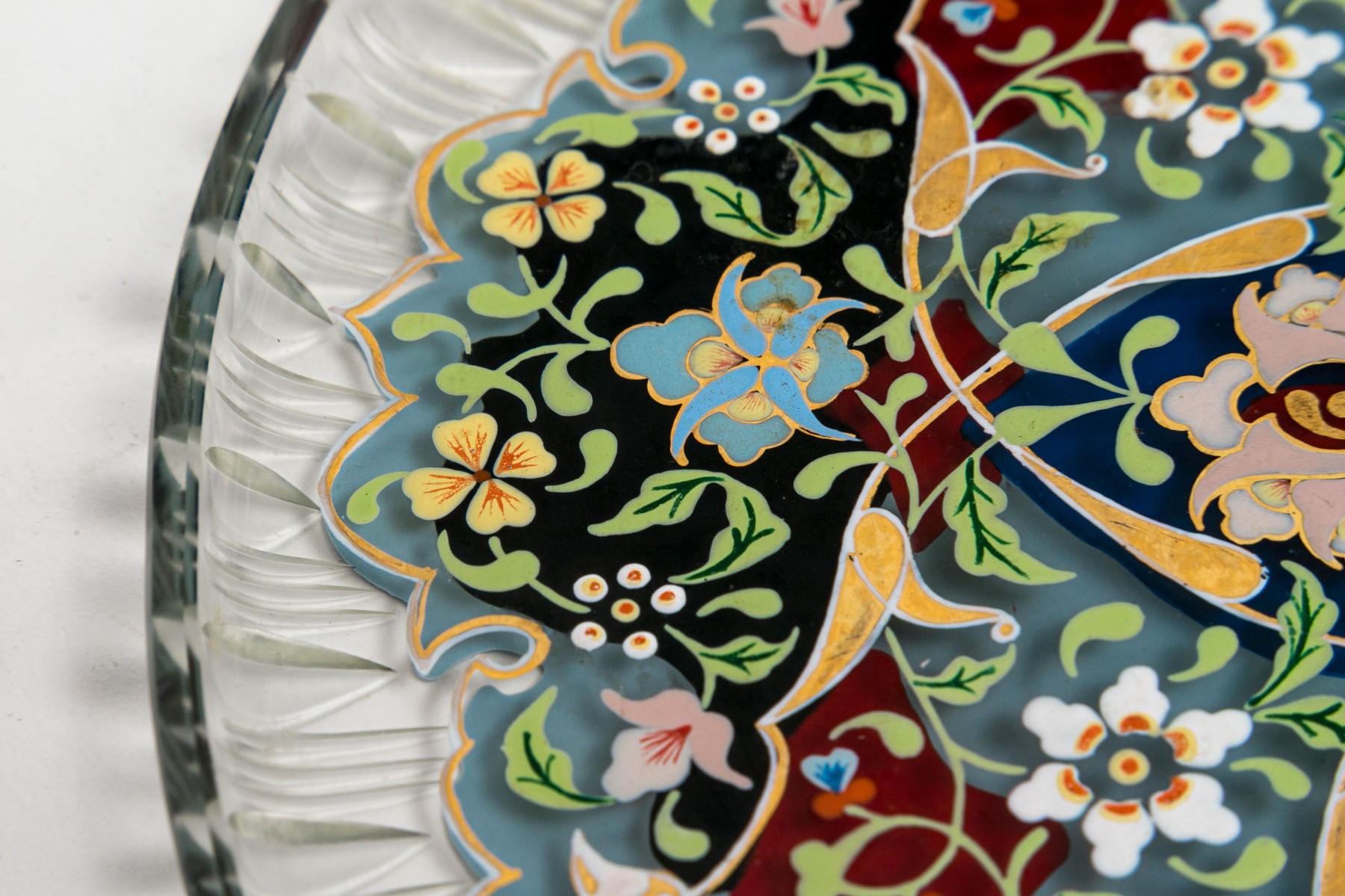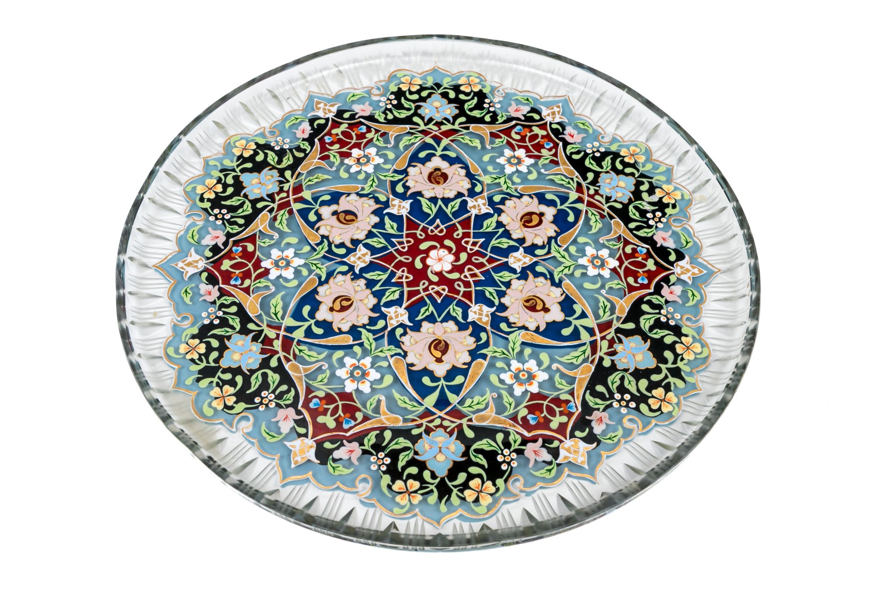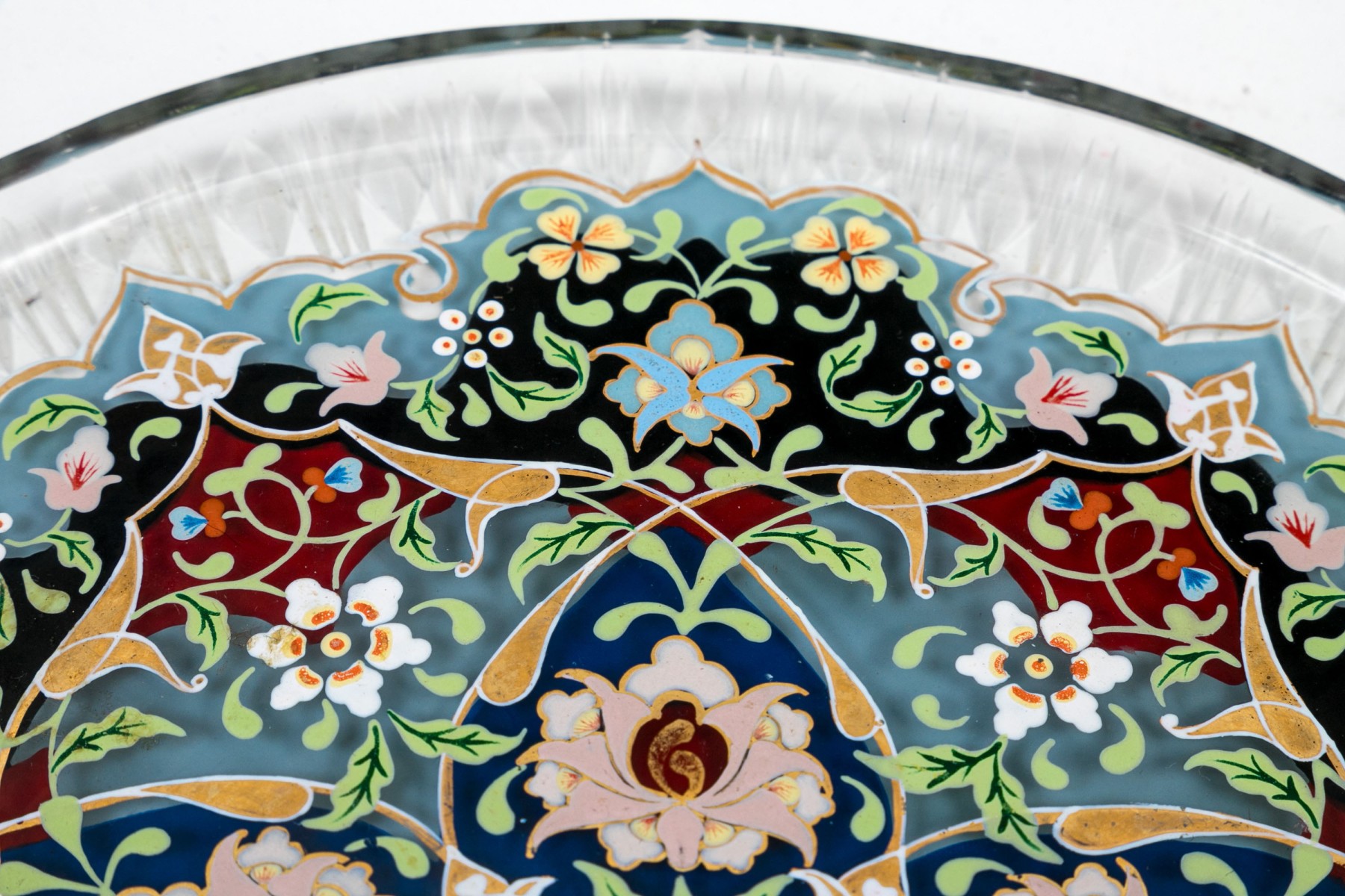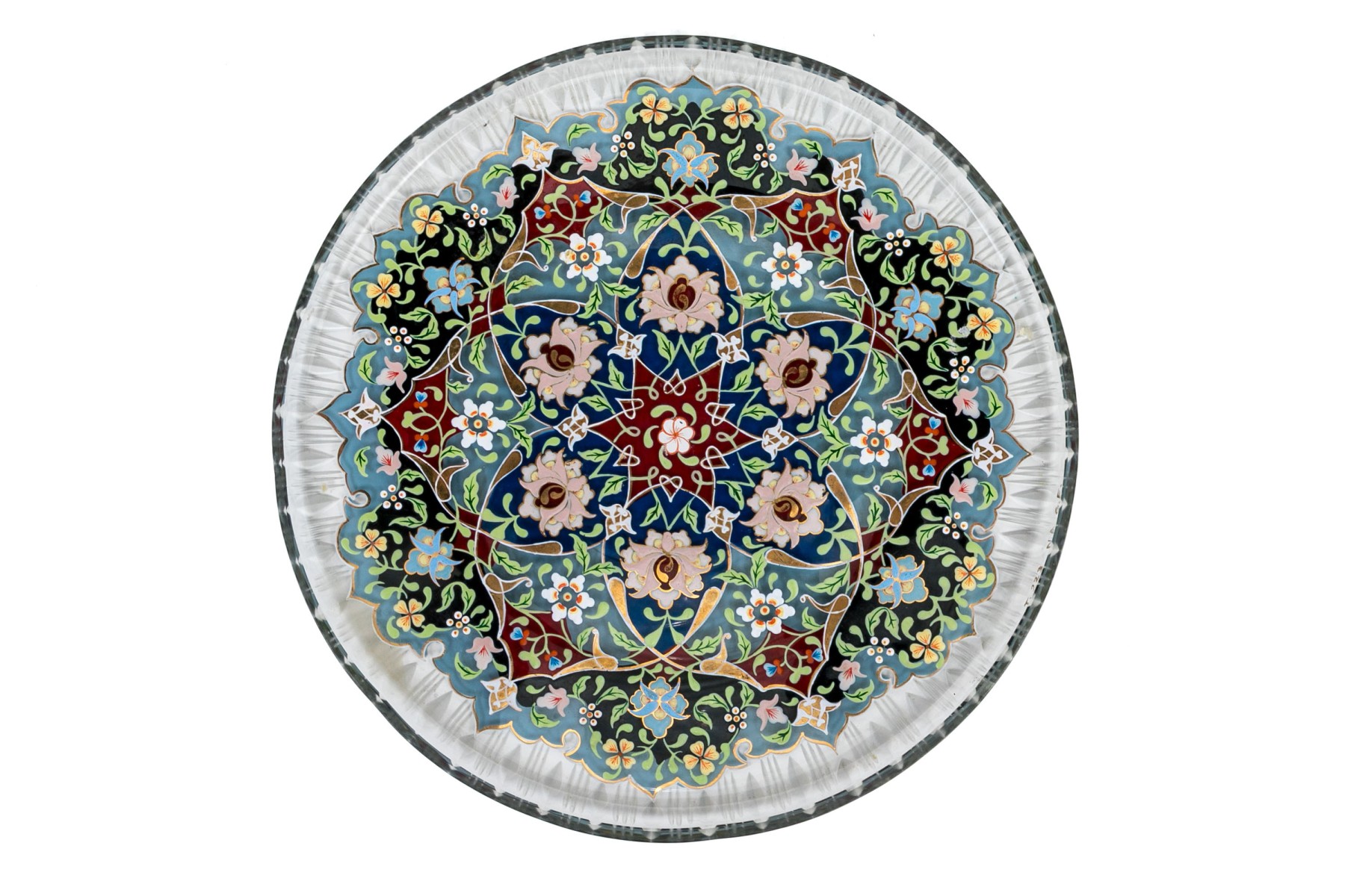 A finely decorated round glass plate with cut rim band and overall colorful classic Persian floral motifs with gilt accents. Enameled on verso as well in red, blue and black.