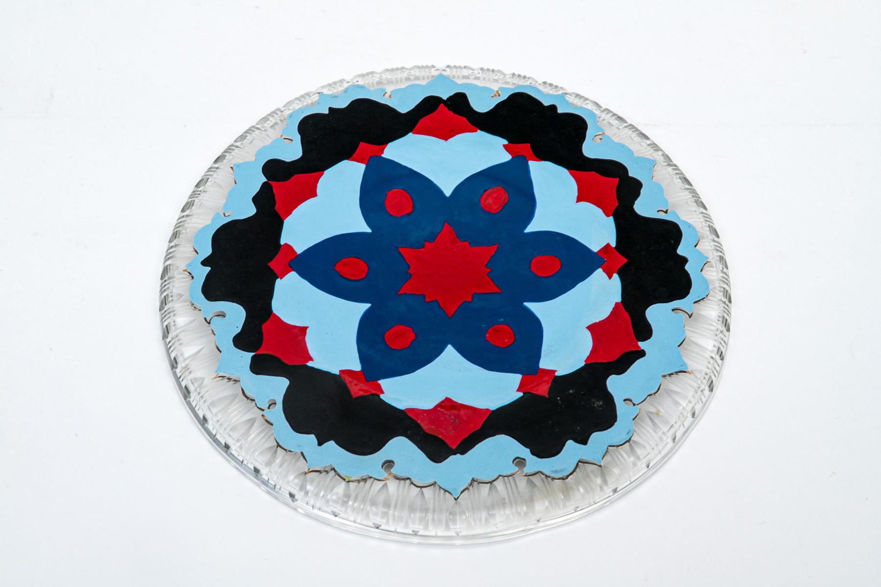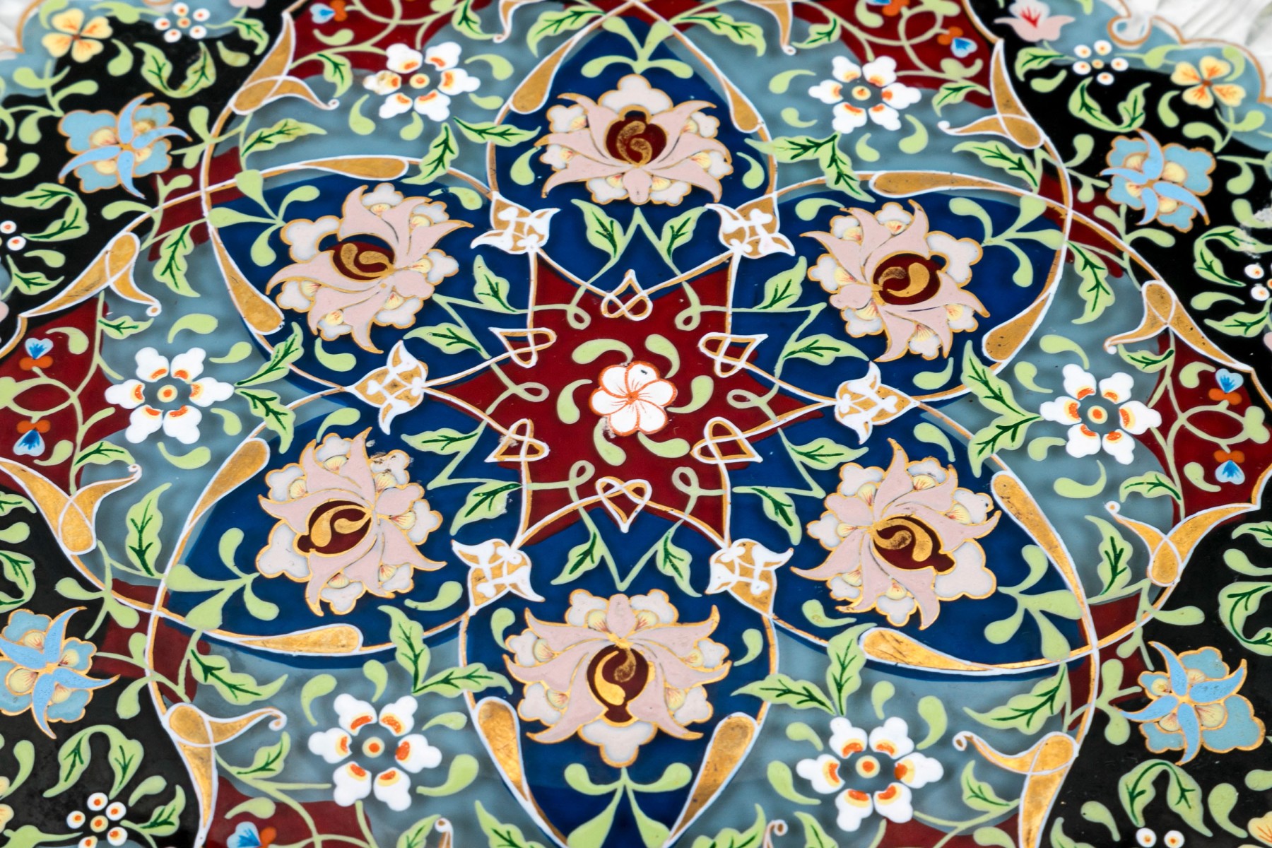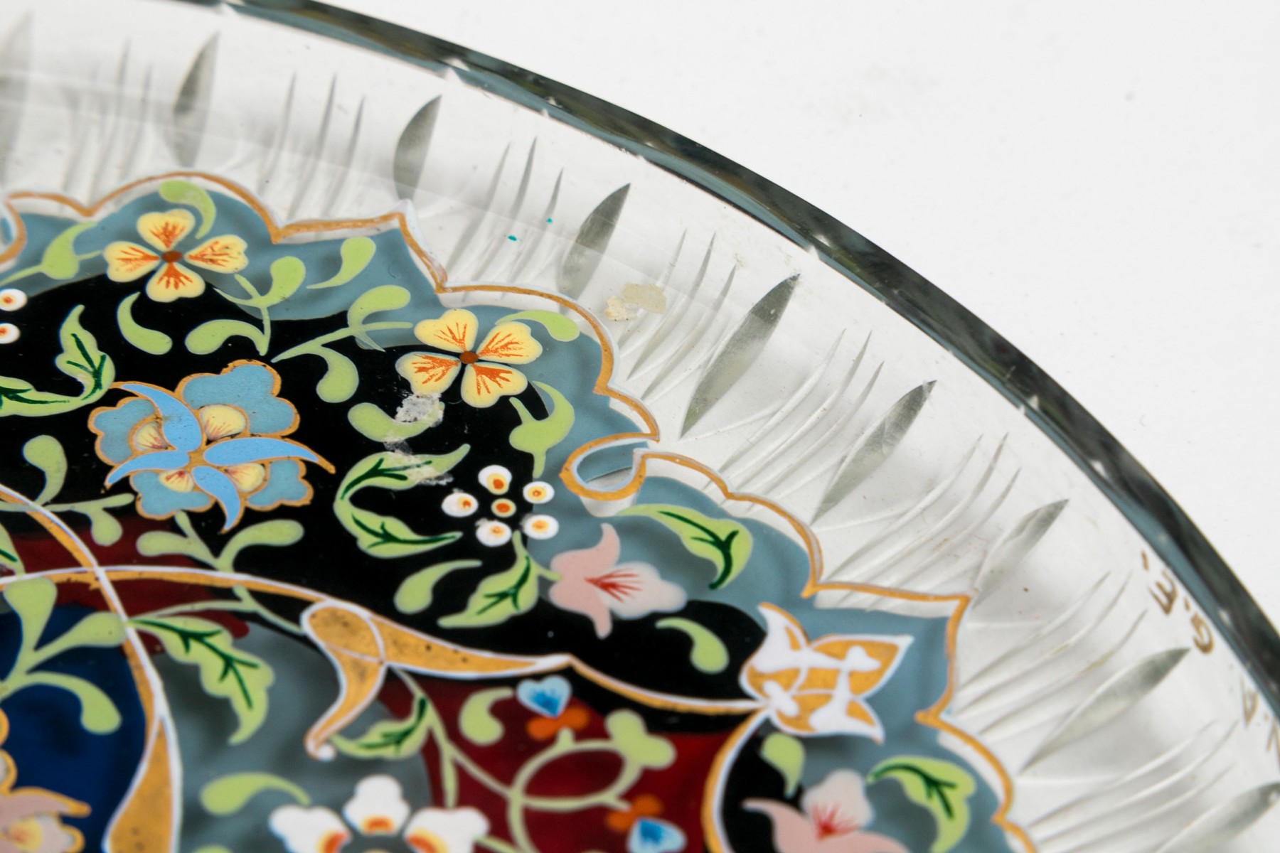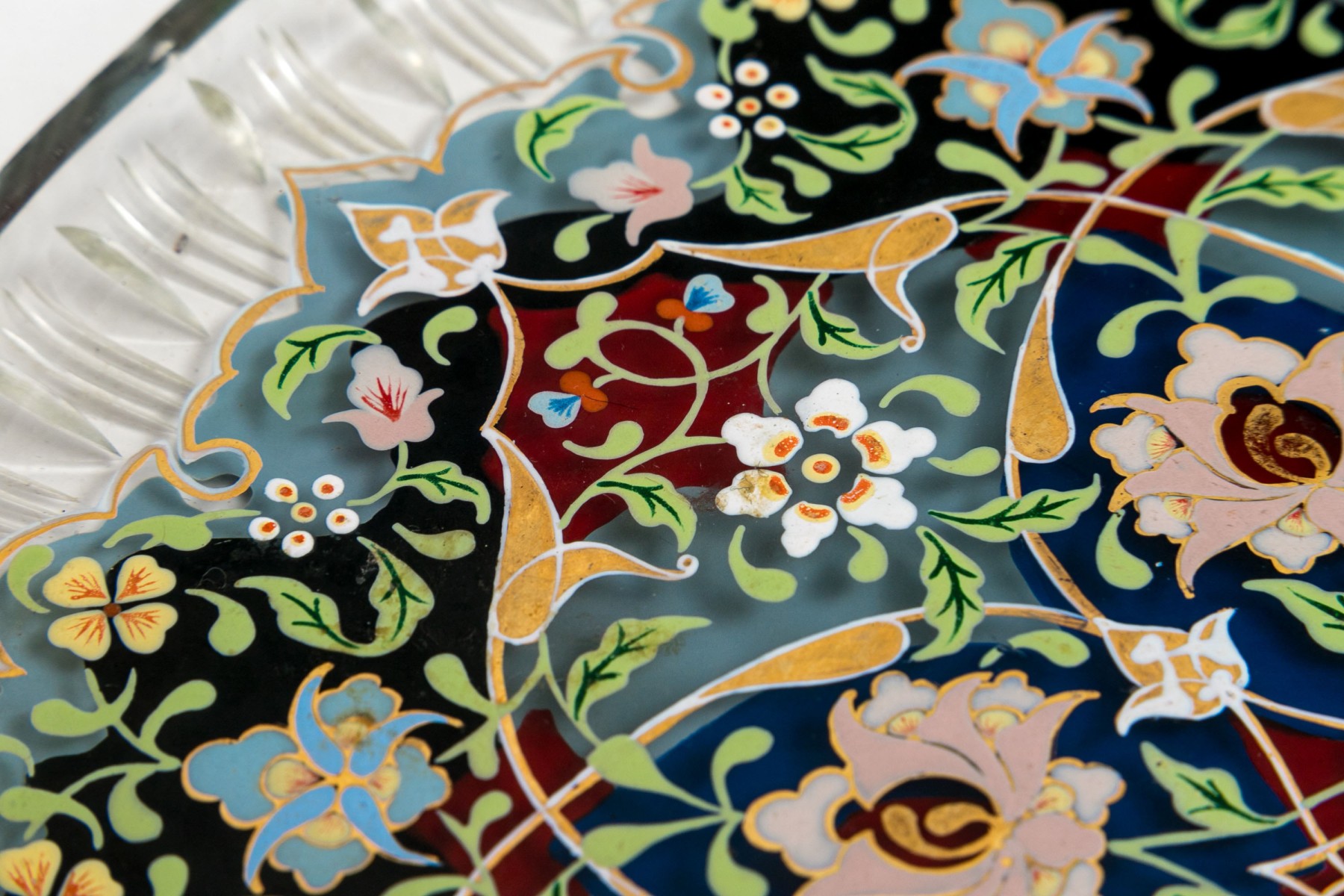 A finely decorated round glass plate with cut rim band and overall colorful classic Persian floral motifs with gilt accents. Enameled on verso as well in red, blue and black.