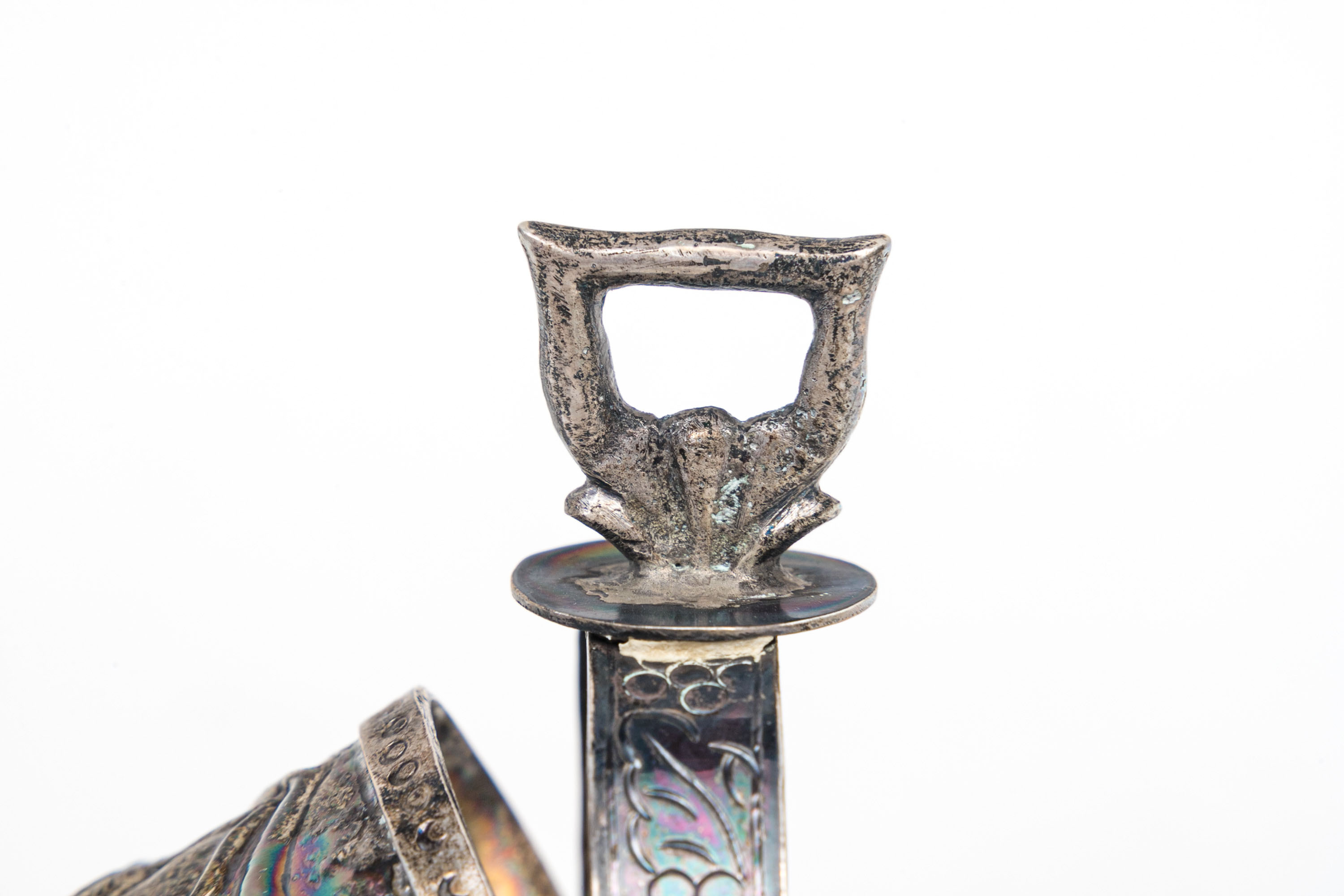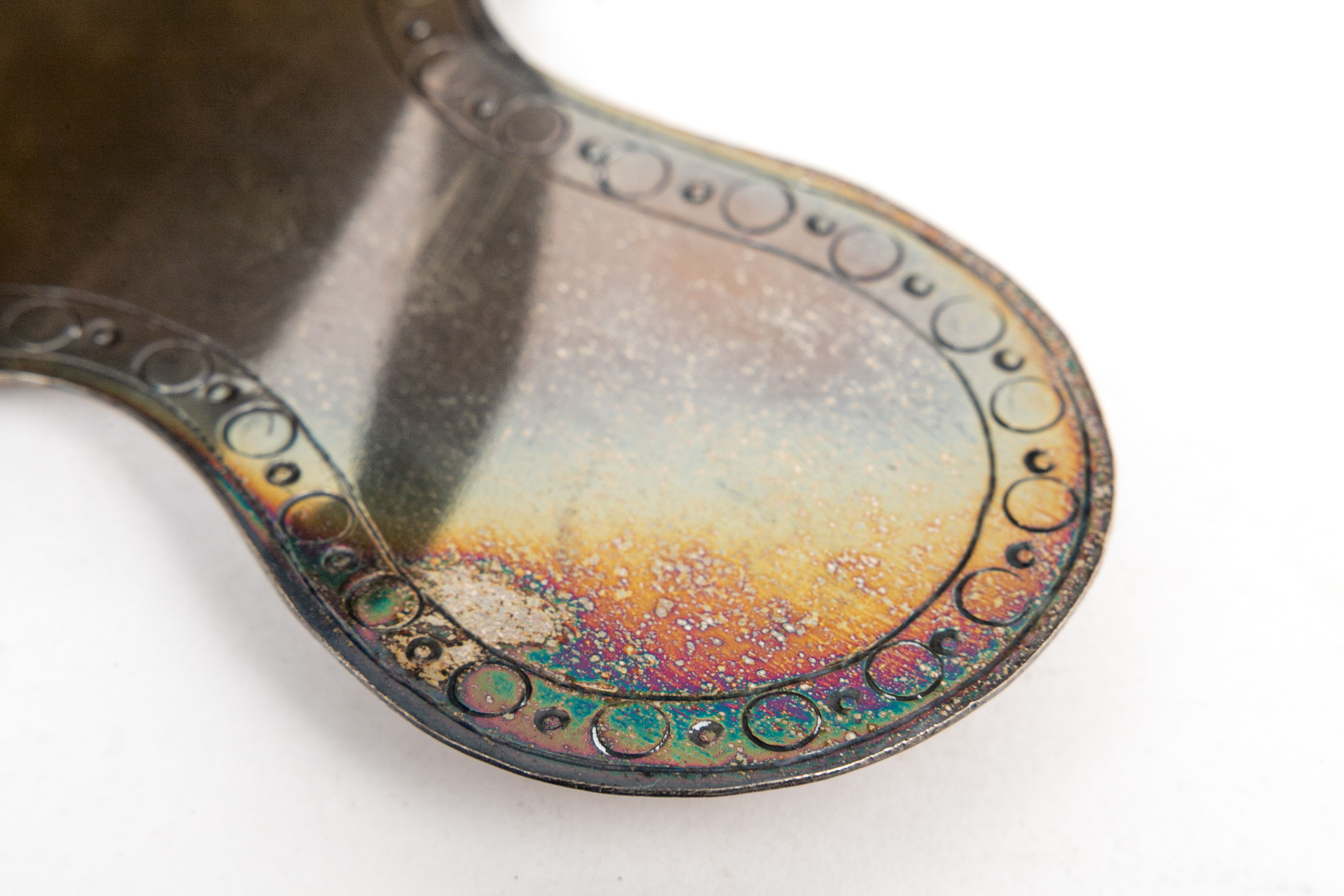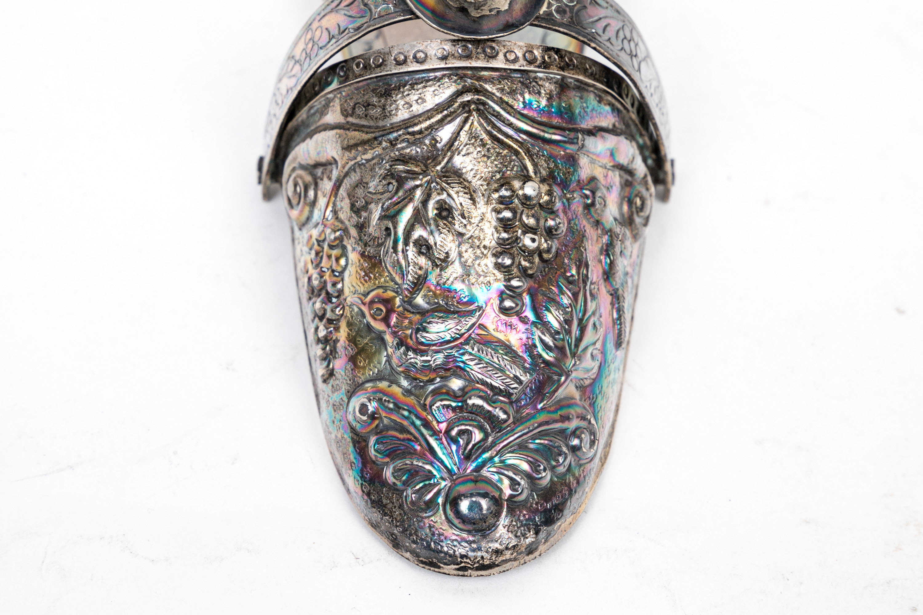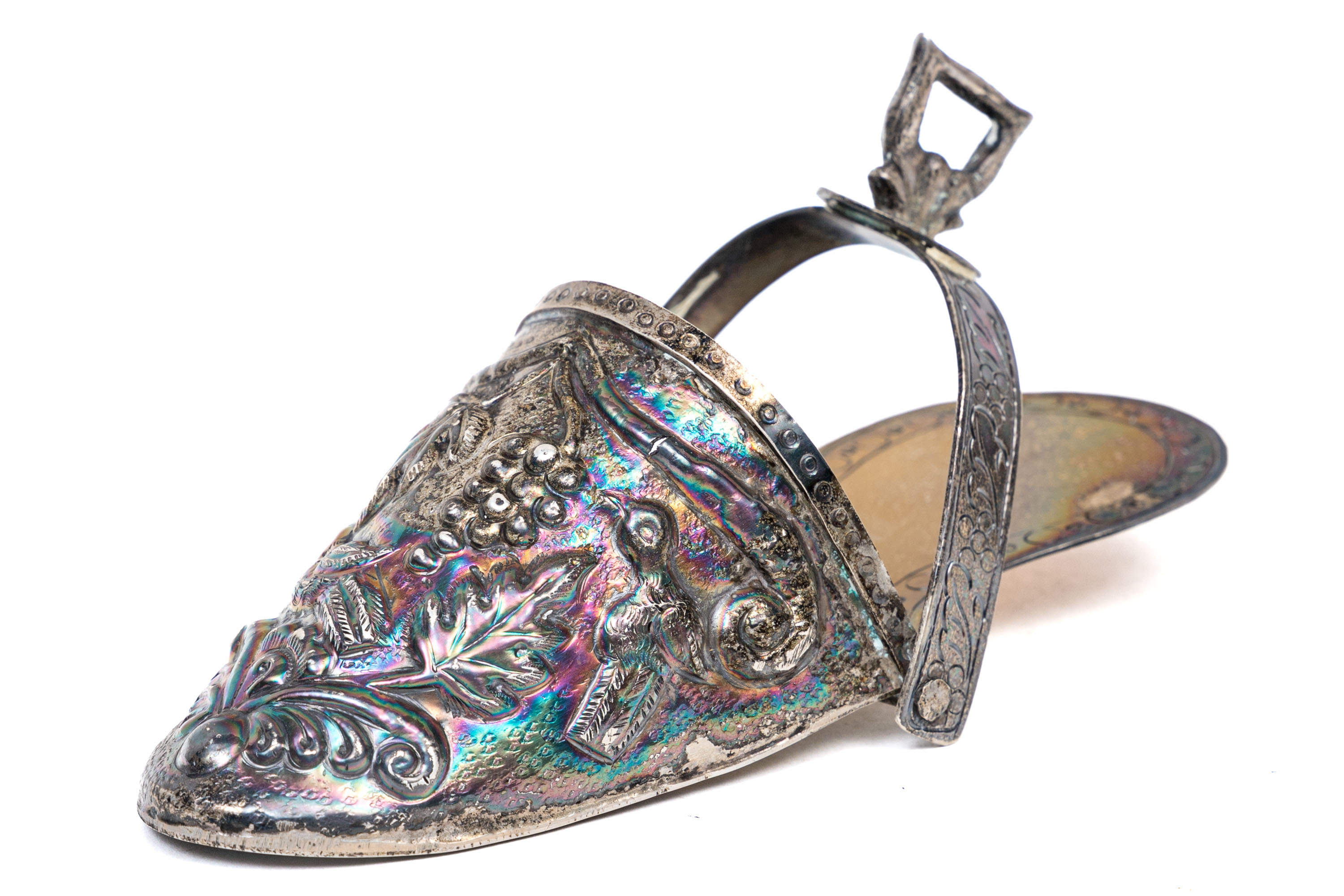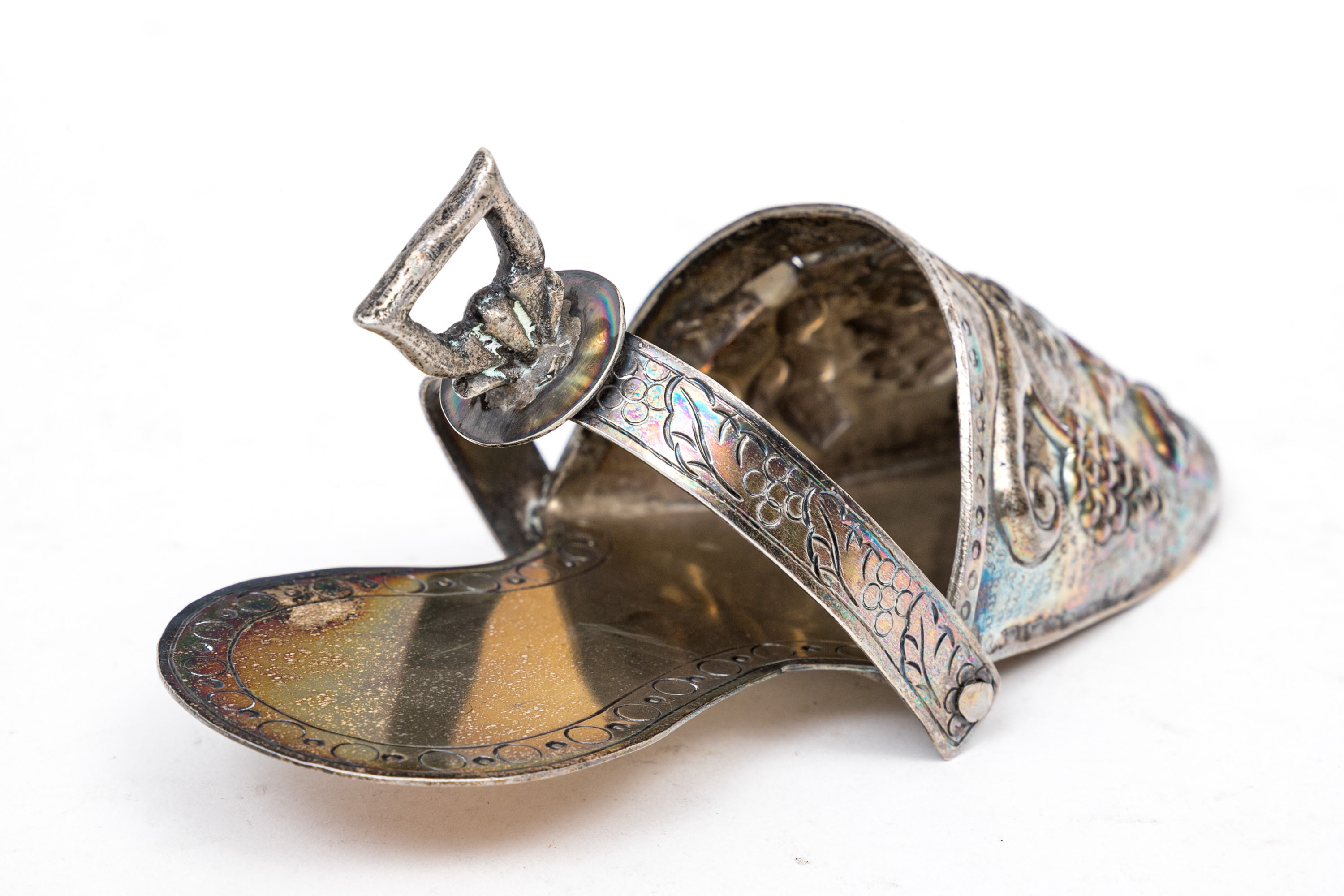 An open slipper shaped object with repousse grape vine pattern and adjustable strap.