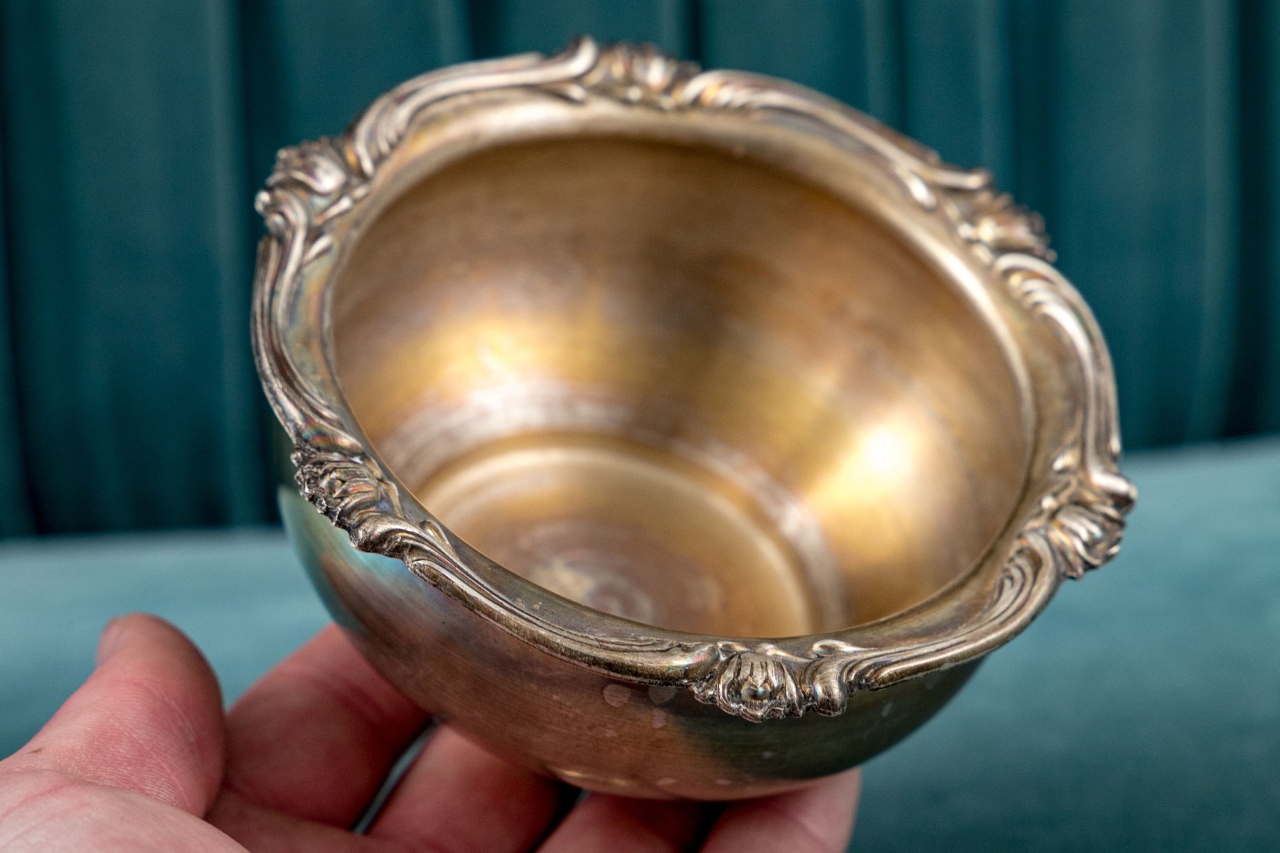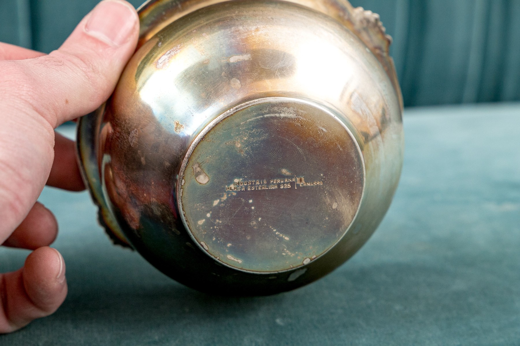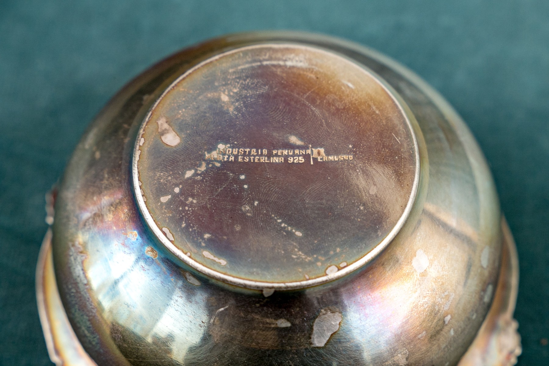 A delightful Peruvian Camusso sterling silver bowl showcasing a flared with with elegant repousse floral buds and flourished vines. The bowl features a deep, curved form with a slight foot, making for an elegant design. Marked underfoot.