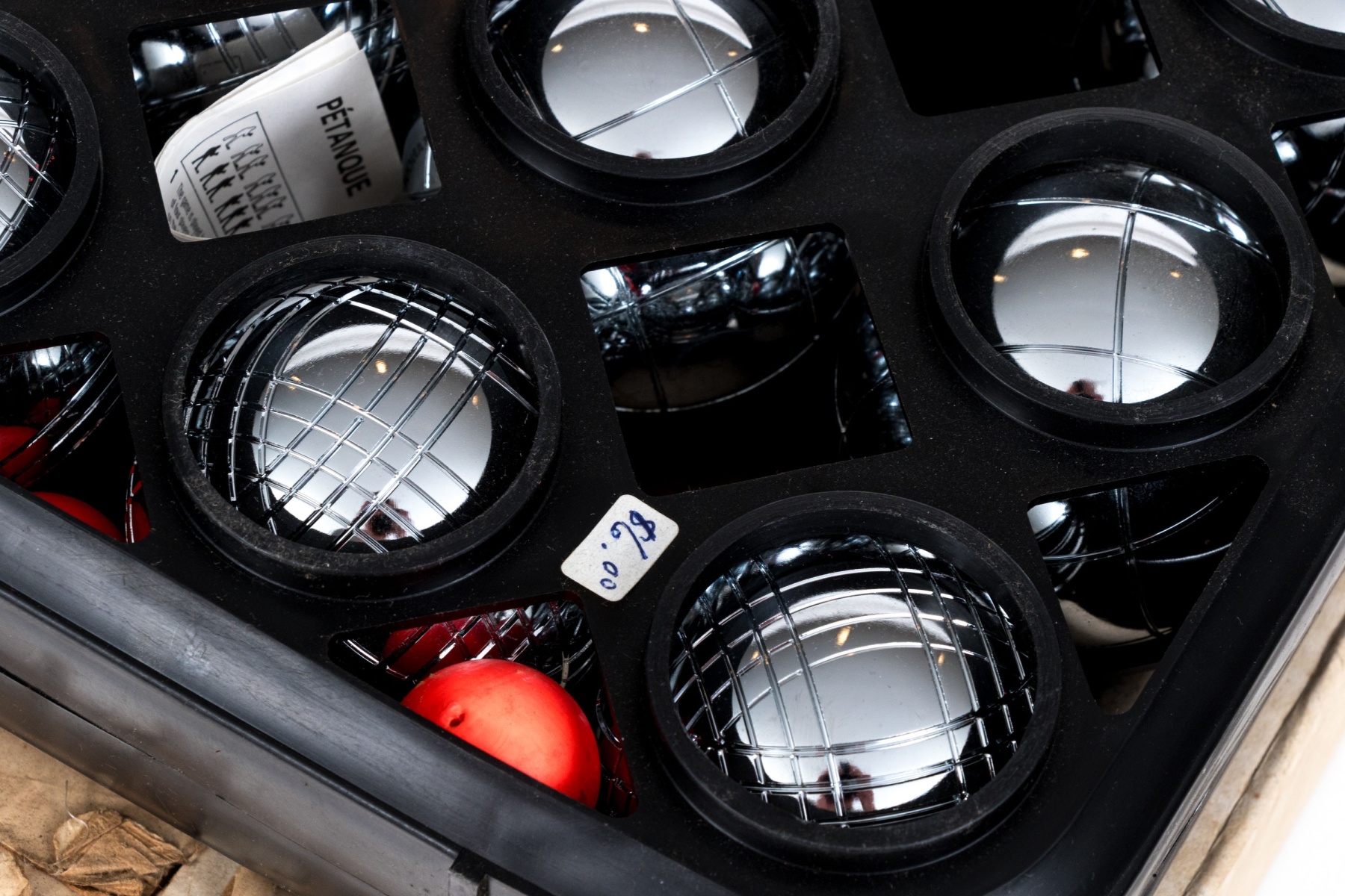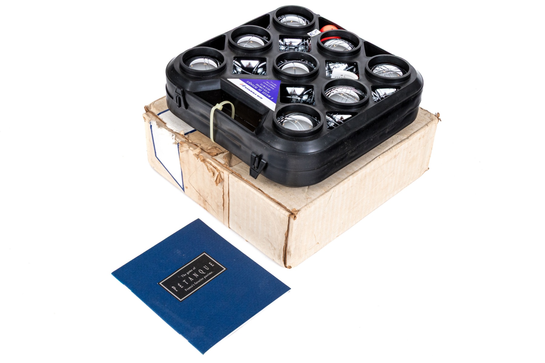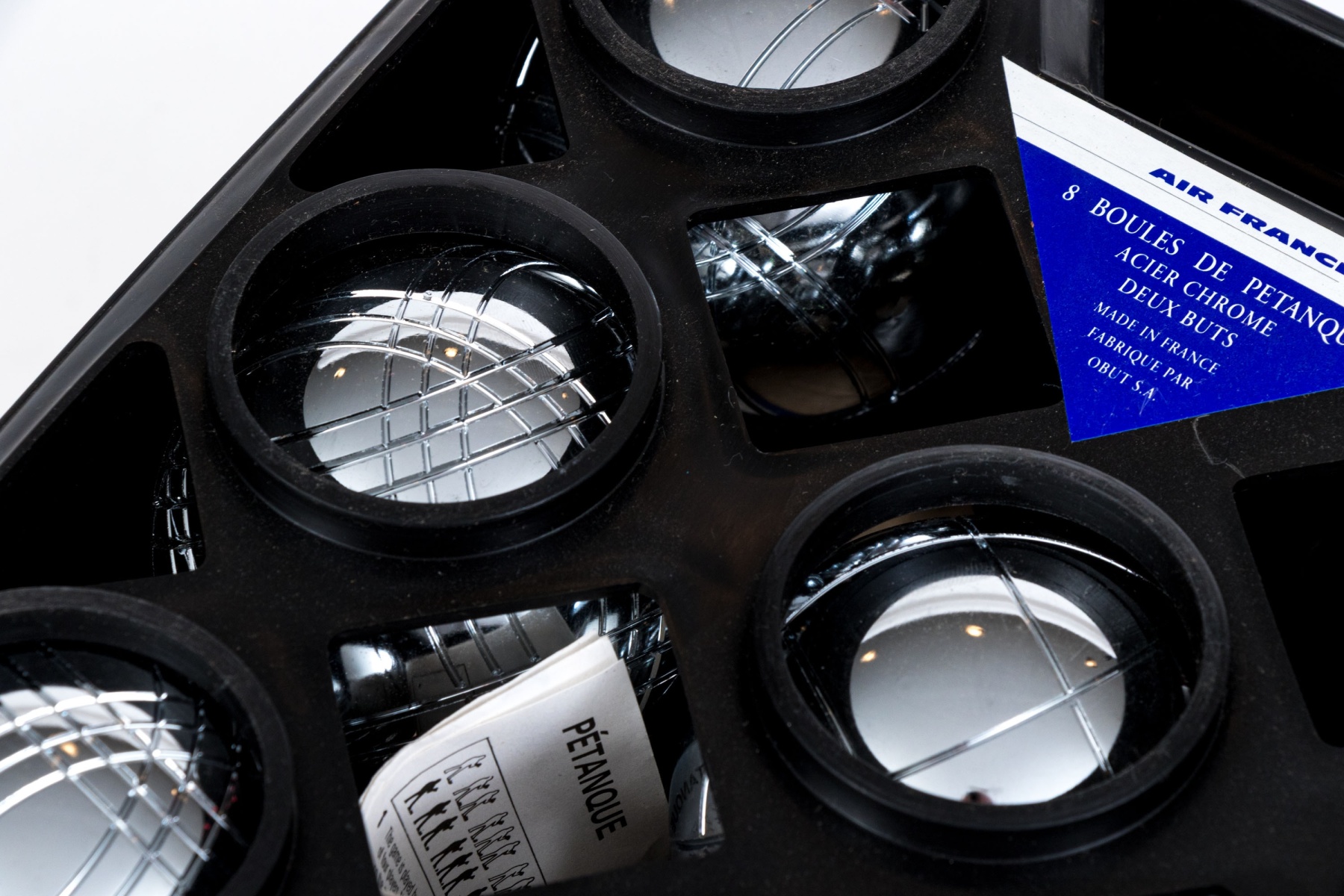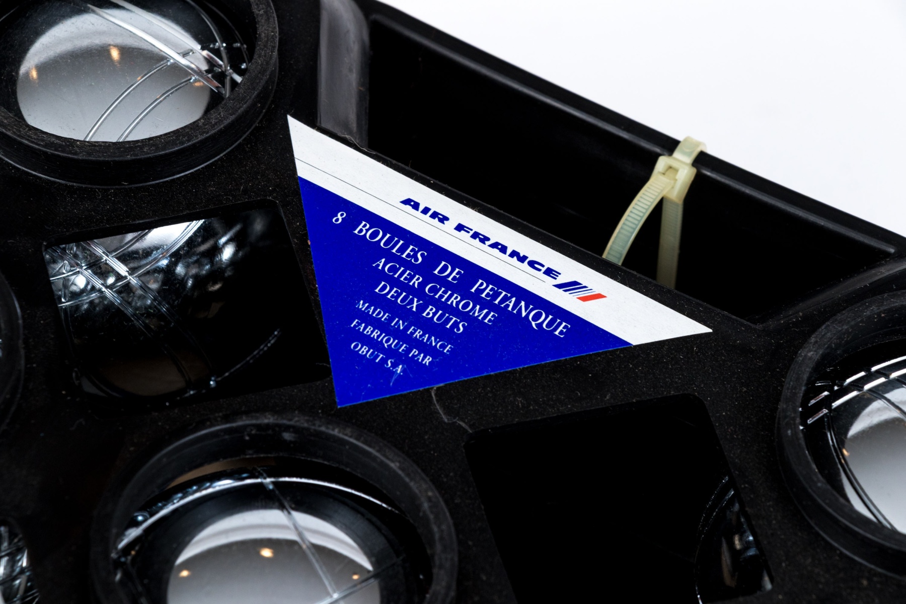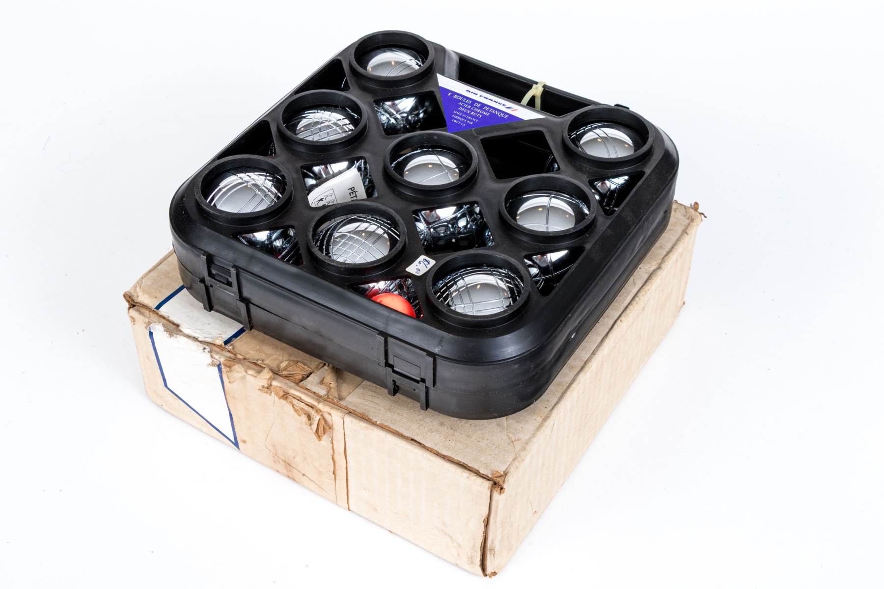 A fun Petanque game with chrome balls and a case. Branded Air France.