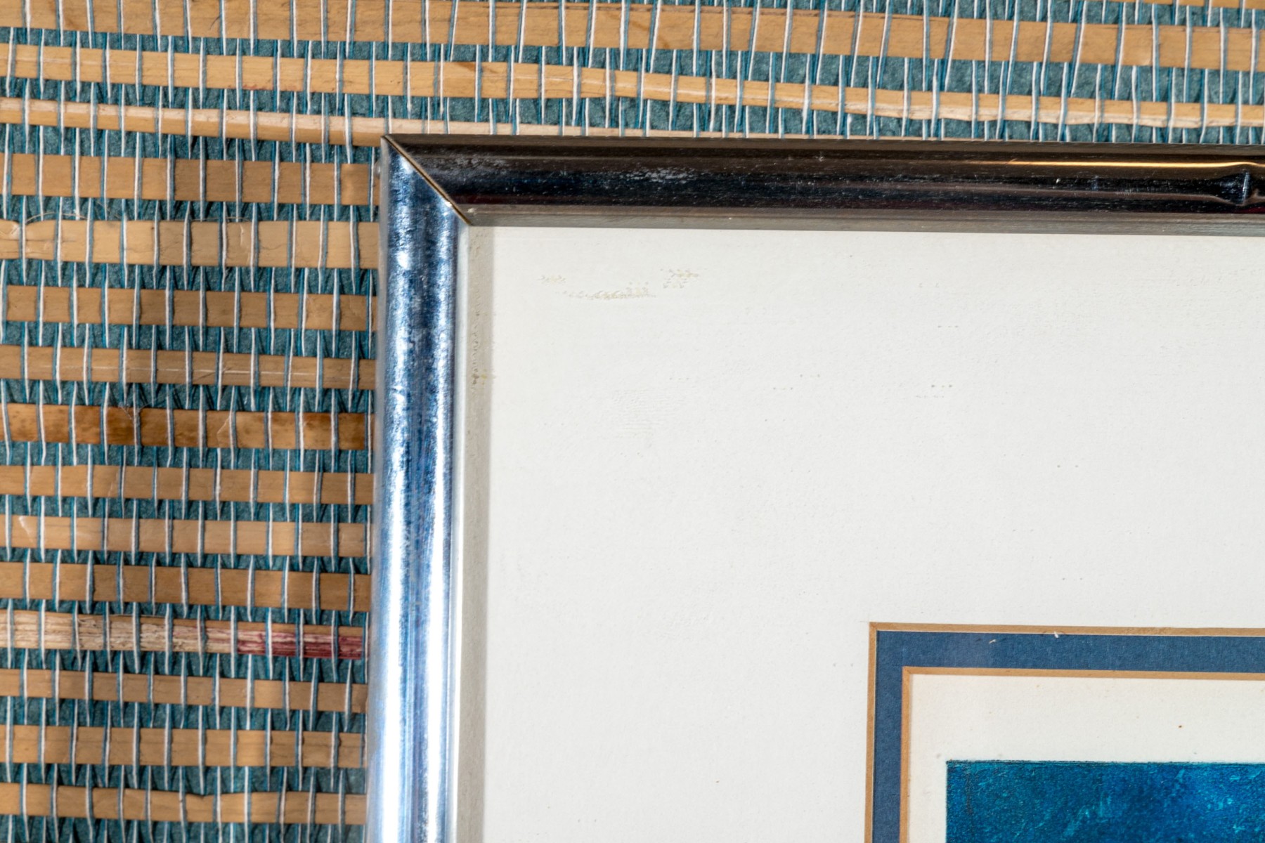 Presented in a silver tone metal frame, double matted and covered in acrylic.