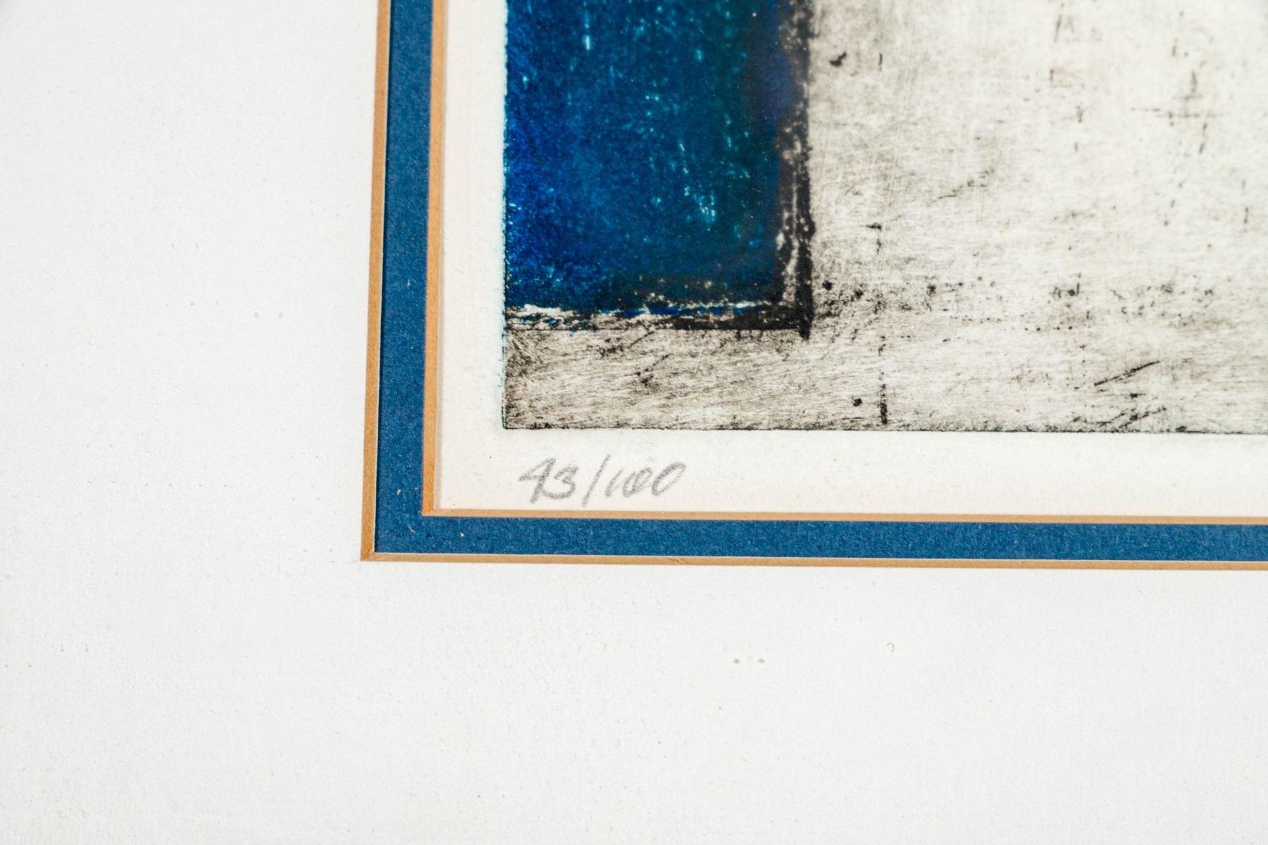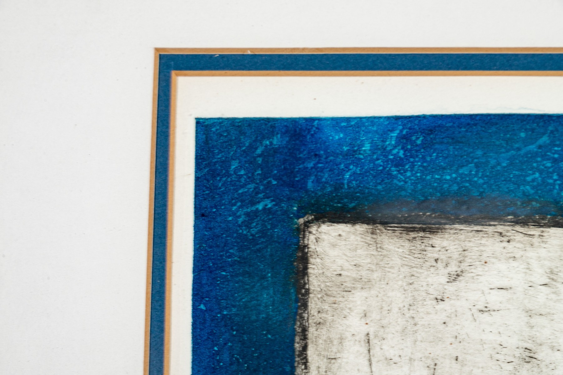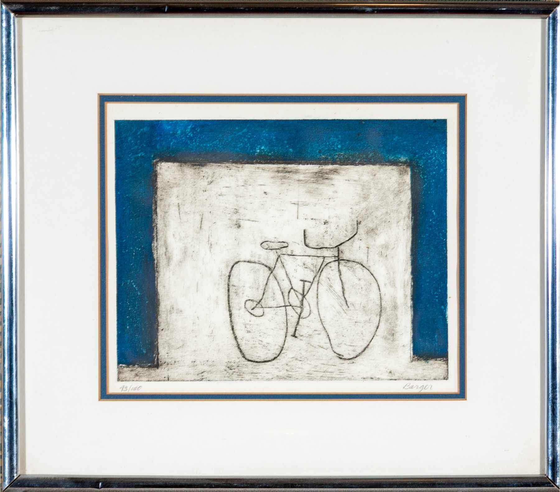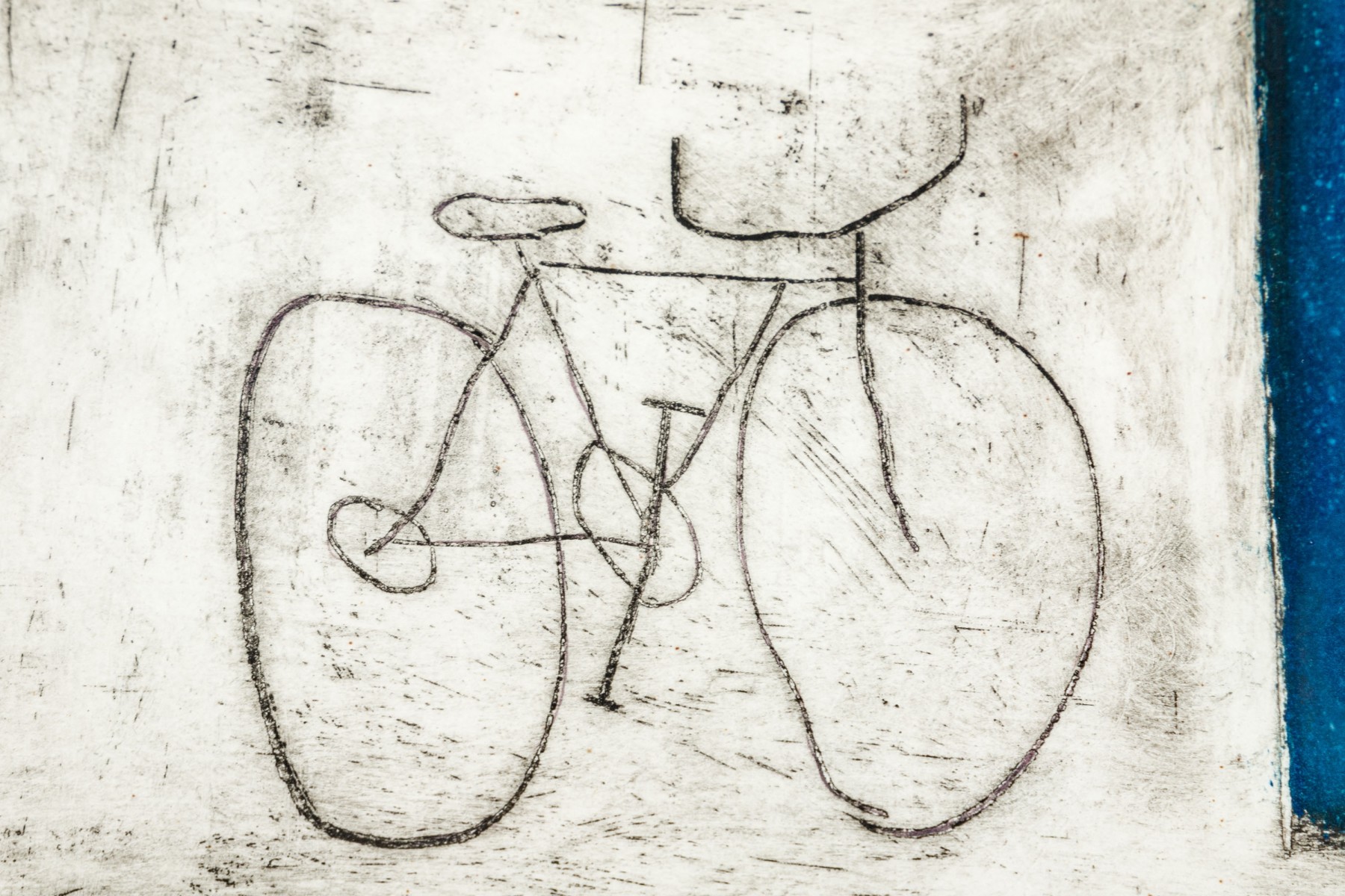 Etching depicting an original etching with a bicycle in a blue and white background.