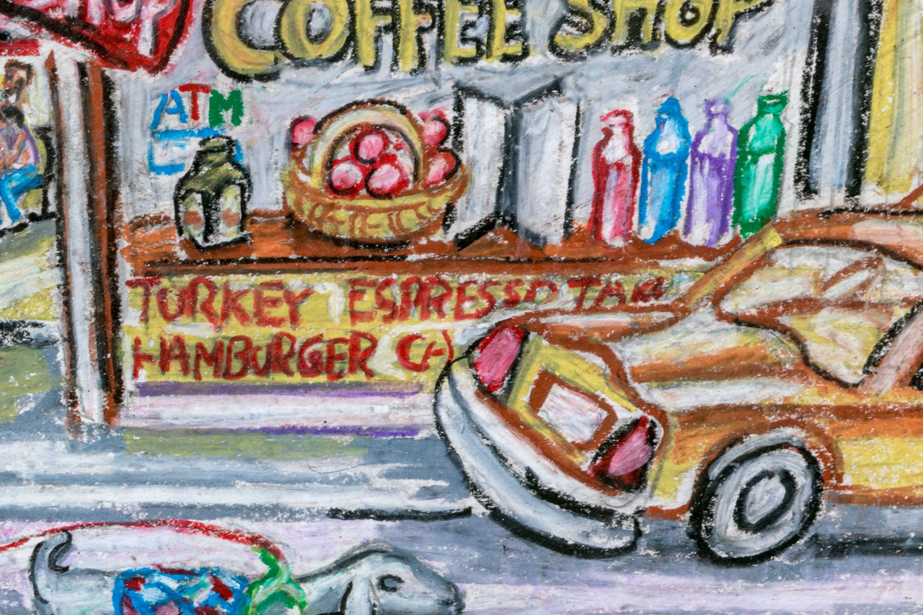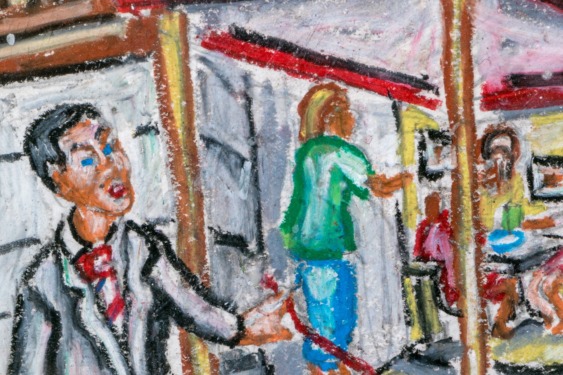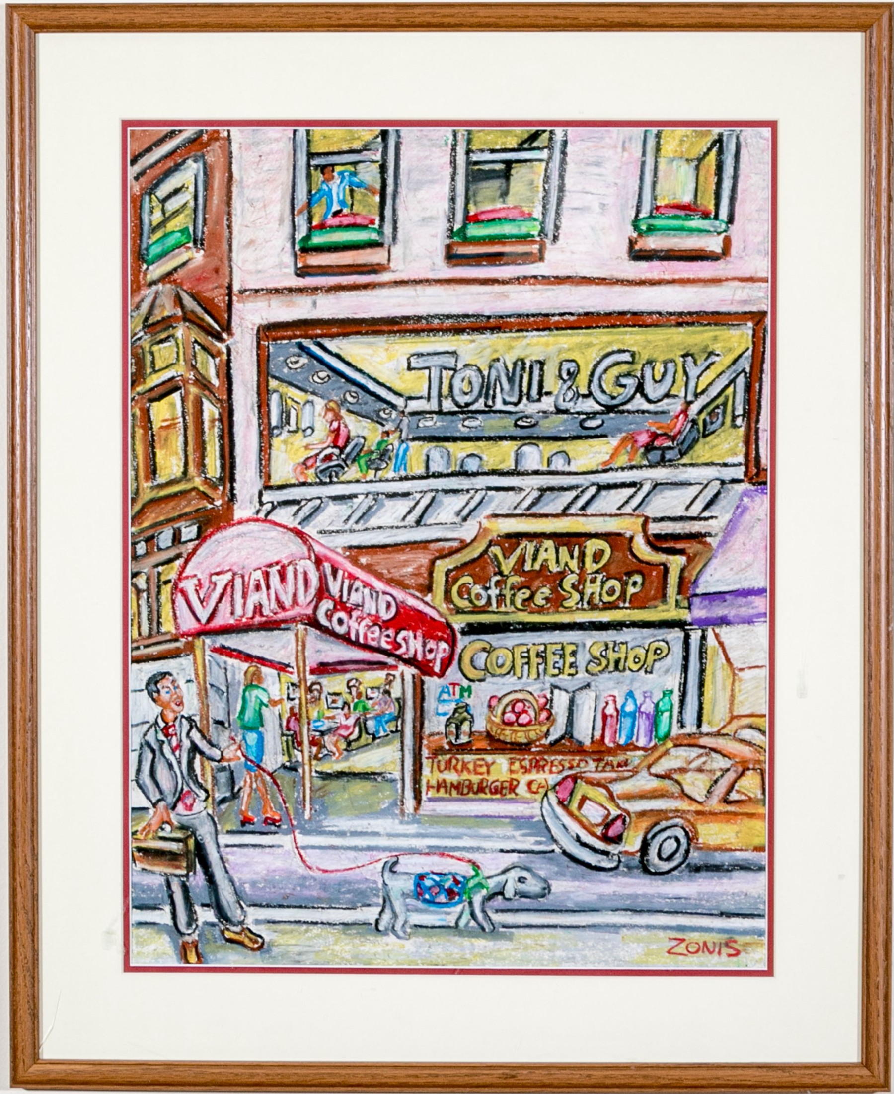 Peter Zonis (American, B. 1958) oil pastel on paper pop style depicting a man in a suit with briefcase walking a dog down a New York sidewalk with a taxi cab parked in front of a coffee shop.