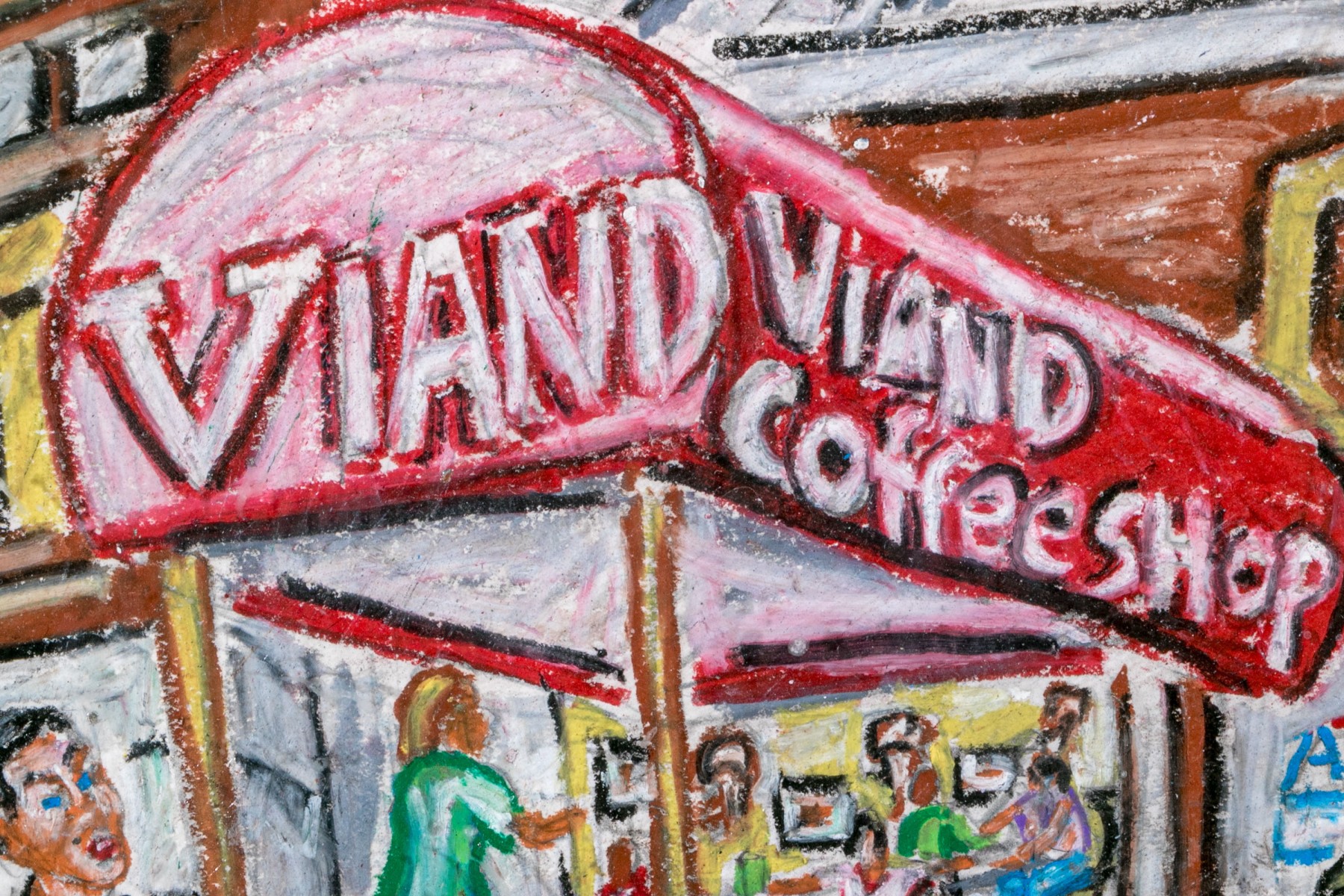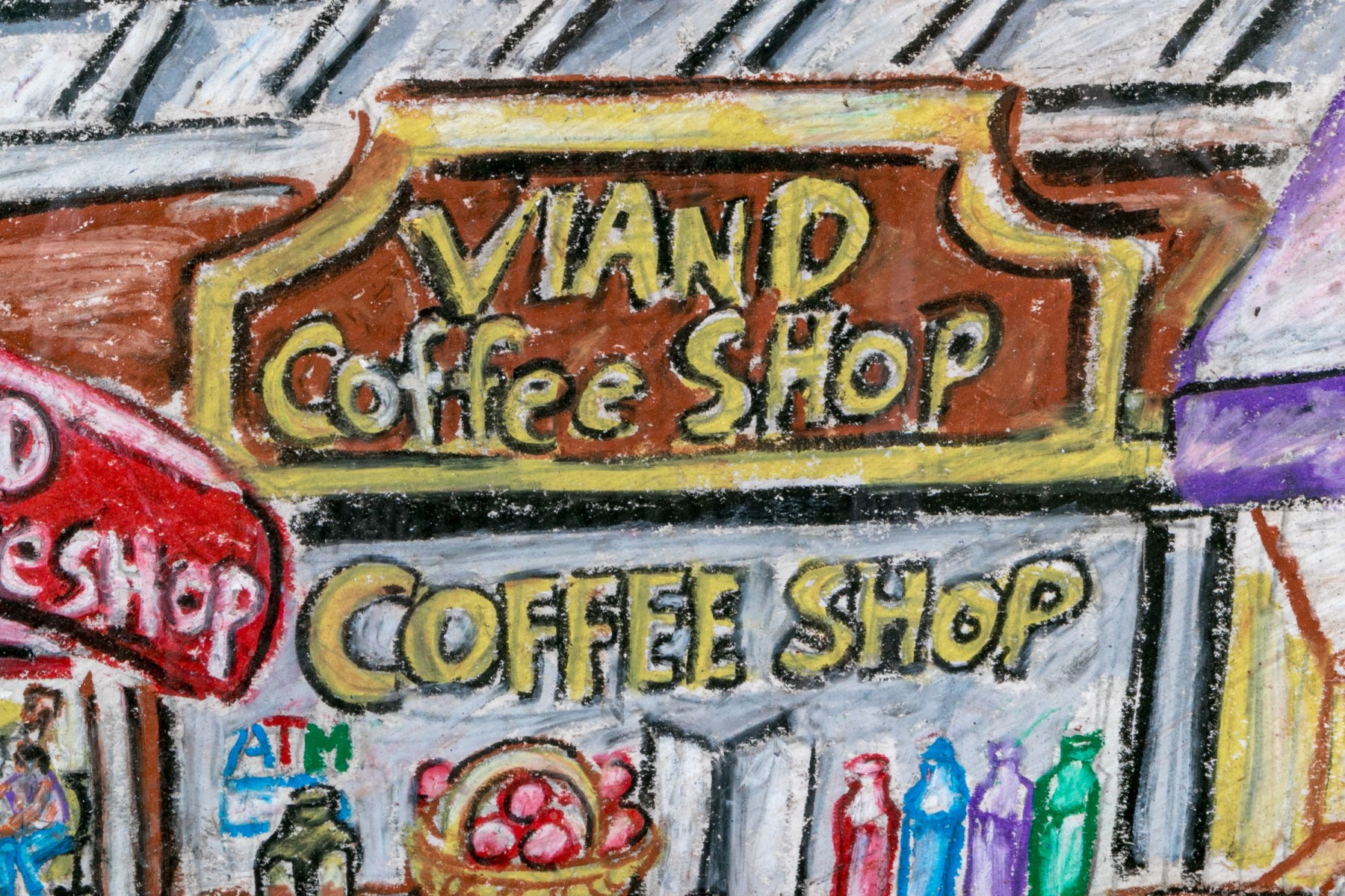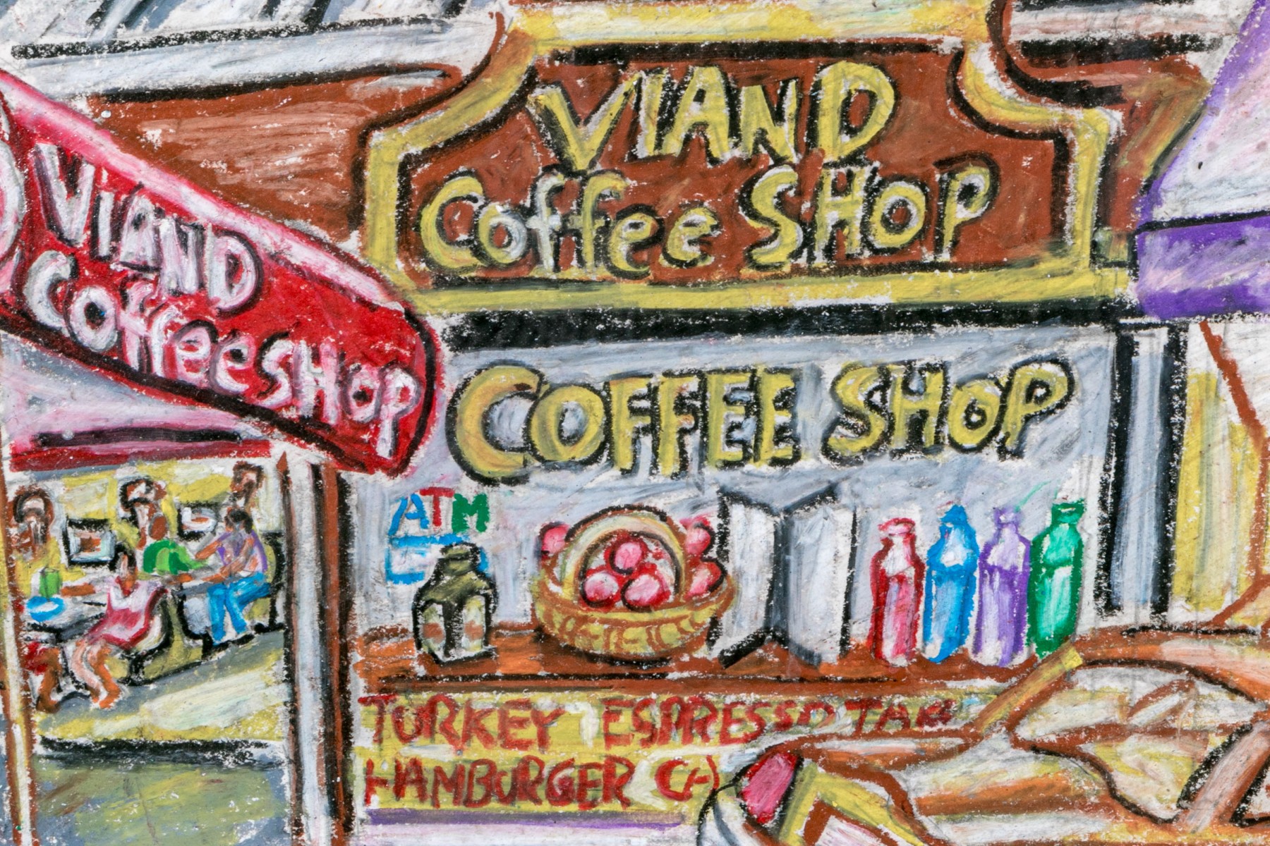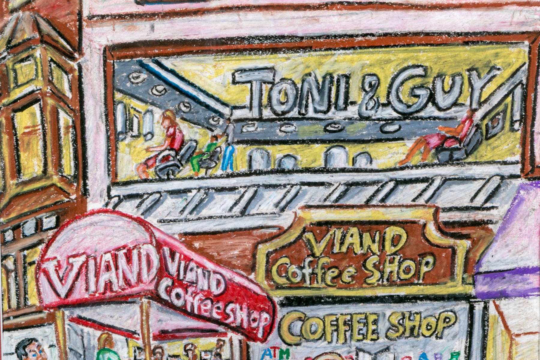 Peter Zonis (American, B. 1958) oil pastel on paper pop style depicting a man in a suit with briefcase walking a dog down a New York sidewalk with a taxi cab parked in front of a coffee shop.