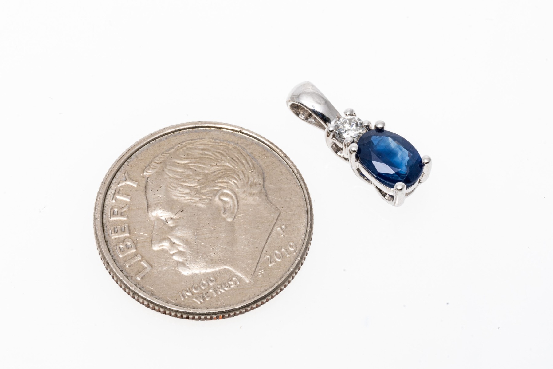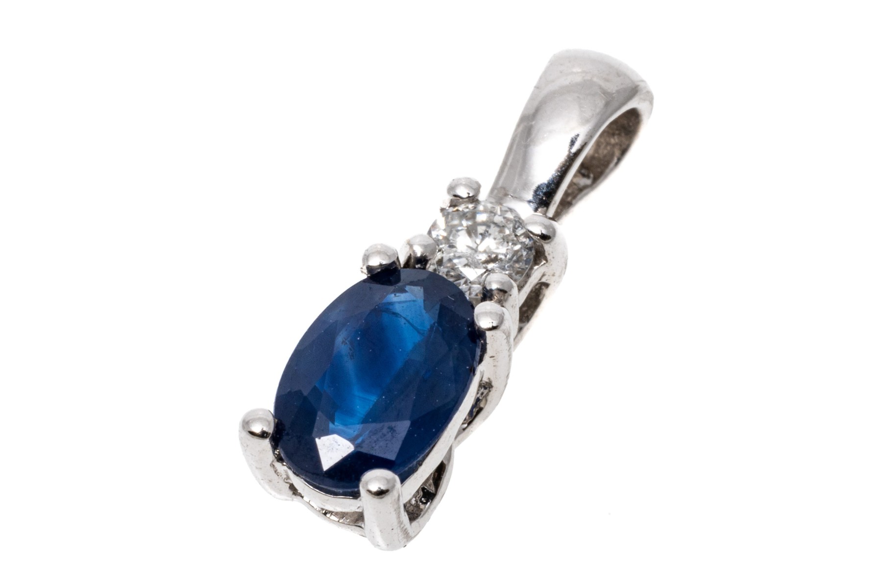 A petite white gold pendant displaying an oval sapphire in a prong setting, approximately 0.44 cts, set under a round brilliant cut diamond, approximately 0.05 cts.