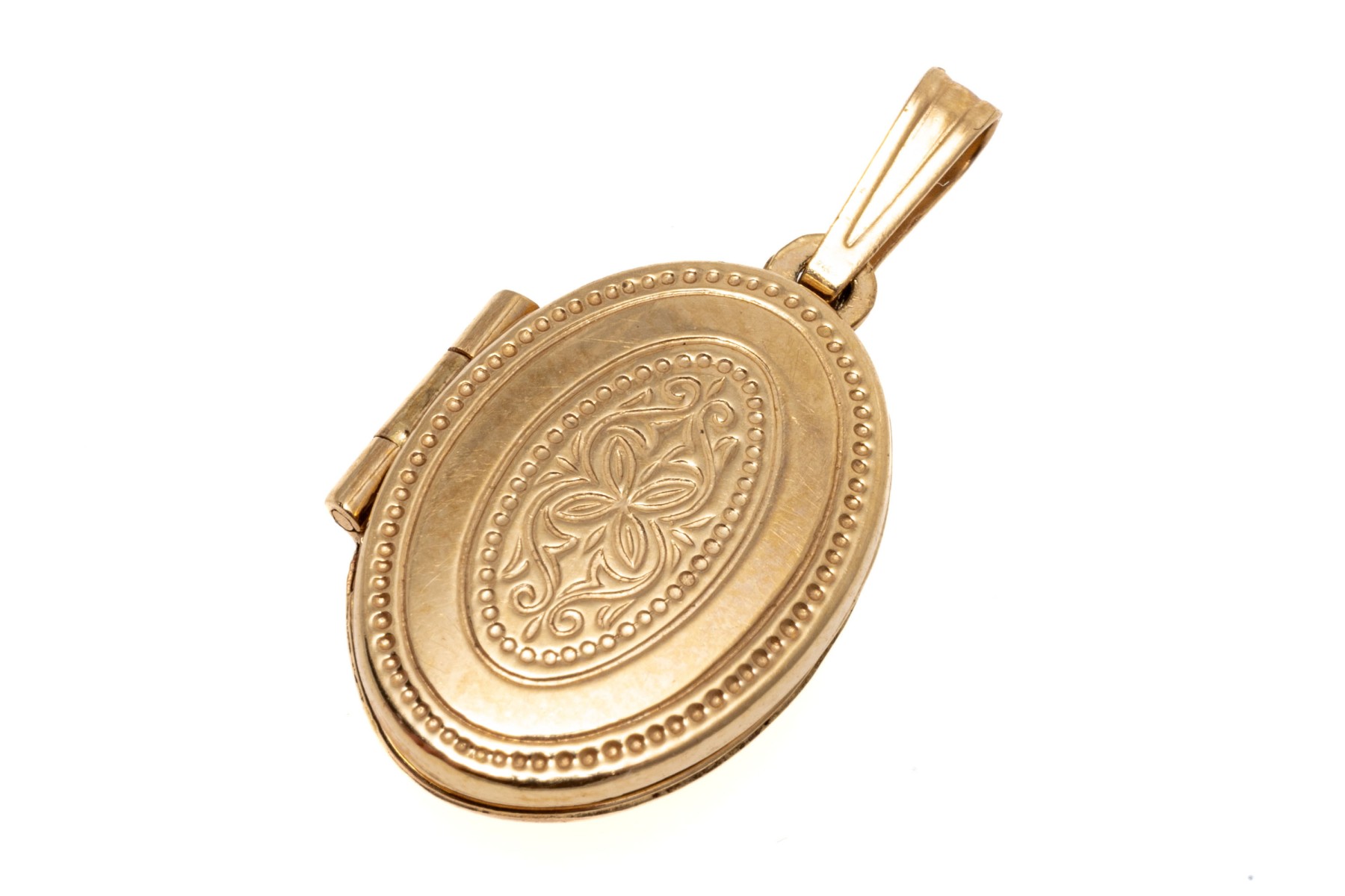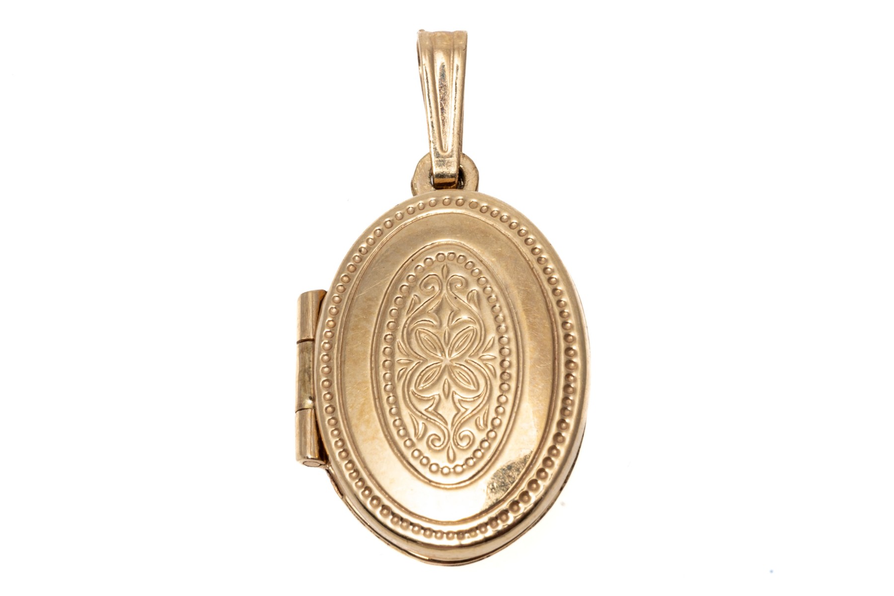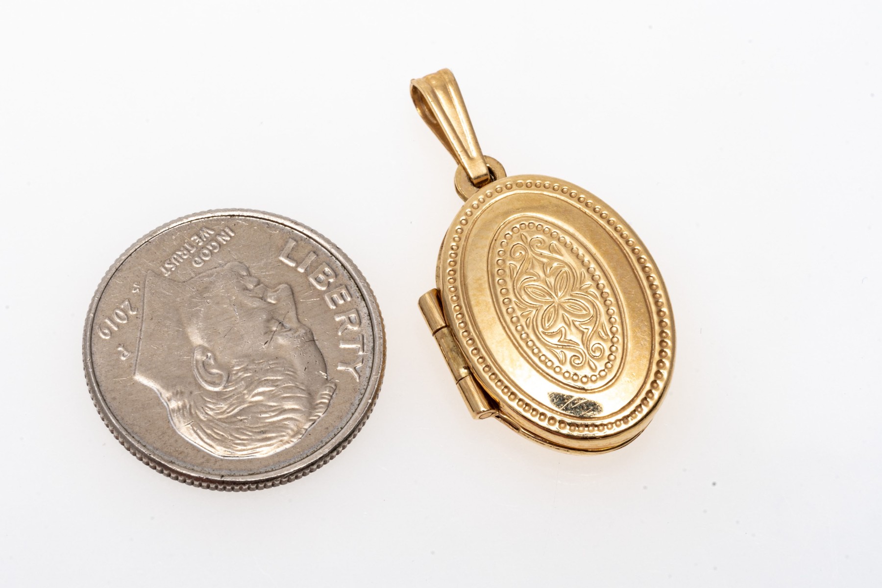 Petite 14K yellow gold locket pendant. The front of the pendant is engraved with a delicate design.