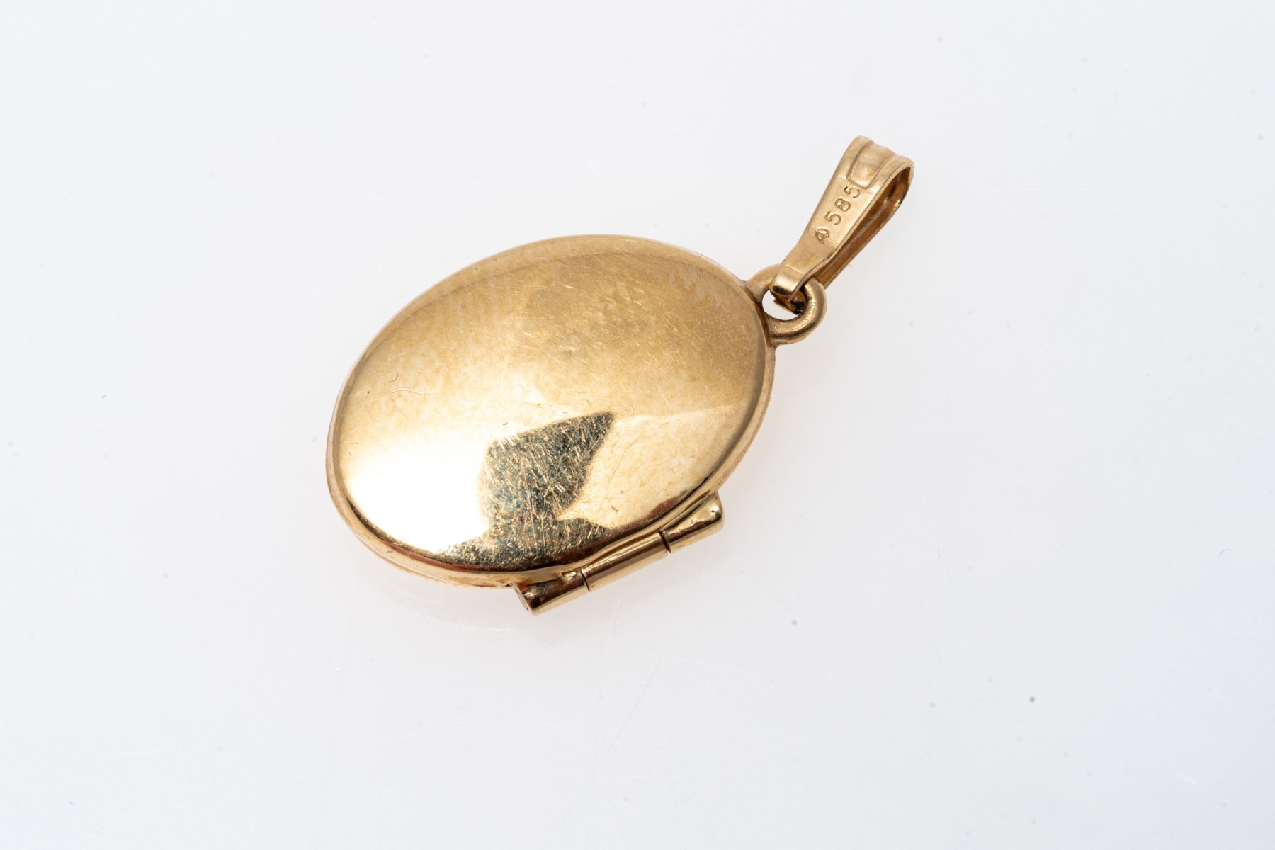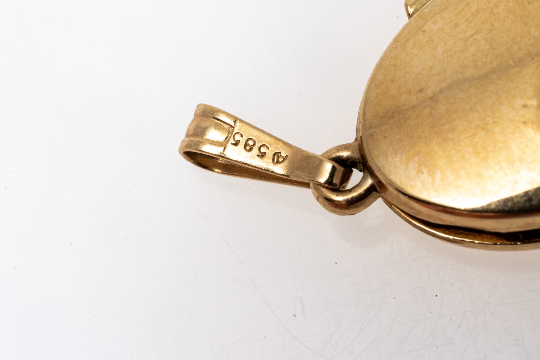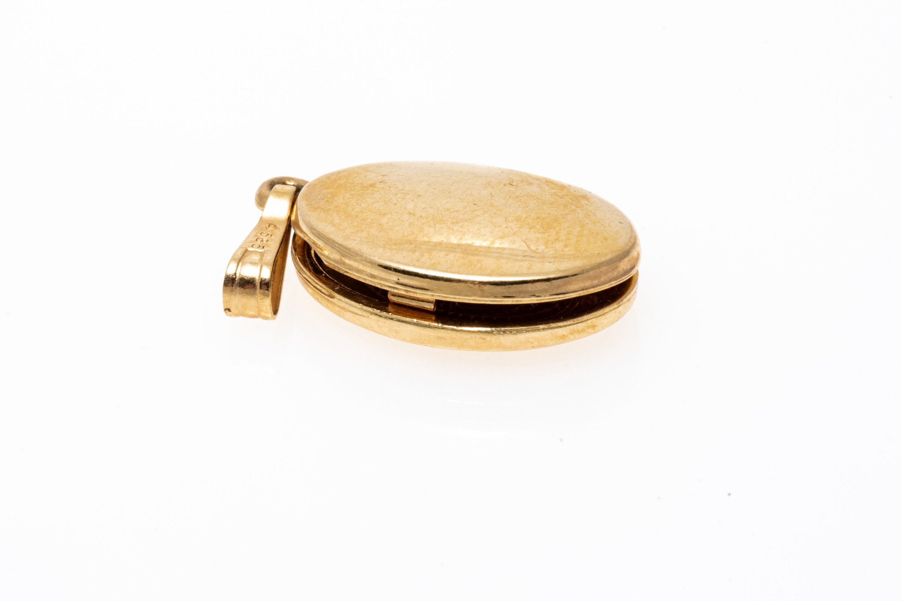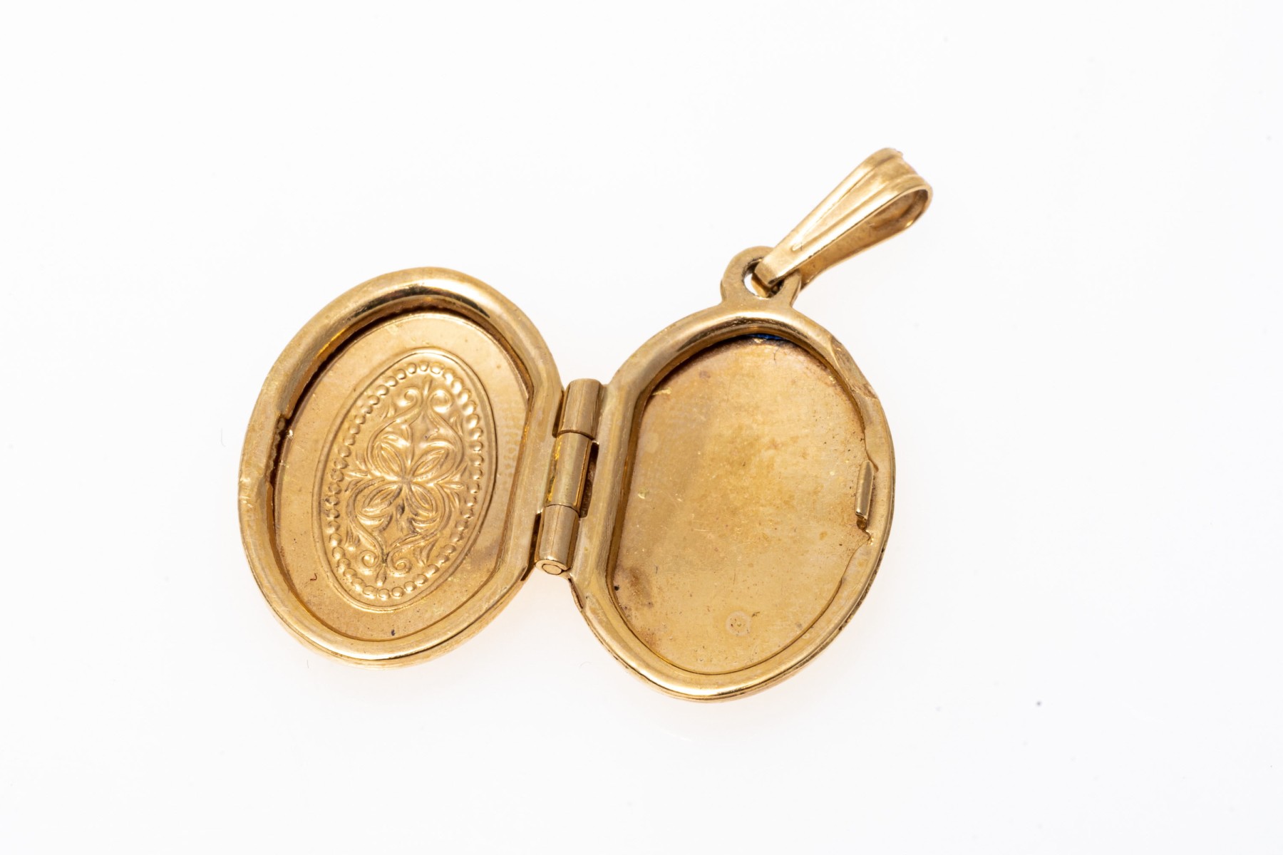 Petite 14K yellow gold locket pendant. The front of the pendant is engraved with a delicate design.