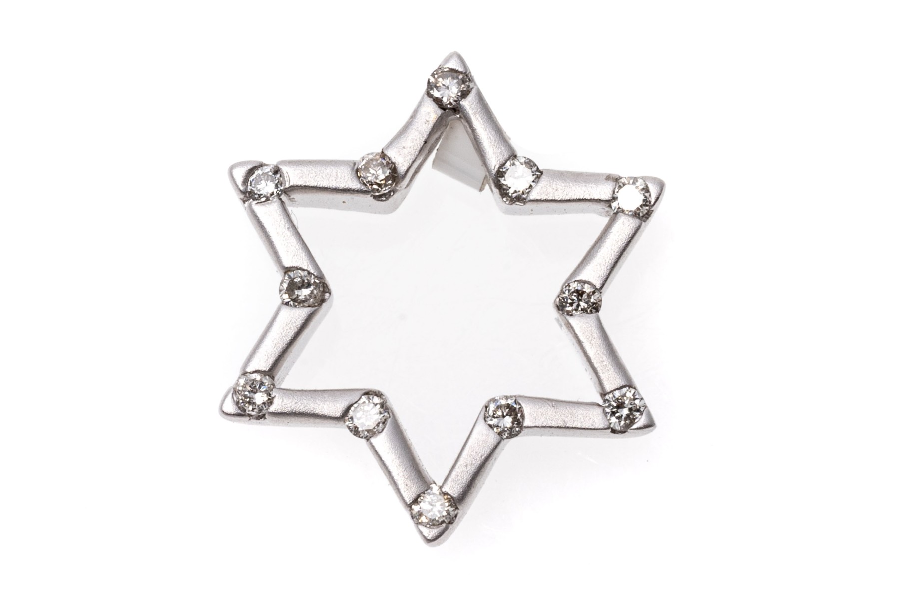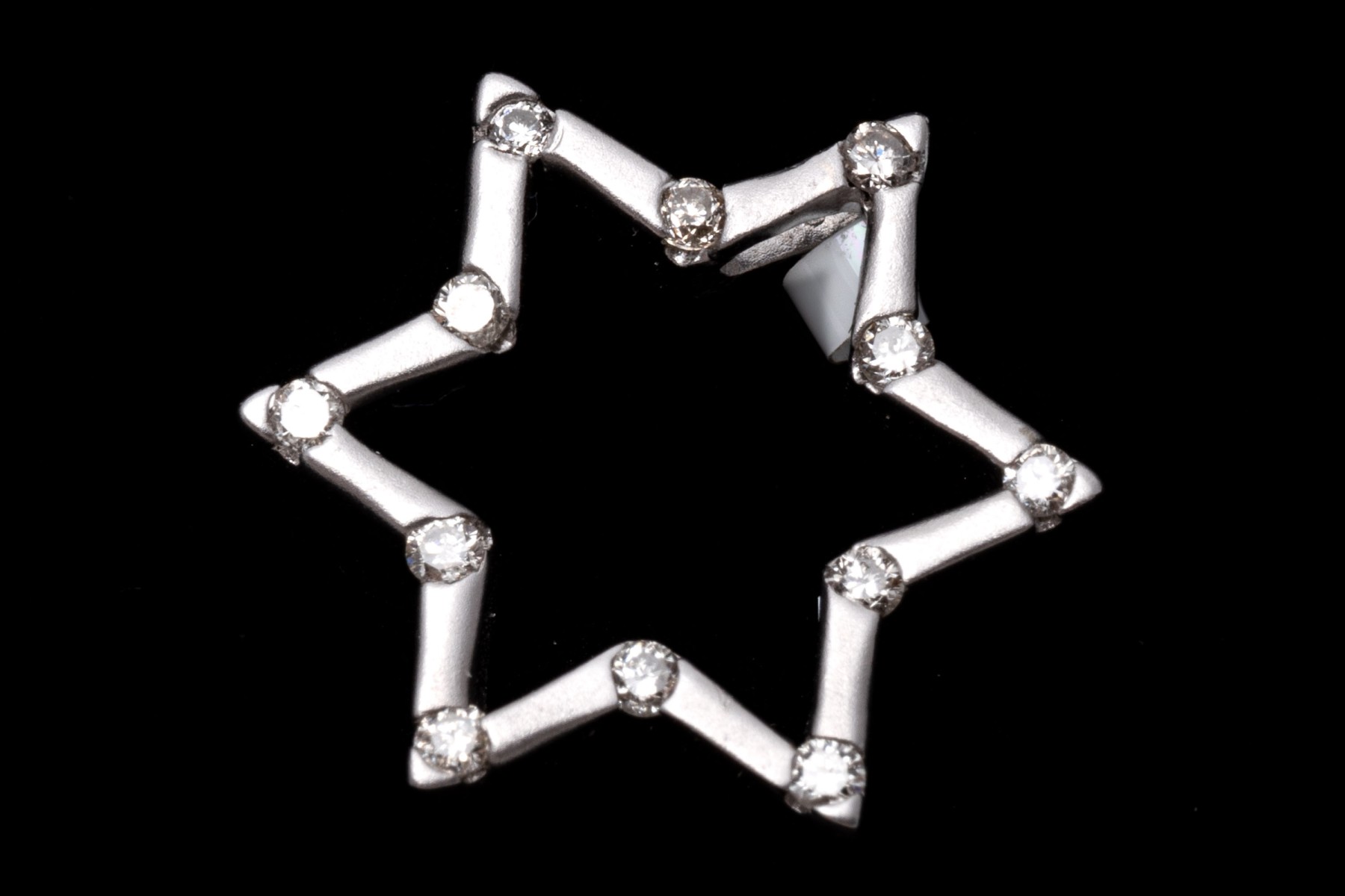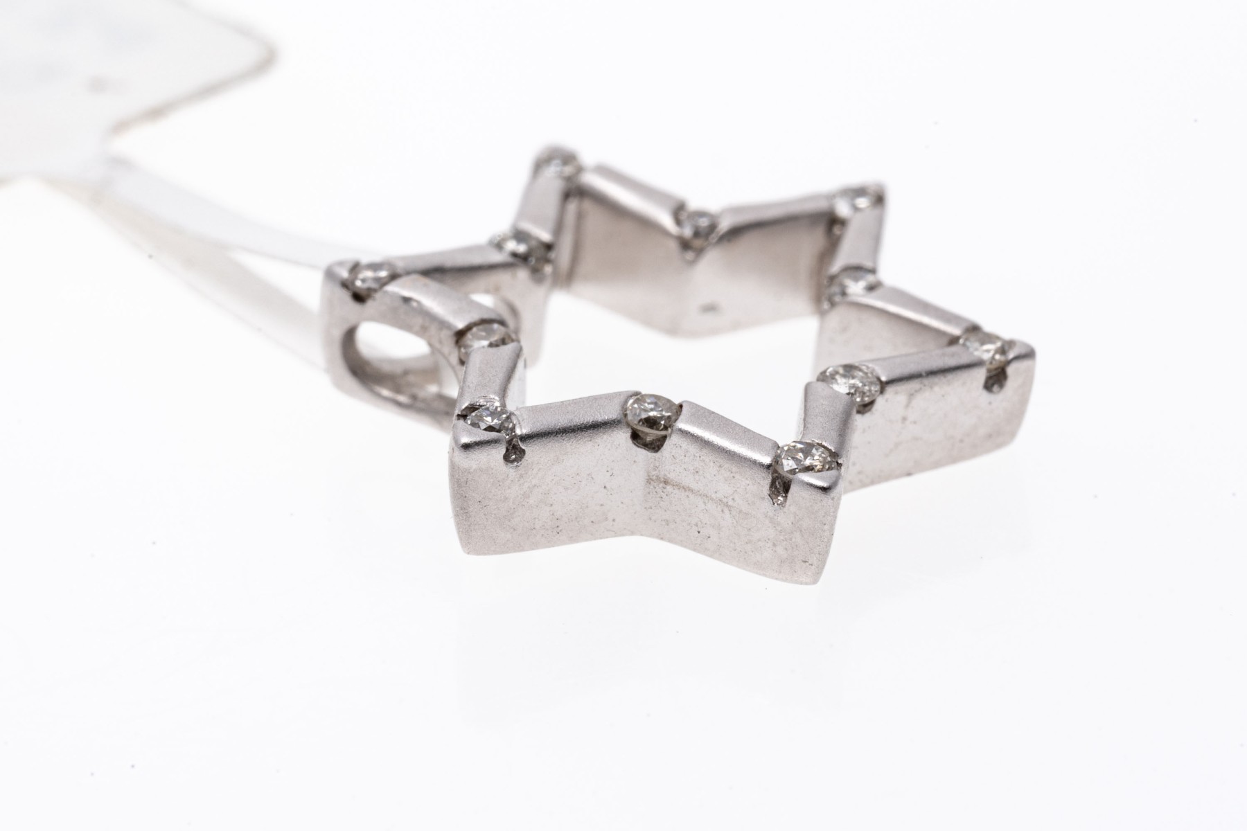 This petite white gold star pendant has a matte finish and is set with round cut accent diamonds at the points, approximately 0.12 TCW.