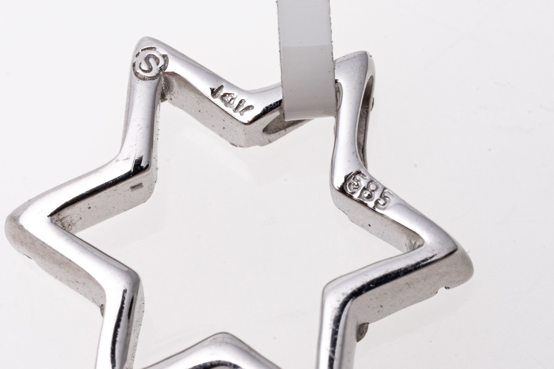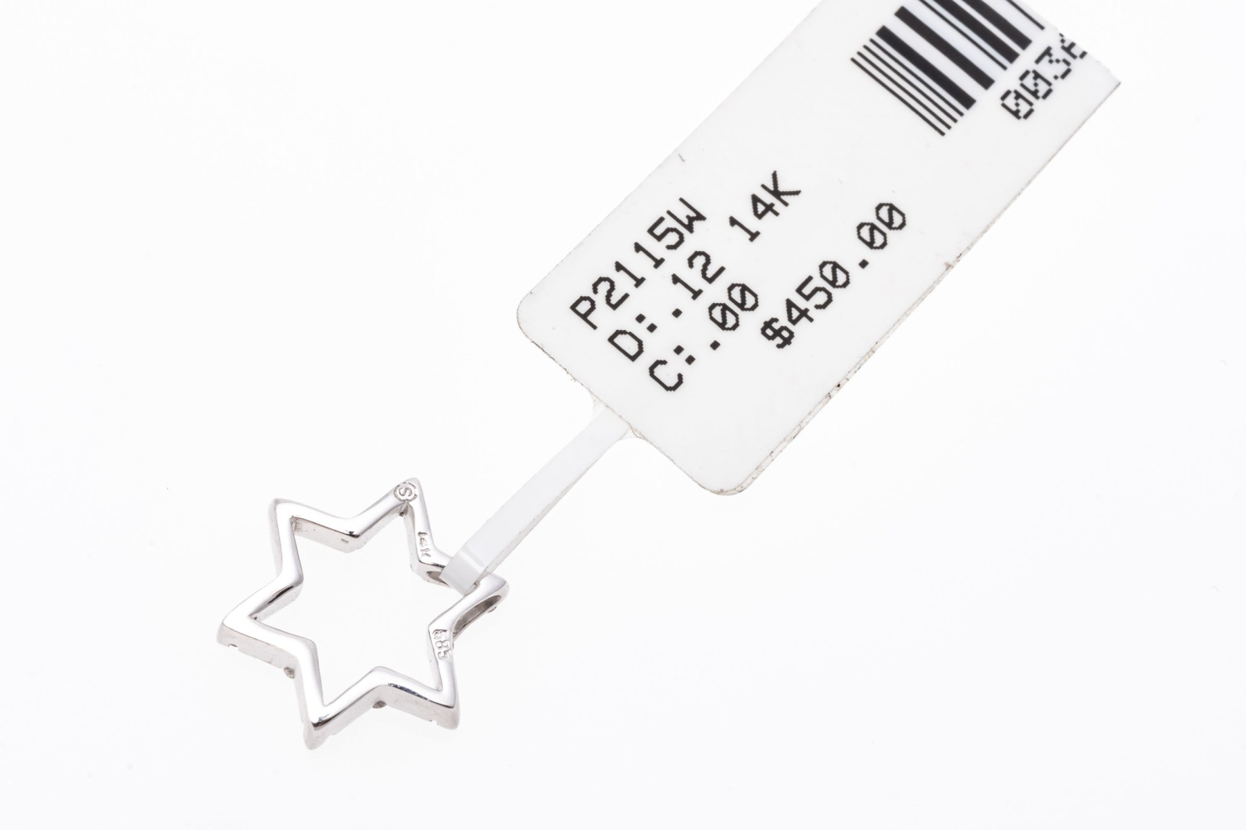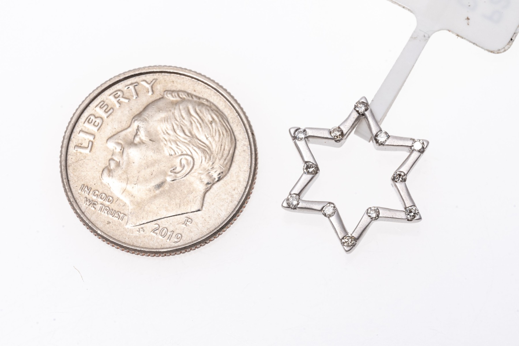 This petite white gold star pendant has a matte finish and is set with round cut accent diamonds at the points, approximately 0.12 TCW.