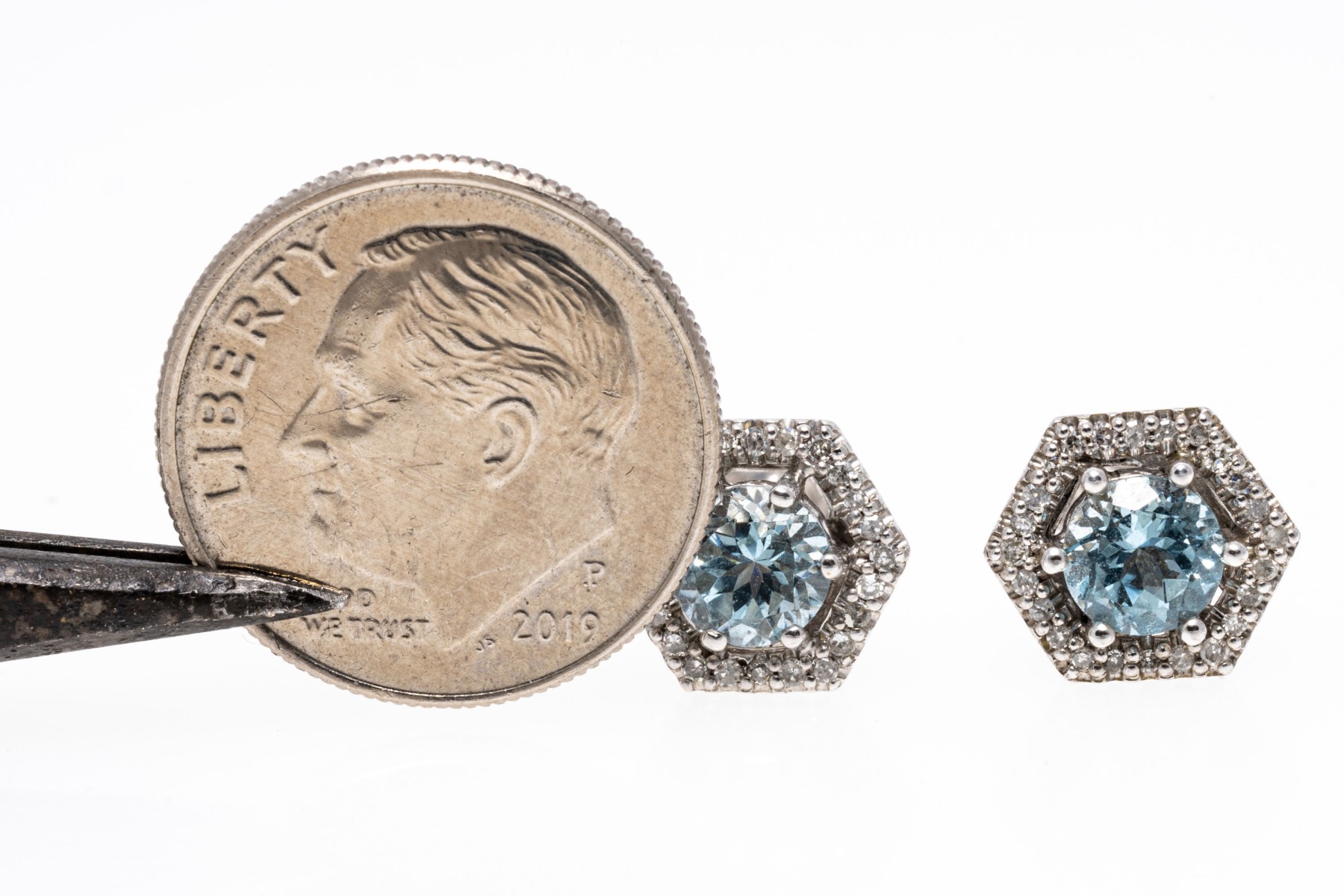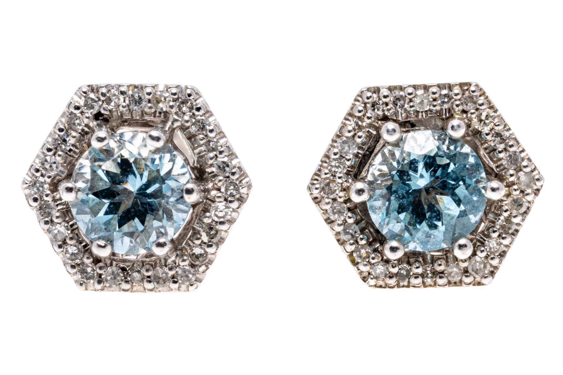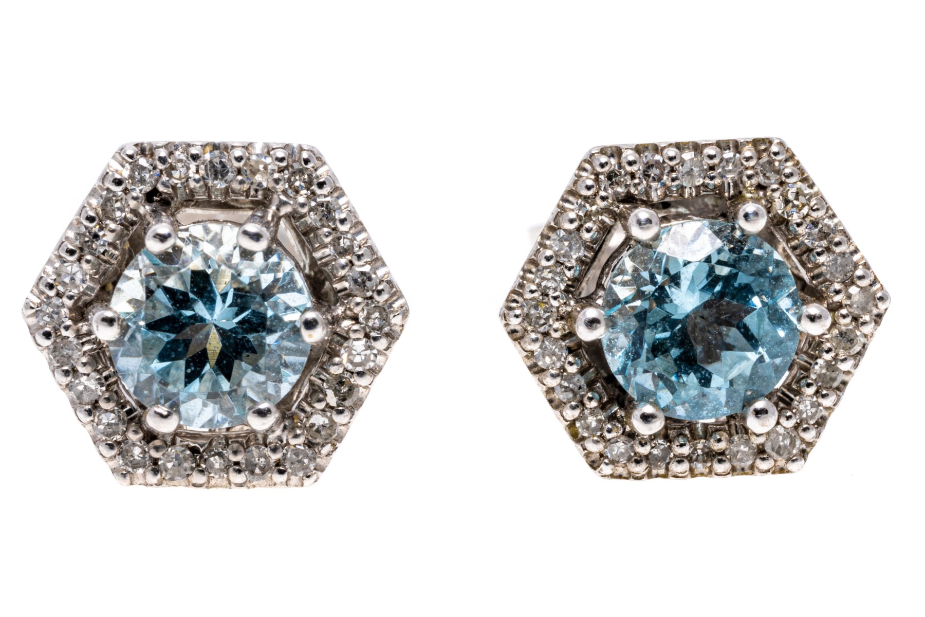 14K white gold stud earrings. Round cut icy blue aquamarines sit within a hexagonal diamond frame. The aquamarines are approximately 0.62 TCW and the diamonds are approximately 0.24 TCW. Post and clutch backings.