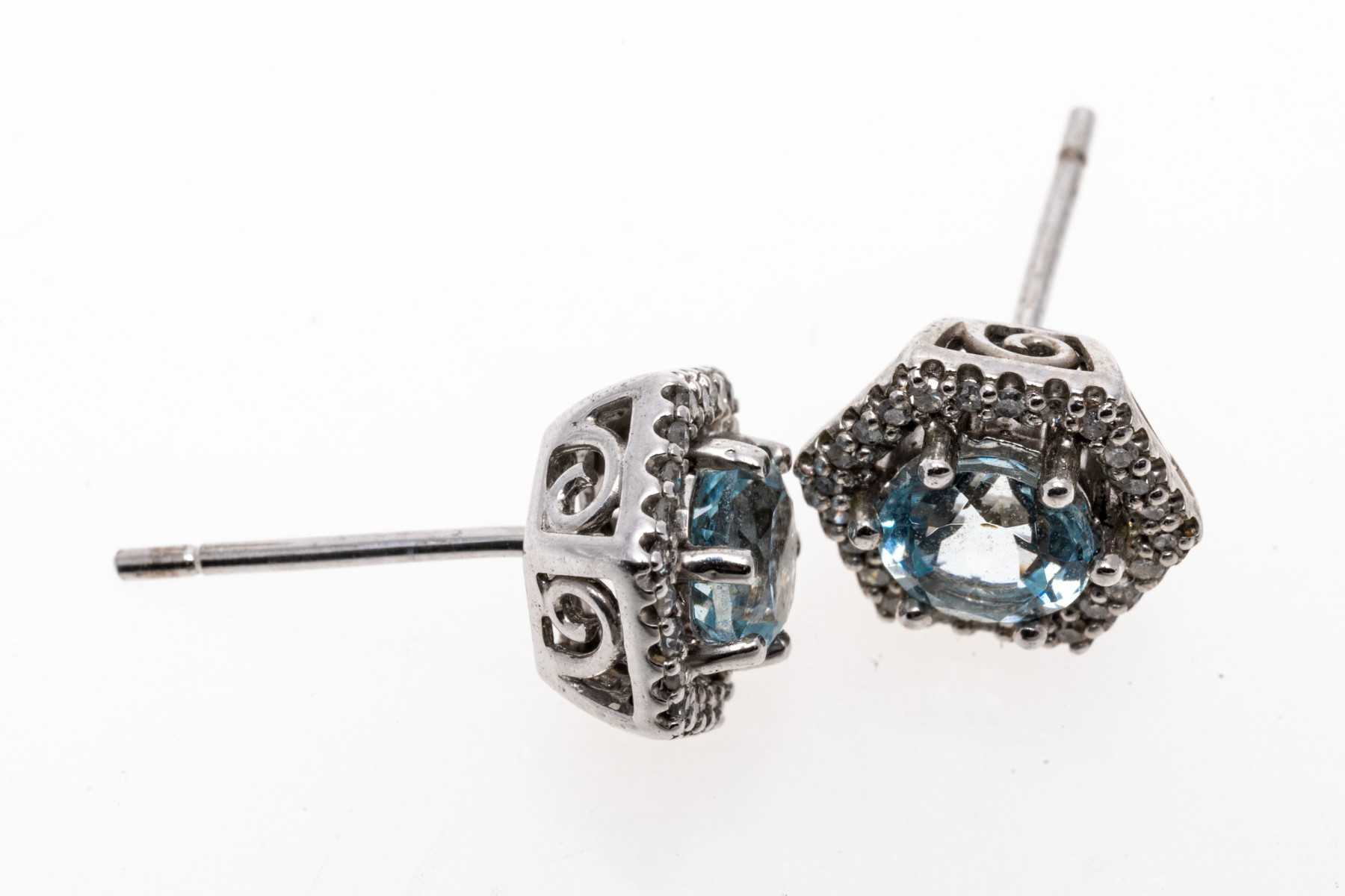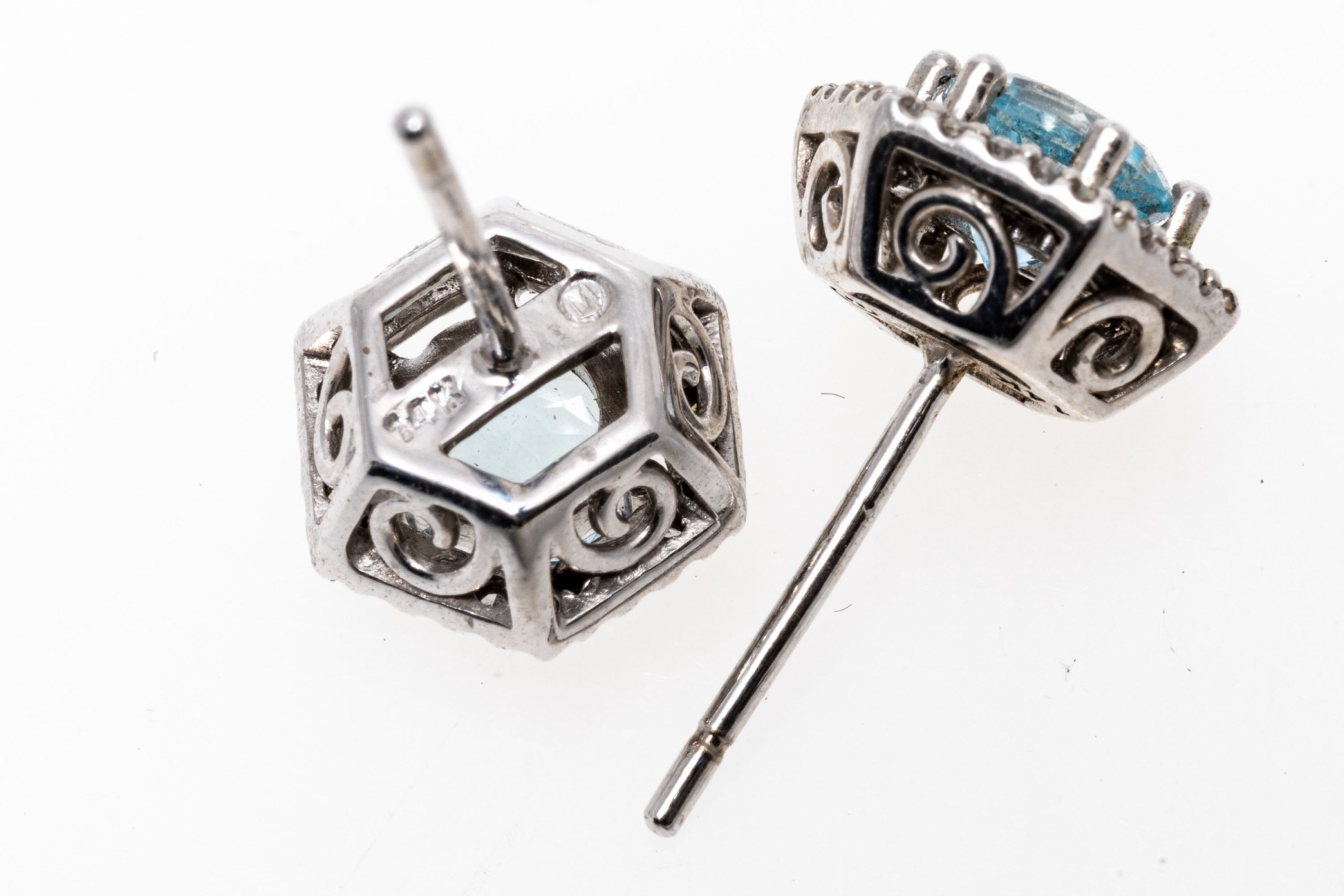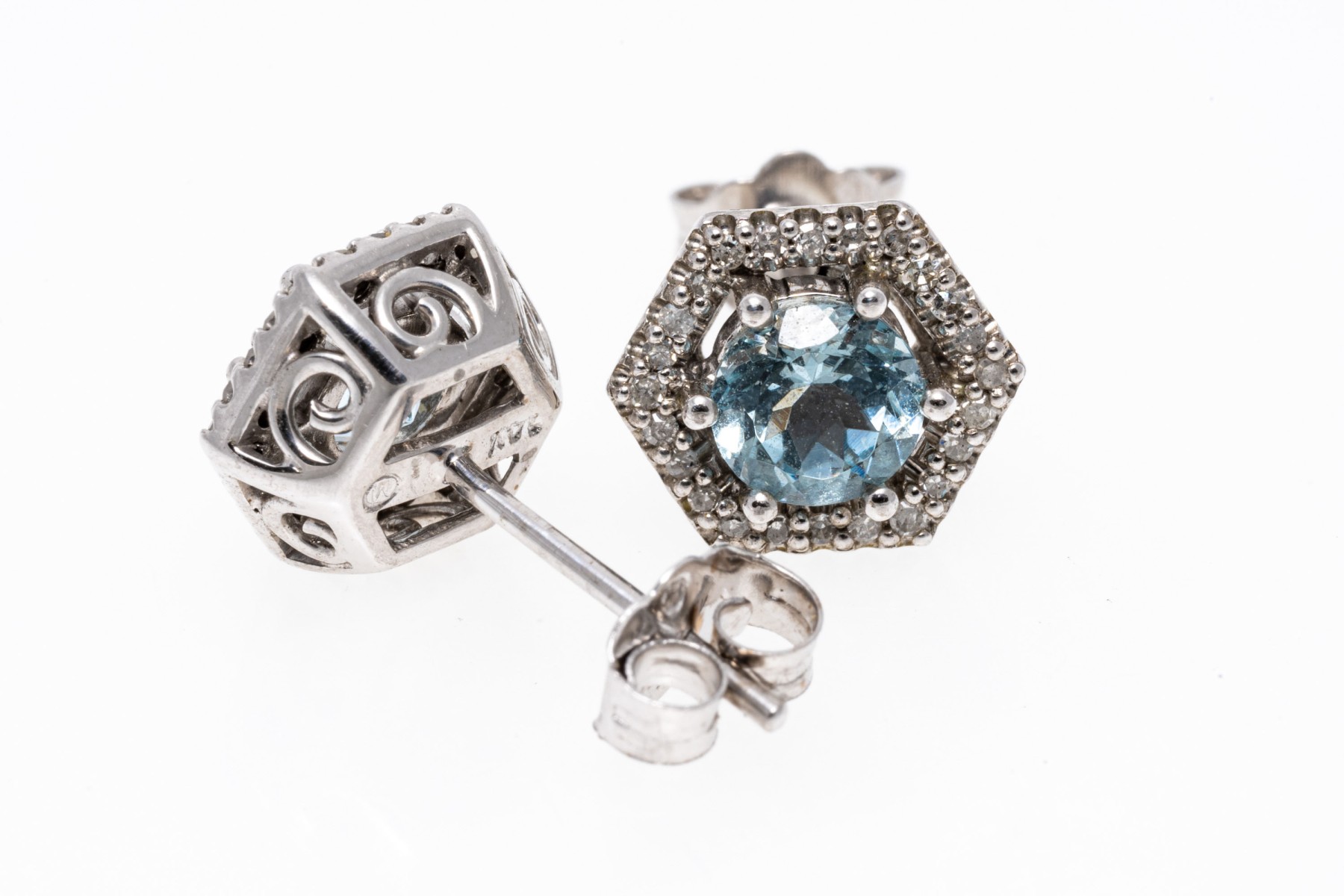14K white gold stud earrings. Round cut icy blue aquamarines sit within a hexagonal diamond frame. The aquamarines are approximately 0.62 TCW and the diamonds are approximately 0.24 TCW. Post and clutch backings.