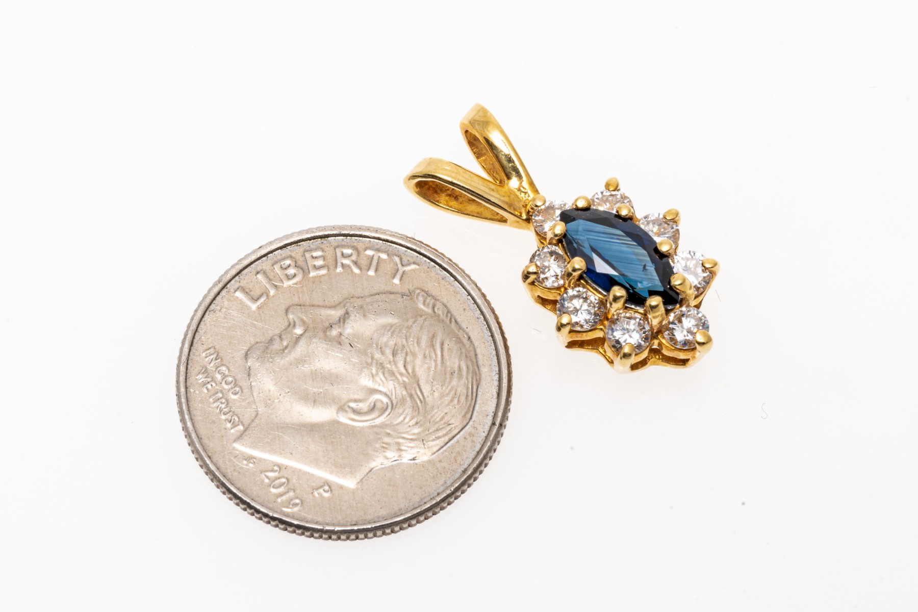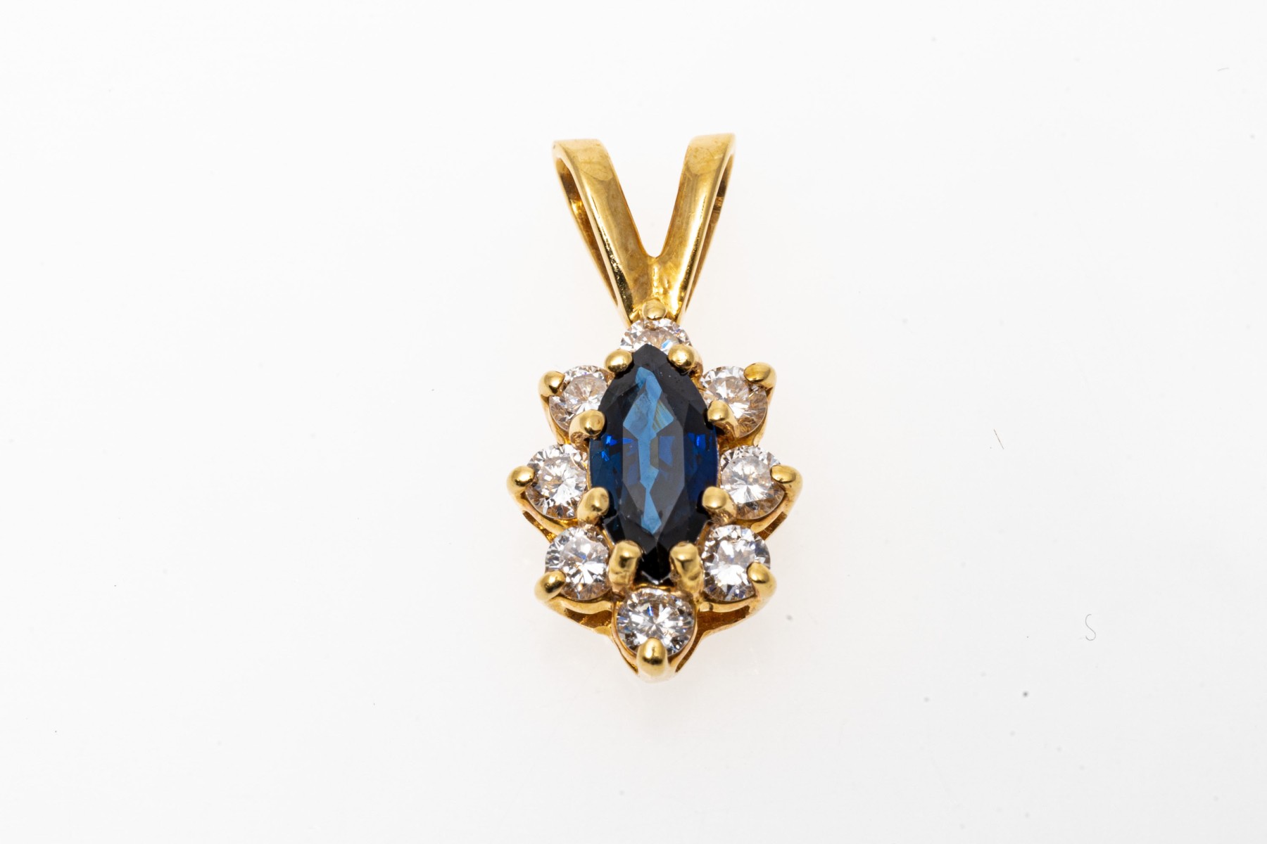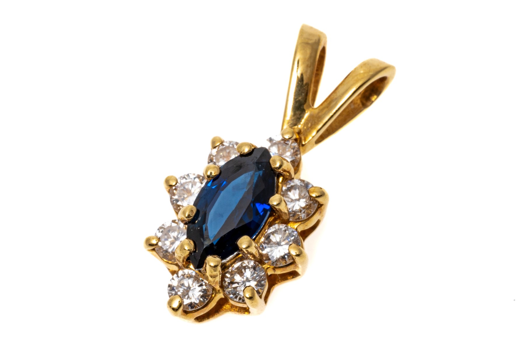 Sapphire and diamond set 18K yellow gold pendant. A marques cut synthetic sapphire is set within a halo of round brilliant cut diamonds. The diamonds are approximately 0.45 TCW. Split style bale.