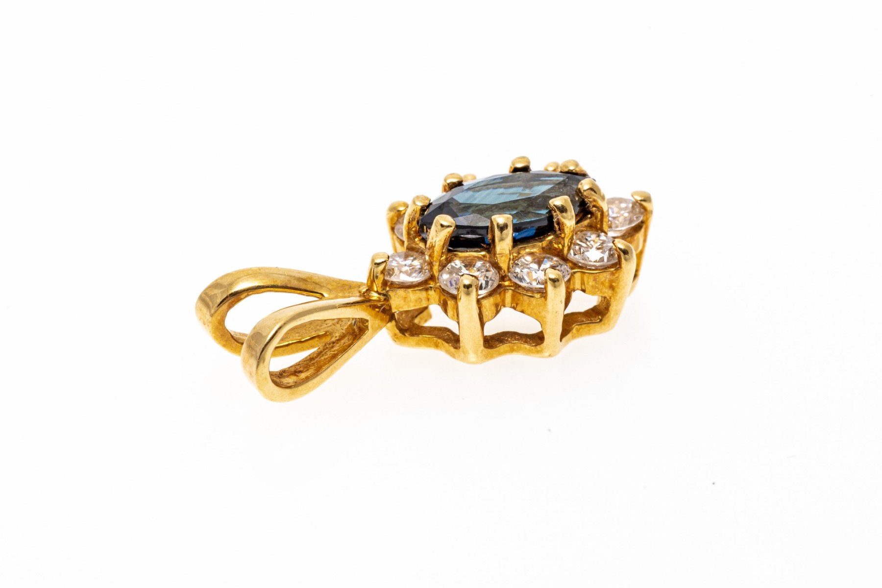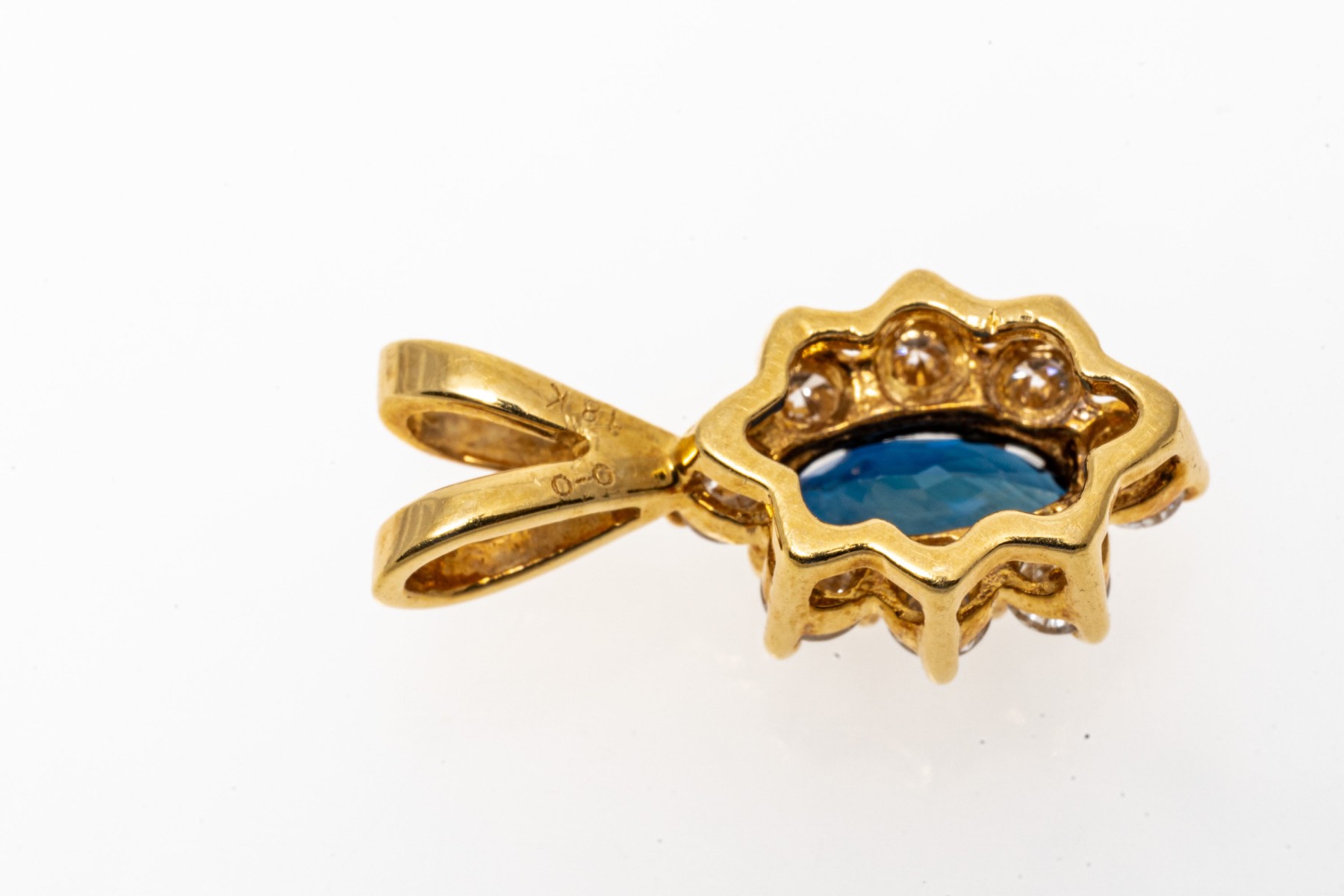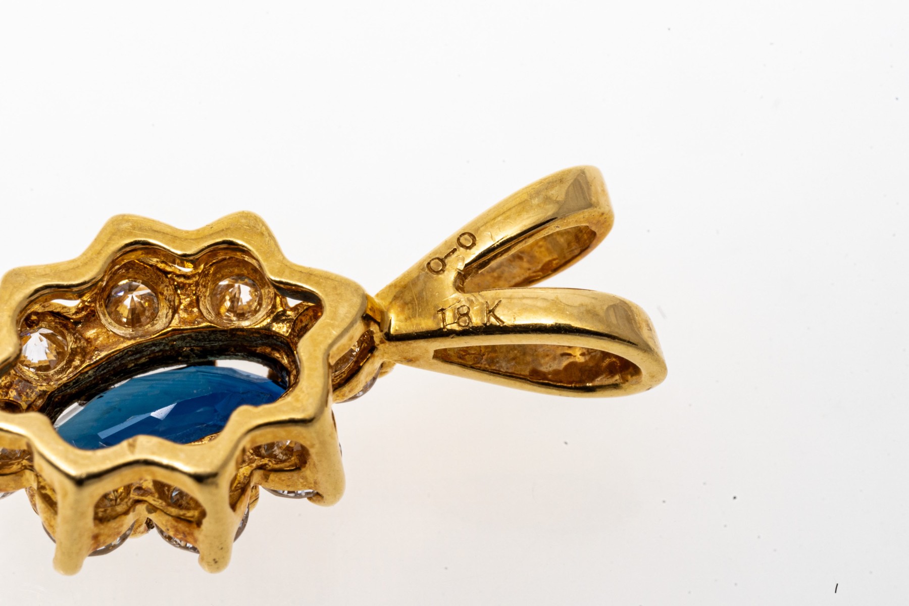 Sapphire and diamond set 18K yellow gold pendant. A marques cut synthetic sapphire is set within a halo of round brilliant cut diamonds. The diamonds are approximately 0.45 TCW. Split style bale.